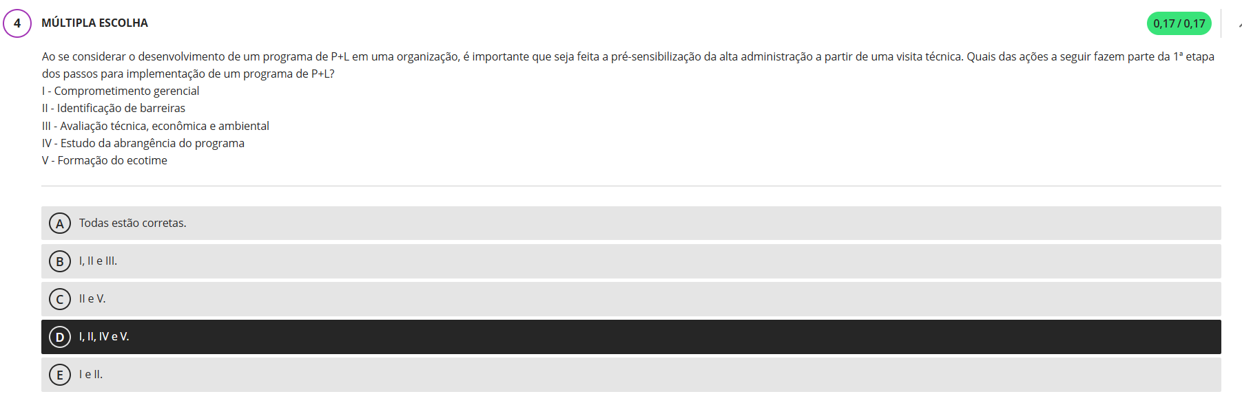 4 MÚLTIPLA ESCOLHA 0,17/0,17 Ao se considerar O desenvolvimento de um programa de P+L em uma organização, é importante que seja feita a pré-sensibilização da alta administração a partir de uma visita técnica. Quais das ações a seguir fazem parte da etapa dos passos para implementação de um programa de P+L? Comprometimento gerencial II - Identificação de barreiras III Avaliação técnica, econômica e ambiental IV Estudo da abrangência do programa V Formação do ecotime A Todas estão corretas. B I, III. D E II.