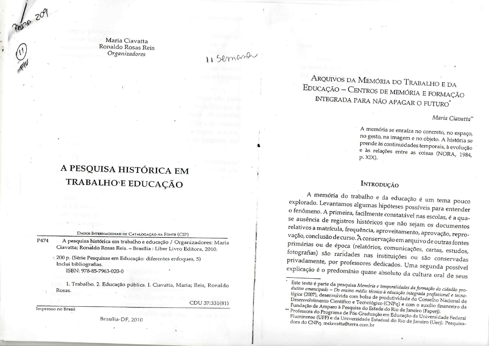209 Maria Ciavatta Ronaldo Rosas Reis Organizadores 11 ARQUIVOS DA MEMÓRIA DO TRABALHO E DA EDUCAÇÃO CENTROS DE MEMÓRIA E FORMAÇÃO INTEGRADA PARA NÃO APAGAR O Maria Ciavatta" A memória se enraíza no concreto, no espaço, no gesto, na imagem e no objeto. A história se prende às continuidades temporais, à evolução e às relações entre as coisas (NORA, 1984, XIX). A PESQUISA HISTÓRICA EM EDUCAÇÃO INTRODUÇÃO A memória do trabalho e da educação é um tema pouco explorado. Levantamos algumas hipóteses possíveis para entender o fenômeno. A primeira, facilmente constatável nas escolas, é a qua- se ausência de registros históricos que não sejam documentos relativos a matrícula, frequência, aproveitamento, aprovação, repro- DADOS DE CATALOGAÇÃO NA FONTE (CIP) vação, conclusão de curso. conservação em arquivo de outras fontes P474 A pesquisa histórica em trabalho e educação / Organizadores: Maria primárias ou de época (relatórios, comunicações, cartas, estudos, Ciavatta; Ronaldo Rosas Reis. - Brasília Liber Livro Editora, 2010. fotografias) são raridades nas instituições ou são conservadas 200 P. (Série Pesquisas em Educação: diferentes enfoques, 5) privadamente, por professores dedicados. Uma segunda possível Inclui bibliografias. explicação é o predomínio quase absoluto da cultura oral de seus ISBN: 978-85-7963-020-0 1. Trabalho. 2. Educação pública. Ciavatta, Maria; Reis, Ronaldo Este texto é parte da pesquisa Memória e temporalidades da formação do cidadão dutivo emancipado Do ensino médio técnico à educação integrada profissional e tecno- pro- Rosas. lógica (2007), desenvolvida com bolsa de produtividade do Conselho Nacional de Desenvolvimento Científico e Tecnológico (CNPq) e com o auxílio financeiro da CDU 37:331(81) Fundação de Amparo à Pesquisa do Estado do Rio de Janeiro (Faperj). Impresso no Brasil ** Professora do Programa de Pós-Graduação em Educação da Universidade Federal Fluminense (UFF) e da Universidade Estadual do Rio de Janeiro (Uerj). Pesquisa- Brasília-DF, 2010 dora do CNPq. mciavatta@terra.com.br16 A Pesquisa Histórica em Trabalho e Educação Arquivos da memória do trabalho e da educação centros de memória e formação... 17 principais protagonistas, os professores. "Nossos documentos são tramento para o trabalho simples, para as atividades funcionais da as nossas aulas", nos respondeu uma antiga professora, quando produção? buscávamos fontes documentais em sua escola. A carência de tempo, Nesse sentido, queremos mostrar como o recorte histórico de espaço, de recursos financeiros e humanos especializados para o do tema da pesquisa sobre formação integrada ampliou o universo trabalho de arquivo e, também, a tradição das gerações sem história própria, de uma sociedade colonizada e autoritária, nos subtraíram dos participantes para a organização de um centro de memória em suas escolas. O texto será desenvolvido através dos seguintes o gosto e o cultivo da memória. aspectos: a historicidade do conceito de formação integrada e as lutas Mas as lutas políticas renascem sempre, porque são parte em sua defesa; a escola e o trabalho como lugares de memória e da cultura e das aspirações dos grupos e dos sujeitos sociais que as de identidade; e o desdobramento da pesquisa em centros de empreenderam. Elas permanecem como um substrato de memória memória. nos lugares de sua gênese, sempre passíveis de brotar e de renascer Do ponto de vista metodológico, trabalhamos a história como nas novas conjunturas da vida social. Locais, espaços, eventos, processo e a história como método, no sentido de que a história é a comemorações e sofrimentos tornam-se lugares de memória que produção da existência dos homens em sociedade. Sua compreensão, alimentam o presente e a perspectiva de suas lutas. no nível do discurso historiográfico, se faz considerando as Os anos 1980 foram marcados por lutas pela redemocratização mediações que constituem os diferentes fenômenos da vida social do País e em defesa da educação na Constituição e na nova LDB. Um (LABASTIDA, 1983). Essa referência fundamental permite resgatar dos temas, que mobilizou um conjunto de educadores em defesa a historicidade do conceito de formação integrada (CIAVATTA, da escola pública, foi a inclusão da educação politécnica no ensino 2005), as lutas para sua introdução no ensino médio técnico e a médio profissionalizante. Essa questão retornou nos anos 1990, com organização e o significado da criação de um centro de memória. a defesa da formação integrada entre as disciplinas de formação Complementarmente, trabalhamos com o conceito de memória e geral e a educação profissional, separadas na estrutura do ensino "lugar de memória" (POLLACK, 1989, 1992; NORA, 1984). Do médio técnico, pelo Decreto 2.208/97. Defendia-se sua revogação, ponto de vista das fontes, baseamo-nos na constituição dos acervos o que veio a ocorrer com a aprovação do Decreto 5.154/2004, que documentais a partir da atividade de pesquisa e da organização de revogou o anterior, recuperou a força da Lei de Diretrizes e Bases dois centros de memória (CIAVATTA; CAMPELLO, 2006; ROSA, da Educação (Lei 9.394/97), permitindo às instituições de ensino 2006, 2007; SILVEIRA, 2005, 2006). técnico de nível médio a volta ao ensino médio integrado à educação profissional. A HISTORICIDADE DO CONCEITO DE FORMAÇÃO INTEGRADA Com isso, refaz-se um caminho latente na educação brasileira, NOS EMBATES POLÍTICO-PEDAGÓGICOS uma memória negada, mas não apagada, uma história que, nos anos 1980, reiterou a vitória das forças conservadoras sobre a luta pela Criam-se, continuamente, novos termos, novas palavras, seja emancipação de toda a sociedade. Que tipo de educação se deve dar para expressar novas realidades engendradas pela vida social, seja à população: um ensino de qualidade com 