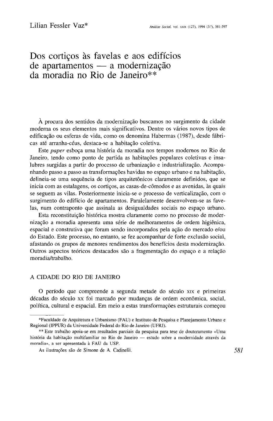 Lilian Fessler Vaz* Análise Social, vol. xxix (127), 1994 (3.°), 581-597 Dos cortiços às favelas e aos edifícios de apartamentos — a modernização da moradia no Rio de Janeiro** À procura dos sentidos da modernização buscamos no surgimento da cidade moderna os seus elementos mais significativos. Dentre os vários novos tipos de edificação ou esferas de vida, como os denomina Habermas (1987), desde fábri- cas até arranha-céus, destaca-se a habitação coletiva. Este paper esboça uma história da moradia nos tempos modernos no Rio de Janeiro, tendo como ponto de partida as habitações populares coletivas e insa- lubres surgidas a partir do processo de urbanização e industrialização. Acompa- nhando passo a passo as transformações havidas no espaço urbano e na habitação, delineia-se uma sequência de tipos arquitetônicos claramente definidos, que se inicia com as estalagens, os cortiços, as casas-de-cômodos e as avenidas, às quais se seguem as vilas. Posteriormente inicia-se o processo de verticalização, com o surgimento do edifício de apartamentos. Paralelamente desenvolvem-se as fave- las, num contraponto que assinala as desigualdades sociais no espaço urbano. Esta reconstituição histórica mostra claramente como no processo de moder- nização a moradia apresenta uma série de melhoramentos de ordem higiénica, espacial e construtiva que foram sendo incorporados pela ação do mercado e/ou do Estado. Este processo, no entanto, se fez acompanhar de forte exclusão social, afastando os grupos de menores rendimentos dos benefícios desta modernização. Outros aspectos teóricos destacados são a fragmentação do espaço e a relação moradia/trabalho. A CIDADE DO RIO DE JANEIRO O período que compreende a segunda metade do século xix e primeiras décadas do século xx foi marcado por mudanças de ordem económica, social, política, cultural e espacial. Em meio a estas transformações estruturais começou *Faculdade de Arquitetura e Urbanismo (FAU) e Instituto de Pesquisa e Planejamento Urbano e Regional (IPPUR) da Universidade Federal do Rio de Janeiro (UFRJ). ** Este trabalho apoia-se em resultados parciais da pesquisa para tese de doutoramento «Uma história da habitação multifamiliar no Rio de Janeiro — estudo sobre a modernidade através da moradia», a ser apresentada à FAU da USP. As ilustrações são de Simone de A. Cadinelli. 581 Lilian Fessler Vaz a emergir da pequena cidade comercial com feição colonial uma cidade industrial com aspectos de moderna metrópole capitalista. Ressaltam nesta transição a substituição do trabalho escravo pelo assala- riado, a formação de mercados e a mercantilização de bens, inclusive a moradia e o trabalho, a decadência da cafeicultura fluminense, o desenvolvimento dos setores secundário e terciário da economia, a definição de novas categorias so- ciais e a substituição de elites no poder, com a queda do império e a proclamação da República1. O crescimento demográfico foi intenso: a população aumentou de 235 000 habitantes em 1870 para 522 000 em 1890. Foram criados modernos serviços públicos: sistemas de transporte coletivo (bondes puxados a burro e estradas de ferro), de esgoto, de abastecimento de água, telégrafo, iluminação a gás, telefone, energia elétrica, etc. A implantação de alguns destes sistemas, como as redes de água e de esgoto e os meios de transporte coletivo são exemplos em que se percebe a exclusão conectada à modernização. Não somente o fornecimento de água, a eliminação dos dejetos e todo tipo de deslocamento de cargas e passageiros era executada pelo braço escravo, mas, como lembra Reis Filho (1978), toda a produção e o consumo da cidade (e da casa) se apoiavam sobre a força de trabalho escrava. No país que se modernizava, este trabalho não foi somente substituído pelo trabalho assala- riado, mas pelas inovações tecnológicas que impunham redução numérica, maior qualificação e disciplina da força de trabalho empregada. À medida que carris de ferro rodaram sobre trilhos e que água e esgoto fluíram através de tubos e canos de ferro, os escravos foram dispensados junto com liteiras, carroças, baldes e barris. Muitos «tigres2», aguadeiros, carregadores e carroceiros foram postos à margem da economia urbana, excluídos pela modernização. Estes trabalhadores aumentavam o contingente de escravos, libertos e imi- grantes nacionais e estrangeiros que, chegando à cidade à procura de meios de sobrevivência, buscavam a área central, onde se concentravam moradia e traba- lho e fervilhava a vida urbana. Nesta época a estrutura urbana se resumia na aglomeração de atividades e populações no núcleo; só lentamente os transportes coletivos viabilizariam a expansão e o espaço começaria a se especializar, defi- nindo áreas centrais (comerciais), residenciais e industriais. Em resposta à crise habitacional que se agravava, foi no centro que se multiplicaram as moradias possíveis para esta população: as habitações coletivas. HABITAÇÕES COLETIVAS INSALUBRES A necessidade de moradias baratas para trabalhadores, a limitada disponibi- lidade de construções para atender a esta demanda, os altos aluguéis, a possibi- lidade de obtenção de bons rendimentos por parte dos privilegiados proprietários 1 A escravidão foi abolida em 1888 e a República foi proclamada em 1889. 582 2 Denominação dos escravos carregadores de dejetos. A modernização da moradia no Rio de Janeiro e arrendatários de prédios e terrenos são fatores que fizeram com que se multi- plicassem estas moradias. As estalagens eram grupos de minúsculas casas térreas enfileiradas — os quartos ou casinhas —, de dimensões, compartimentos e demais elementos re- duzidos ao extremo, que surgiram por volta de 1850. As casas-de-alugar- -cômodos, ou casas-de-cômodos, eram casas subdivididas internamente que se multiplicaram no período republicano. Esta