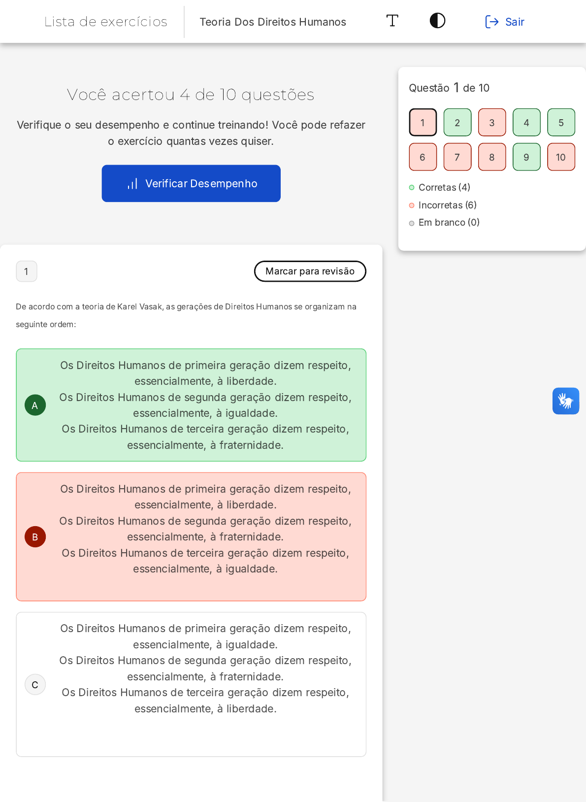 Você acertou 4 de 10 questões Verifique o seu desempenho e continue treinando! Você pode refazer o exercício quantas vezes quiser. Verificar Desempenho A B C 1 Marcar para revisão De acordo com a teoria de Karel Vasak, as gerações de Direitos Humanos se organizam na seguinte ordem: Os Direitos Humanos de primeira geração dizem respeito, essencialmente, à liberdade. Os Direitos Humanos de segunda geração dizem respeito, essencialmente, à igualdade. Os Direitos Humanos de terceira geração dizem respeito, essencialmente, à fraternidade. Os Direitos Humanos de primeira geração dizem respeito, essencialmente, à liberdade. Os Direitos Humanos de segunda geração dizem respeito, essencialmente, à fraternidade. Os Direitos Humanos de terceira geração dizem respeito, essencialmente, à igualdade. Os Direitos Humanos de primeira geração dizem respeito, essencialmente, à igualdade. Os Direitos Humanos de segunda geração dizem respeito, essencialmente, à fraternidade. Os Direitos Humanos de terceira geração dizem respeito, essencialmente, à liberdade. Questão 1 de 10 Corretas �4� Incorretas �6� Em branco �0� 1 2 3 4 5 6 7 8 9 10 Lista de exercícios Teoria Dos Direitos Humanos Sair D E Os Direitos Humanos de primeira geração dizem respeito, essencialmente, à igualdade. Os Direitos Humanos de segunda geração dizem respeito, essencialmente, à liberdade. Os Direitos Humanos de terceira geração dizem respeito, essencialmente, à fraternidade. Os Direitos Humanos de primeira geração dizem respeito, essencialmente, à fraternidade. Os Direitos Humanos de segunda geração dizem respeito, essencialmente, à igualdade. Os Direitos Humanos de terceira geração dizem respeito, essencialmente, à liberdade. Resposta incorreta Opa! A alternativa correta é a letra A. Confira o gabarito comentado! Gabarito Comentado De acordo com o site POLITIZE, em 1979, Vasak apresentou em uma palestra sua teoria geracional cuja base são os princípios da Revolução Francesa: liberdade, igualdade e fraternidade. Esses três conceitos são utilizados para dividir, de forma didática, os direitos humanos em três perspectivas históricas de entendimento. Através da teoria geracional de Vasak é possível, portanto, distribuir os direitos humanos em: primeira geração (liberdade), segunda geração (igualdade) e terceira geração (fraternidade). A PRIMEIRA GERAÇÃO �LIBERDADE) tem como elemento principal a ideia clássica de liberdade individual, concentrada nos direitos civis e políticos. Esses direitos só poderiam ser conquistados mediante a abstenção do controle do Estado, já que sua atuação interfere na liberdade do indivíduo. A SEGUNDA GERAÇÃO �IGUALDADE) traz a concepção de Estado de Bem-Estar Social. Surge de uma necessidade do Estado garantir direitos de oportunidade iguais a todos os cidadãos, através de políticas públicas como acesso básico à saúde, educação, habitação, trabalho, lazer, entre outros. A TERCEIRA GERAÇÃO �FRATERNIDADE�, tem como a principal preocupação os direitos difusos e coletivos. Os direitos dessa nova geração são considerados transindividuais, pois só podem A B C D E ser exigidos em ações coletivas, já que seu exercício está condicionado à existência de um grupo determinado ou não de pessoas. Alcançar esses interesses beneficia a todos e sua violação também afeta a todos. https://www.politize.com.br/tres-geracoes-dos-direitos- humanos/ 2 Marcar para revisão �COSEAC/2019 � Adaptada) Os direitos humanos são dotados de características próprias. A que implica o reconhecimento de que os direitos humanos não se perdem pela passagem do tempo, é a: Imprescritibilidade. Irrenunciabilidade. Inalienabilidade. Indivisibilidade. Relatividade. Resposta correta Parabéns, você selecionou a alternativa correta. Confira o gabarito comentado! Gabarito Comentado A característica que implica o reconhecimento de que os direitos humanos não se perdem com a passagem do tempo é a imprescritibilidade. Isso significa que, independentemente do tempo que passe, os direitos humanos não podem ser perdidos ou deixar de ser aplicados. A segurança formal do Direito no tempo não afeta os Direitos Humanos, pois o bem jurídico protegido supera o decurso temporal formal. É importante ressaltar que o titular do direito violado ou ameaçado deve ser A B C D E diligente em sua ação do Poder Judiciário, mas não há que se falar em prescrição. 3 Marcar para revisão O Princípio da Dignidade da Pessoa Humana: É um referencial importante para os Direitos Humanos, mas não para os Direitos Fundamentais. É um princípio fundamental da República Federativa do Brasil, intrinsecamente ligado aos Direitos Humanos e Direitos Fundamentais. Nenhuma relação tem com os Direitos Humanos. Apenas tem impacto nos Direitos Fundamentais. Não tem mais aplicação no Brasil, que segue apenas os Direitos Humanos. Resposta incorreta Opa! A alternativa correta é a letra B. Confira o gabarito comentado! Gabarito Comentado O Princípio da Dignidade da Pessoa Humana é um dos pilares fundamentais da República Federativa do Brasil, conforme estabelecido na Constituição Federal de 1988 (art. 1º, III�. Este princípio está intrinsecamente ligado tanto aos Direitos Humanos quanto aos Direitos Fundamentais, servindo como base jusnaturalista para ambos. Sua importância é tal que foi positivado com status significativo no Brasil, reforçando seu papel como referencial essencial na garantia e promoção dos direitos e liberdades individuais e coletivas. A B C D E 4 Marcar para revisão É correto afirmar que o Estado pode praticar violações de Direitos Humanos? Não, pois ele tem o dever de proteger e servir. Não, pois os agentes do Estado estão impedidos por lei de violar Direitos Humanos. Sim, pois no exercício de suas funções pode haver ilegalidades e abusos aos direitos e liberdades individuais, por exemplo. Sim