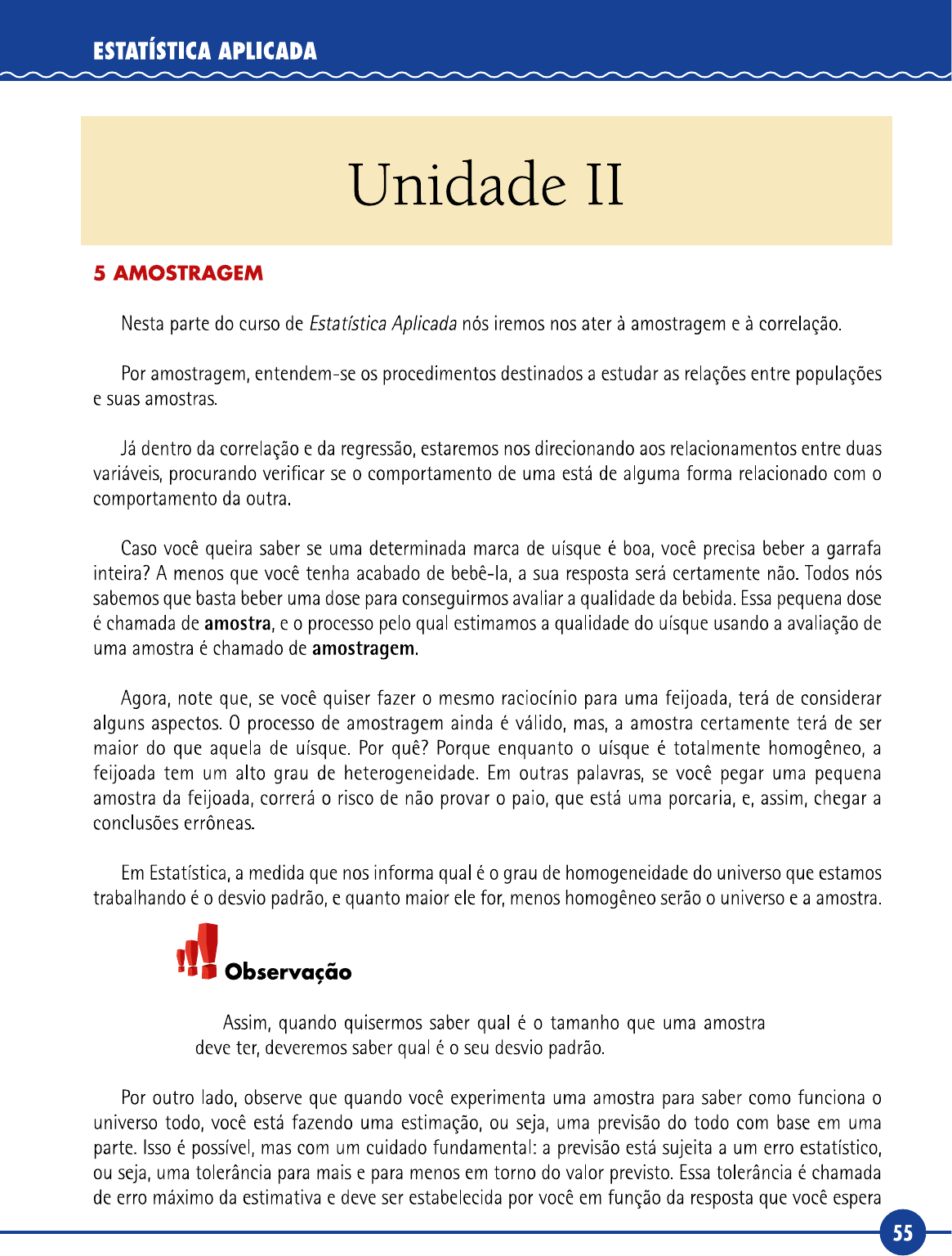 ESTATÍSTICA APLICADA Unidade II 5 AMOSTRAGEM Nesta parte do curso de Estatística Aplicada nós iremos nos ater à amostragem e à correlação. Por amostragem, entendem-se procedimentos destinados a estudar as relações entre populações e suas amostras. Já dentro da correlação e da regressão, estaremos nos direcionando aos relacionamentos entre duas variáveis, procurando verificar se 0 comportamento de uma está de alguma forma relacionado com 0 comportamento da outra. Caso você queira saber se uma determinada marca de uísque é boa, você precisa beber a garrafa inteira? A menos que você tenha acabado de bebê-la, a sua resposta será certamente não. Todos nós sabemos que basta beber uma dose para conseguirmos avaliar a qualidade da bebida. Essa pequena dose é chamada de amostra, e 0 processo pelo qual estimamos a qualidade do uísque usando a avaliação de uma amostra é chamado de amostragem. Agora, note que, se você quiser fazer 0 mesmo raciocínio para uma feijoada, terá de considerar alguns aspectos. 0 processo de amostragem ainda é válido, mas, a amostra certamente terá de ser maior do que aquela de uísque. Por quê? Porque enquanto 0 uísque é totalmente homogêneo, a feijoada tem um alto grau de heterogeneidade. Em outras palavras, se você pegar uma pequena amostra da feijoada, correrá 0 risco de não provar 0 paio, que está uma porcaria, e, assim, chegar a conclusões errôneas. Em Estatística, a medida que nos informa qual é 0 grau de homogeneidade do universo que estamos trabalhando é 0 desvio padrão, e quanto maior ele for, menos homogêneo serão 0 universo e a amostra. Observação Assim, quando quisermos saber qual é 0 tamanho que uma amostra deve ter, deveremos saber qual é 0 seu desvio padrão. Por outro lado, observe que quando você experimenta uma amostra para saber como funciona 0 universo todo, você está fazendo uma estimação, ou seja, uma previsão do todo com base em uma parte. Isso é possível, mas com um cuidado fundamental: a previsão está sujeita a um erro estatístico, ou seja, uma tolerância para mais e para menos em torno do valor previsto. Essa tolerância é chamada de erro máximo da estimativa e deve ser estabelecida por você em função da resposta que você espera 55Unidade II obter. Note que quanto menor for 0 erro que você está disposto a aceitar, maior vai ser 0 tamanho da amostra que terá de ser colhida, ou seja, mais cara será sua amostragem. Observação Assim, quando quisermos saber qual é 0 tamanho que uma amostra deve ter, deveremos estabelecer qual é 0 erro máximo esperado. Por fim, você terá que notar de essa sua estimativa merece certa confiança de sua parte, ou seja, 0 quanto você acredita que ela está certa. Lembre-se de que, se você quiser ter 100% de confiança, terá de pagar por isso. A amostra ficará grande e cara. Na maior parte das vezes, uma confiança de 90% ou 95% é suficientemente boa para podermos tomar uma decisão segura e coerente. Certamente você trabalhou com uma confiança muito menor quando decidiu pedir a mão daquela garota bonita ou aceitou pedido de casamento daquele galante rapaz! Observação Assim, quando quisermos saber qual é 0 tamanho que uma amostra deve ter, deveremos estabelecer qual é 0 nível de confiança com que devemos trabalhar. Observação Note, portanto, que grande parte de nossas preocupações no processo de amostragem é a determinação do tamanho das amostras. Amostragem, fundamentalmente, é 0 processo de colher amostras e estudá-las, determinando suas medidas estatísticas, e, a partir desse estudo, induzir os parâmetros populacionais. Quando falamos que estamos estimando um parâmetro estatístico, queremos dizer que a partir do conhecimento de uma medida estatística iremos prever 0 valor da medida (parâmetro) populacional. Por exemplo, suponha que tenhamos escolhido aleatoriamente 100 alunos de Estatística, dentro de uma população de 1.000 estudantes, coletado as notas de cada um, e encontrado a média dessas notas. Suponha que essa média tenha sido 5,6. É lógico supor, em princípio, que a média de todos 1.000 alunos de Estatística também seja igual a 5,6. Para diferenciarmos as duas informações, iremos utilizar simbologia diferente para as medidas estatísticas e para os parâmetros populacionais. Assim, diríamos que, para a amostra de 100 alunos, a média é X = 5,6 e que para a população de 1.000 estudantes a média estimada é = 5,6. As medidas estatísticas são simbolizadas por letras do nosso alfabeto, e os parâmetros estatísticos, por letras gregas. 56ESTATÍSTICA APLICADA Essa estimativa feita é chamada de estimativa por pontos e normalmente é preterida em favor das estimativas por intervalos, que indicam a precisão ou a exatidão. As estimativas por intervalos são dadas por dois números obtidos pela introdução do conceito de erro estatístico. Assim, seria preferível apresentar a estimativa que acabamos de apresentar da seguinte maneira: 0 valor estimado para a média dos 100 estudantes mencionados é de 5,6±0,2, ou seja, a média será um valor entre 5,4 e 5,8. 0 valor 0,2 é 0 erro esperado nessa estimativa. Os cálculos envolvendo essas estimativas serão mostrados a seguir. Inicialmente, vamos verificar como selecionamos as amostras. A generalização dos dados de uma amostra para uma população deve atender a uma condição básica e imprescindível: a amostra deve ser representativa da população, ou seja, devemos garantir que a probabilidade de se encontrar determinados elementos numa população seja a mesma na amostra. Isso significa que características importantes devem ser mantidas proporcionais na amostra e na população. Por exemplo, se 0 gênero é importante em determinado estudo e sabemos que 48% da população são formados por homens, então, nas amostras, deveremos ter 48% de homens. Uma amostra de 500 elementos deverá ter obrigatoriamente 240 homens. Essas amostras