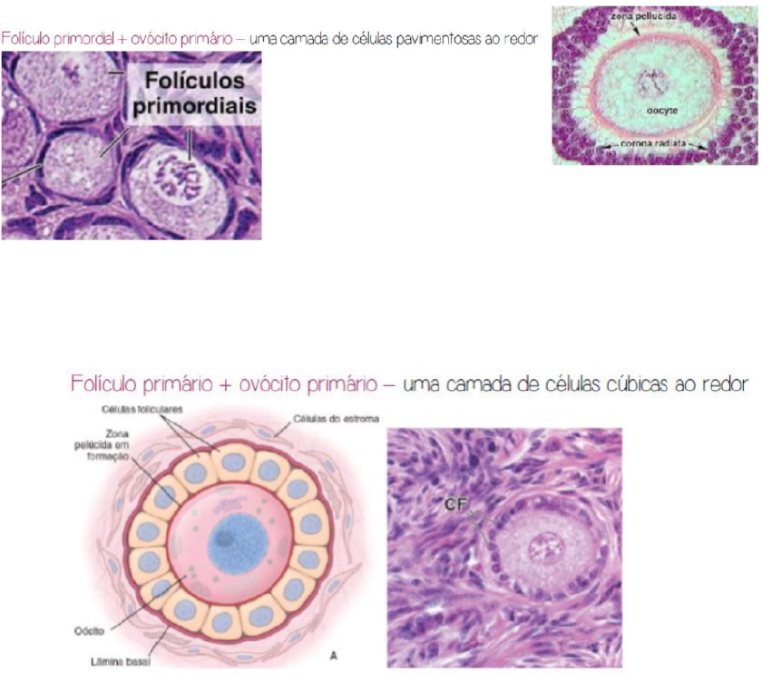Estudo para a prova de ginecologia e obstetrícia Aula 01 – Fecundação e clivagem -Estágios dos folículos ovarianos: 1) Folículos primordiais: são abundantes e já formados na vida embrionária, localizado no córtex do ovário, composto por um ovócito primário desenvolvido por uma única camada de células foliculares achatadas (camada de células da pré -granulosa), sendo considerados o reservatório de gametas durante toda a vida reprodutiva da fêmea mamífera. 2) Folículos primários: é constituído por um ovócito em crescimento (primário), circundado por uma camada de células da granulosa em formato cuboide com zona pelúcida em formação ainda. 3) Folículos secundários: caracterizado por um ovócito inteiramente circundado por uma zona pelúcida e a presença de pelo menos duas camadas de células da granulosa com formato cúbico. 4) Folículos terciários ou antrais: constituído por um ovócito circundado pela zona pelúcida, os espaços em branco das células foliculares da foto anterior se juntam, formando agora o antro folicular 5) Folículo de Graaf ou pré ovulatório: O oócito se encontra rodeado por uma camada de células granulosas (ou foliculares) que formam a corona radiata, o restante das células foliculares forma agora a parede do antro. É possível ver também as células da teca. ↪Células da teca: Durante as modificações que ocorrem nos folículos, o estroma situado em sua volta se modifica formando as tecas. • Teca interna: Secretam esteroides (testosterona) que é transportada para a zona granulosa e as células da granulosa sob a influência do FSH sintetizam a testosterona a transformando em estrogênio. • Teca externa: São semelhantes ao estroma ovariano, porém se arranjam de forma organizada e concêntrica ao redor do folículo ↪Células da granulosa: também chamadas de células foliculares, rodeiam o oócito. São responsáveis pela secreção de progesterona • Mesmo após a formação da pelúcida, o oócito permanece conectado à zona granulosa através de junções “gap” ou comunicantes, isso favorece sub stratos para o oócito se desenvolver. • Junções gap são destruídas com o pico de LH, transformando o oócito primário em secundário ↪Folículo atrésico: folículos que iniciam seu desenvolvimento, porém não chegam a evolução, sofrendo morte celular. Pode ocorrer em qualquer estágio em processo de degeneração ↪Ovulação: Consiste na liberação do oócito rompendo a parede do folículo. É estimulada por um pico LH como resposta aos altos níveis de estrógeno liberados pelos folículos ovarianos em crescimento ↪Corpo hemorrágico: É um “coágulo” formado pela ruptura da parede do folículo. Não está presente em ovinos e aves e dura pouco, se transformando em seguida no corpo lúteo ↪Corpo lúteo: Estrutura “amarelada” que secreta progesterona (ajuda a manter a gravidez e regular ciclo), formado pelas células da granulosa e da teca. Quando não há gestação, ele sofre regressão, restando em seu lugar uma cicatriz de tecido conjuntivo (corpo albicans) ↪Corpo albicans: Cicatriz de tecido conjuntivo (“branco”) - As células da teca têm receptor para o hormônio LH e quando o LH atua nelas, elas produzem o hormônio testosterona, e se difundem para dentro das células da granulosa, e rapidamente convertem a testosterona em estrógeno. Somente nessa fase antral que o folículo responde ao hormônio LH e FSH, ele responde por conta dos receptores. O pico de LH faz o folículo voltar a meiose e ovular. A fêmeas geralmente ovulam o ovócito secundário, exceto cadela e água que ovulam ovócito primário e então demora para sair do estágio e com isso pode demorar uns 3-5 dias do ovócito maturando na tuba uterina para ser fertilizada. As células da teca produzem testosterona e as células da granulosa se transformam em estrógeno. Com o pico de LH o folículo estoura e libera o gameta e as células da granulosa e da teca se transformam (luteinizam) e viram um corpo lúteo, que produz progesterona, mas se não emprenhar, ele morre e vira o corpo albicans. Teca produz testosterona, granulosa transforma a testosterona em estrógeno. ↪Zona pelúcida - A zona pelúcida é uma película que envolve o óvulo e é composta por duas camadas, uma externa, mais espessa, e outra interna, mais fina e com característica elástica. Ela protege o óvulo, sendo formada por três glicoproteínas (ZP1, ZP2 e ZP3) a partir de secreções do próprio óvulo e por células foliculares do ovário. Entre elas tem poros (junções gaps) com projeções citoplasmáticas. As células da granulosa que produzem substâncias e bloqueiam o ovócito na prófase 1 e com o pico de LH, as junções gap se desfazem e o ovócito retoma a meiose. Formação do Gameta Masculino - Os gametas masculinos são produzidos nos testículos, mas especificamente nos túbulos seminíferos. As espermatogônias são transformadas em espermatócitos primários, as maiores células germinativas nos túbulos seminíferos dos testículos. Cada espermatócito primário sofre, em seguida, uma divisão reducional – a primeira divisão meiótica – para formar dois espermatócitos secundários haploides, que possuem aproximadamente metade do tamanho do espermatócito primário. Em seguida, os espermatócitos secundários sofrem a segunda divisão meiótica para formar quatro espermátides haploides, que são aproximadamente a metade do tamanho dos espermatócitos secundários. As espermátides (células em estágio avançado de desenvolvimento) são transformadas gradualmente em quatro espermatozoides maduros pelo processo conhecido como espermatogênese. Células de Sertoli – (piramidais – ficam mais interna em volta do gameta) servem como células de suporte para as demais células germinativas, se estendendo até a última linhagem (espermatozoides). Além disso, favorecem a espermatogênese com aporte nutricional e