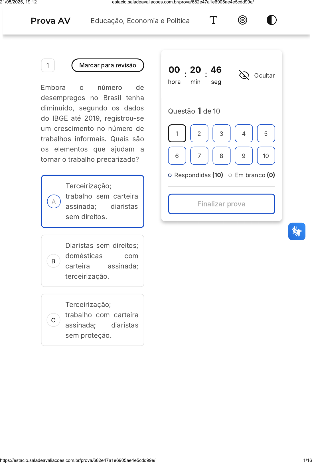 A B C 1 Marcar para revisão Embora o número de desempregos no Brasil tenha diminuído, segundo os dados do IBGE até 2019, registrou-se um crescimento no número de trabalhos informais. Quais são os elementos que ajudam a tornar o trabalho precarizado? Terceirização; trabalho sem carteira assinada; diaristas sem direitos. Diaristas sem direitos; domésticas com carteira assinada; terceirização. Terceirização; trabalho com carteira assinada; diaristas sem proteção. 00 hora : 20 min : 46 seg Ocultar Questão 1 de 10 Respondidas (10) Em branco (0) Finalizar prova 1 2 3 4 5 6 7 8 9 10 Prova AV Educação, Economia e Política 21/05/2025, 19:12 estacio.saladeavaliacoes.com.br/prova/682e47a1e6905ae4e5cdd99e/ https://estacio.saladeavaliacoes.com.br/prova/682e47a1e6905ae4e5cdd99e/ 1/16 D E A B Terceirização; autônomos; trabalho com carteira assinada. Domésticas com direitos; trabalho sem carteira assinada; terceirização. 2 Marcar para revisão A história acumula muitos acontecimentos envolvendo as grandes navegações. O europeu com ênfase nos portugueses e espanhóis, muito tem a ver com os empreendimentos marítimos. O principal objetivo dos empreendimentos marítimos dos séculos XV e XVI era: Fazer a navegação ao redor do mundo passando por todos os oceanos. Descobrir e controlar uma rota marítima para as Índias para comprar especiarias diretamente na fonte e vender com elevados lucros na Europa. 21/05/2025, 19:12 estacio.saladeavaliacoes.com.br/prova/682e47a1e6905ae4e5cdd99e/ https://estacio.saladeavaliacoes.com.br/prova/682e47a1e6905ae4e5cdd99e/ 2/16 C D E Chegar até o extremo norte do continente americano para iniciar o povoamento da região. Estabelecer e controlar novas rotas marítimas para a Oceania com o objetivo de explorar os recursos minerais da região. Consolidar o poder sobre as rotas comerciais para o Oriente, que os europeus já dominavam há séculos. 3 Marcar para revisão O século XV é considerado o elo de ligação entre o fim da Idade Média e o início do Renascimento e da Idade Moderna. O século XVI está marcado na história da humanidade como o século de desenvolvimento e imposição da civilização ocidental. Quais os dois países que mais se destacaram no período das Grandes Navegações dos séculos XV e XVI? 21/05/2025, 19:12 estacio.saladeavaliacoes.com.br/prova/682e47a1e6905ae4e5cdd99e/ https://estacio.saladeavaliacoes.com.br/prova/682e47a1e6905ae4e5cdd99e/ 3/16 A B C D E Inglaterra e França. Holanda e Itália. Portugal e Espanha. Alemanha e Noruega. Espanha e Inglaterra. 4 Marcar para revisão Trabalho produtivo é aquele que gera valor econômico e produz bens materiais. Segundo Marx, o trabalho produtivo gera mais valor do que o valor pago em salários para o trabalhador, produzindo, assim, a mais- valia. Considerando esta afirmação, marque a alternativa correta. 21/05/2025, 19:12 estacio.saladeavaliacoes.com.br/prova/682e47a1e6905ae4e5cdd99e/ https://estacio.saladeavaliacoes.com.br/prova/682e47a1e6905ae4e5cdd99e/ 4/16 A B C Esse tipo de trabalho serve diretamente ao capital, mas não o valoriza totalmente, uma vez que os funcionários são assalariados e consomem parte da riqueza. Esse tipo de trabalho serve diretamente ao trabalhador como instrumento da sua autovalorização, pois é ele, enquanto produz, que gera a mais-valia. Esse tipo de trabalho serve diretamente ao capital como instrumento da sua autovalorização como meio para a produção de mais-valia. 21/05/2025, 19:12 estacio.saladeavaliacoes.com.br/prova/682e47a1e6905ae4e5cdd99e/ https://estacio.saladeavaliacoes.com.br/prova/682e47a1e6905ae4e5cdd99e/ 5/16 D E Esse tipo de trabalho não serve ao capital como instrumento da sua autovalorização, apenas como meio para a produção de mais-valia. Esse tipo de trabalho serve diretamente ao trabalhador, pois o valor de toda a produção é reconhecido através do salário. 5 Marcar para revisão A pandemia da covid-19 colocou em xeque valores fundamentais da cultura ocidental moderna. Assinale a alternativa que melhor apresenta esses valores. 21/05/2025, 19:12 estacio.saladeavaliacoes.com.br/prova/682e47a1e6905ae4e5cdd99e/ https://estacio.saladeavaliacoes.com.br/prova/682e47a1e6905ae4e5cdd99e/ 6/16 A B C Tratou-se do direito de proteção às crianças e aos adolescentes, pois o SARSCOV-19 é um vírus com grande potencial de contaminação em escolas e creches, o que paralisou o sistema de ensino em todos os países do mundo. Tratou-se do direito à alimentação, pois o SARSCOV-19 é um vírus transmitido exclusivamente pela alimentação, o que provocou situação de vulnerabilidade nutricional em todos os países do mundo. Tratou-se do direito à livre movimentação e à reunião, pois o SARSCOV-19 é um vírus transmitido pelo contato social, o que levou diversos governos a adotarem medidas de restrição de movimentação social. 21/05/2025, 19:12 estacio.saladeavaliacoes.com.br/prova/682e47a1e6905ae4e5cdd99e/ https://estacio.saladeavaliacoes.com.br/prova/682e47a1e6905ae4e5cdd99e/ 7/16 D E Tratou-se do direito à livre expressão de ideias, pois o SARSCOV-19 é um vírus transmitido pelo contato social, o que levou diversos governos a adotarem medidas de restrição de movimentação social. Tratou-se do direito ao acesso à saúde pública, pois o SARSCOV-19 foi utilizado como pretexto por empresas do setor de saúde para privatizar os serviços de saúde pública em diversos lugares do mundo. 6 Marcar para revisão Concurso MPE Analista - Área Economia 2012 (FGV) A respeito dos desdobramentos da crise financeira global de 2008/2009 sobre a economia brasileira, assinale a afirmativa correta. 21/05/2025, 19:12 estacio.saladeavaliacoes.com.br/prova/682e47a1e6905ae4e5cdd99e/ https://estacio.saladeavaliacoes.com.br/prova/682e47a1e6905ae4e5cdd99e/ 8/16 A B C Ocorreu um aumento da dívida pública em 2009 devido a diversos fatores como o crescimento continuado do gasto público. Realizou‐se uma desvalorização 
