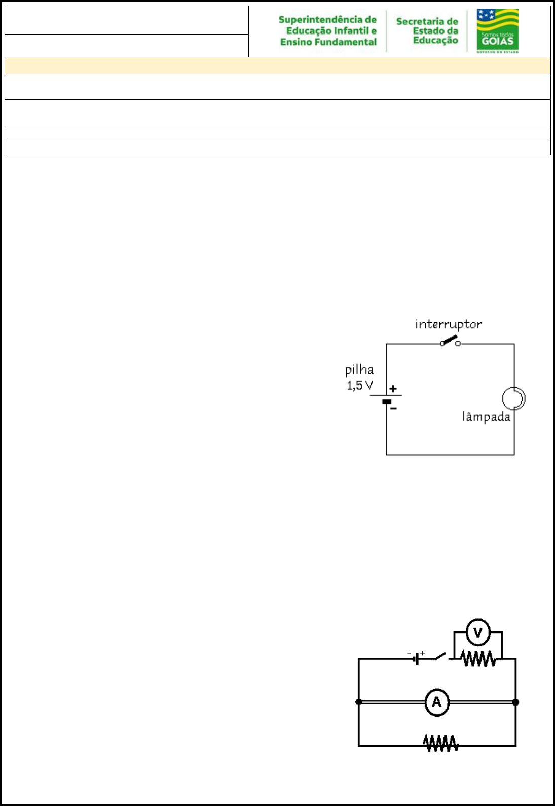 Circuitos Elétricos Um circuito elétrico é a ligação de elementos elétricos, tais como resistores, indutores, capacitores, diodos, linhas de transmissão, fontes de tensão, fontes de corrente e interruptores, de modo que formem pelo menos um caminho fechado para a corrente elétrica. Um circuito elétrico simples, alimentado por pilhas, baterias ou tomadas, sempre apresenta uma fonte de energia elétrica, um aparelho elétrico, fios ou placas de ligação e um interruptor para ligar e desligar o aparelho. Estando ligado, o circuito elétrico está fechado e uma corrente elétrica passa por ele. Esta corrente pode produzir vários efeitos, luz, movimentos, aquecimentos, sons etc. Circuitos elétricos são conjuntos formados por um gerador elétrico, um condutor em circuito fechado e um elemento capaz de utilizar a energia produzida pelo gerador. Um circuito elétrico simples, constituído com uma pilha, um interruptor e uma lâmpada. Neste caso: • A pilha é a fonte de energia; a lâmpada é o receptor de energia; • O interruptor não é considerado fonte nem receptor de energia, já que a sua função é apenas a de permitir ou interromper a passagem de corrente num circuito elétrico. • Quando a fonte se encontra corretamente ligada ao(s) receptores, diz-se que o circuito está fechado, caso contrário diz-se que está aberto. • Num condutor metálico, a corrente elétrica é explicada por um fluxo desordenado de elétrons que atravessam esse condutor. Disponível em: . Acesso em 27 de out. de 2020 (adaptada) Os circuitos elétricos são utilizados para ligar dispositivos elétricos e eletrônicos de acordo com suas especificações de funcionamento, referentes à tensão elétrica de operação e à corrente elétrica suportada pelo dispositivo. Além disso, são usados para distribuição da energia elétrica em residências e indústrias, conectando diversos dispositivos elétricos por meio de fios condutores, conectores e tomadas. De acordo com seus componentes básicos, um circuito elétrico pode desempenhar diversas funções: eliminar picos de corrente elétrica, que são prejudiciais para alguns aparelhos mais sensíveis; aumentar a tensão elétrica de entrada ou, até mesmo, abaixá-la; transformar uma corrente alternada em uma corrente contínua; aquecer algo, entre outras. Quando se aplica uma diferença de potencial em um circuito elétrico usando, por exemplo, uma pilha, os elétrons passam a fluir nesse circuito até que essa pilha descarregue por completo. Parte da energia de cada um desses elétrons é, então, captada e utilizada pelos diferentes elementos do circuito, transformando-a em diferentes formas de energia, como luz, som, movimento, calor etc. Os circuitos elétricos são representados por esquemas, que podem ser bastante complexos caso não saibamos identificar alguns de seus elementos básicos: ramos, malhas e nós. A figura ao lado, mostra um circuito elétrico não muito simples, contendo um gerador, resistores e aparelhos de medida (um voltímetro e um amperímetro) ligados em um circuito formado por três malhas, dois nós e quatro ramos. 8º ANO CIÊNCIAS DA NATUREZA ATIVIDADE 3 Tema: Matéria e Energia: Circuitos elétricos Habilidades Essenciais: (EF08CI02-C) Reconhecer um circuito elétrico, explicando a função de cada componente e diferenciando materiais condutores e não condutores. NOME: UNIDADE ESCOLAR: Disponível em: . Acesso em 27 de out. de 2020 (adaptada) Disponível em: . Acesso em 27 de out. de 2020 (adaptada) Entenda melhor o que são esses elementos: • Nós: pontos do circuito que ligam dois ou mais ramos. Nesses pontos, a corrente elétrica é sempre a mesma, antes e após sua passagem por eles. • Ramos: caminhos entre dois nós consecutivos. A corrente elétrica ao longo de um ramo é constante. • Malhas: caminhos fechados formados pelos ramos de um circuito, no qual pode haver malhas internas e externas. Elementos dos circuitos elétricos Resistores São dispositivos elétricos com alta resistência elétrica, isto é, opõem-se fortemente à passagem de corrente elétrica Essa classe de dispositivo é comumente usada em ferros de passar, chuveiros elétricos, churrasqueiras elétricas, aquecedores etc. Geradores São elementos responsáveis por fornecer energia para os circuitos elétricos. Quando ligamos os terminais de um gerador aos fios condutores de um circuito, forma-se uma diferença de potencial, que promove a movimentação dos elétrons Alguns exemplos de geradores de corrente contínua são as pilhas e baterias. Já as tomadas residenciais são geradores de correntes alternadas Chaves ou interruptores São dispositivos de segurança que servem para “abrir” ou “fechar” um circuito, podendo permitir ou interromper o fluxo de corrente elétrica. Fusíveis São dispositivos de segurança que interrompem a passagem de corrente elétrica nos circuitos caso exceda uma margem de segurança. Os fusíveis mais comuns são produzidos com uma liga metálica de baixo ponto de fusão. Quando atravessadas por grandes correntes elétricas, essas ligas metálicas derretem, interrompendo o circuito. Capacitores São utilizados para o armazenamento de cargas elétricas em um circuito. Esses dispositivos são capazes de reter grandes quantidades de cargas elétricas, liberando-as rapidamente quando solicitados. Por isso, são muito utilizados em circuitos que necessitam de grandes correntes elétricas para operarem corretamente. Receptores São dispositivos que transformam a energia elétrica presente em um circuito em outras formas de energia, como a energia cinética. O que difere um receptor de um resistor é que este transforma a energia elétrica exclusivamente em calor. Televisores, computadores, lâmpadas e caixas de som são exemplos de receptores. Disponível em: . Acesso em 27 de out. de 2020 (adaptada) Os circuitos elétricos podem ter seus dispositivos associados em diferentes configurações. Quand