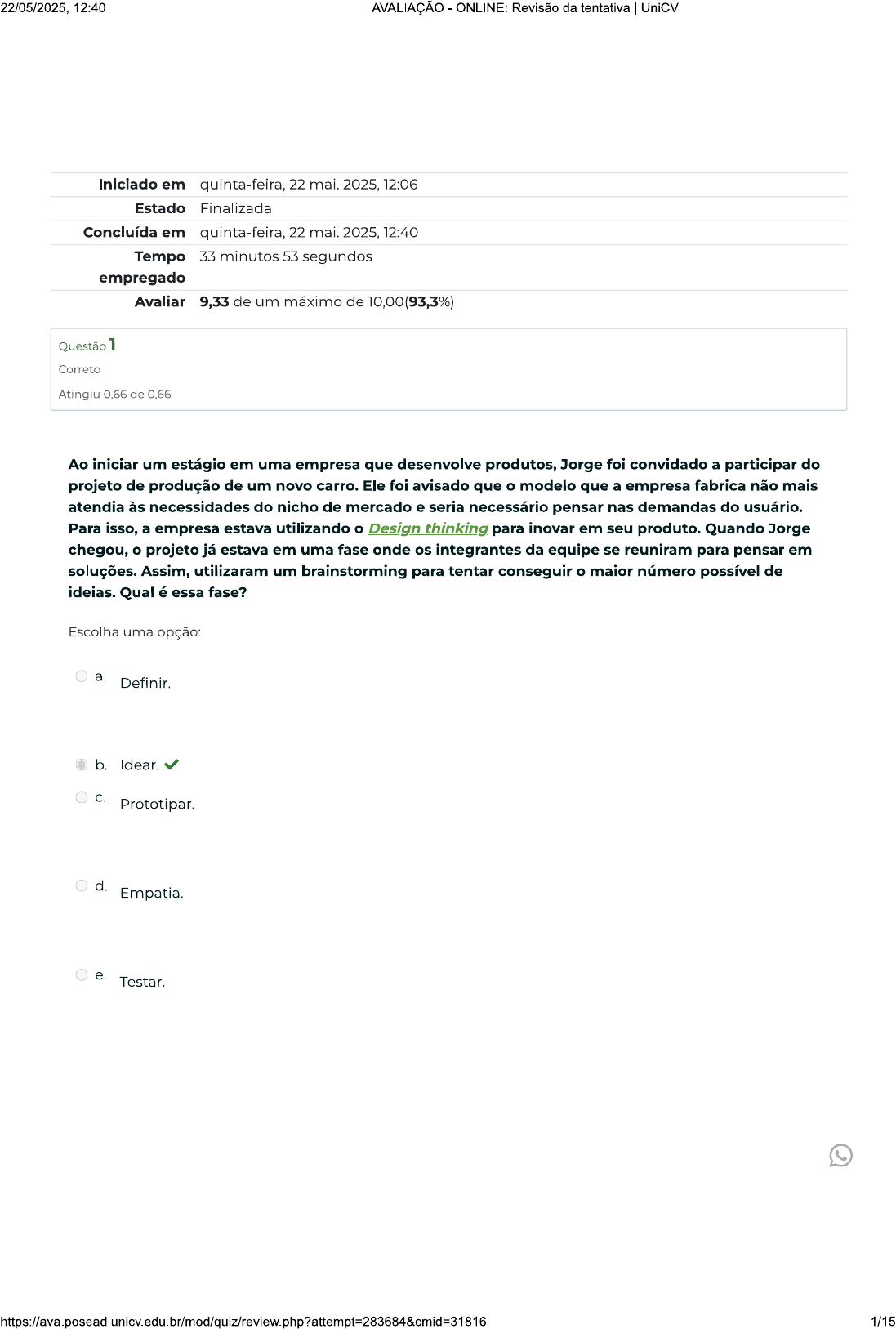 22/05/2025, 12:40 AVALIAÇÃO ONLINE: Revisão da tentativa UniCV Iniciado em quinta-feira, 22 mai. 2025, 12:06 Estado Finalizada Concluída em quinta-feira, 22 mai. 2025, 12:40 Tempo 33 minutos 53 segundos empregado Avaliar 9,33 de um máximo de 10,00(93,3%) Questão 1 Correto Atingiu 0,66 de 0,66 Ao iniciar um estágio em uma empresa que desenvolve produtos, Jorge foi convidado a participar do projeto de produção de um novo carro. Ele foi avisado que modelo que empresa fabrica não mais atendia às necessidades do nicho de mercado e seria necessário pensar nas demandas do usuário. Para isso, a empresa estava utilizando Design thinking para inovar em seu produto. Quando Jorge chegou, projeto já estava em uma fase onde os integrantes da equipe se reuniram para pensar em soluções. Assim, utilizaram um brainstorming para tentar conseguir maior número possível de ideias. Qual é essa fase? Escolha uma opção: a. Definir. b. Idear. C. Prototipar. d. Empatia. e. Testar. 1/1522/05/2025, 12:40 AVALIAÇÃO ONLINE: Revisão da tentativa UniCV Questão 2 Correto Atingiu 0,66 de 0,66 protótipo nos processos de inovação é muito usado no desenvolvimento de soluções inovadoras. Na criação protótipos, é possível realizar ajustes antes do lançamento, experimentar a recepção do público e assegurar mais eficácia e êxito na execução da proposta final (Trott, 2012). Sobre isso, avalie as seguintes asserções: I. Nas propostas de inovação, protótipo é um instrumento opcional e empegado somente para exibir produto. II. Prototipar permite reduzir incertezas e testar soluções junto ao público-alvo antes da implementação final. III. Protótipos de baixa fidelidade são suficientes para validar todas as etapas de um projeto inovador, sem a necessidade de modelos mais complexos. É verdadeiro que se afirma em: Escolha uma opção: a. II, apenas. b. I, e III. C. e III, apenas. d. I, apenas. e. le II, apenas. 2/1522/05/2025, 12:40 AVALIAÇÃO ONLINE: Revisão da tentativa UniCV Questão 3 Correto Atingiu 0,67 de 0,67 brainstorm é uma técnica na qual há uma condução, geralmente em grupo, em que a criatividade será estimulada. Os participantes poderão lançar as suas ideias livremente. Considerando que brainstorm tem se mostrado como uma técnica muito eficiente no processo criativo, como pode ser conduzido? Escolha uma opção: a. Um processo de brainstorm bem conduzido deve iniciar pela indicação de como as ideias devem fluir, assim como destacar em um quadro aquilo que for sendo dito e não fizer sentido. b. Para que alcance um melhor resultado, a condução de um brainstorm deve considerar um lugar agradável, propor que os participantes sentem em cículo, utilizar quadros e pincéis, evitar uso de celulares. C. brainstorm, para ser efetivo, deverá permitir que as pessoas presentes lancem suas ideias e disputem por elas, isso cria um ambiente competitivo que permitirá encontrar a solução ideal. d. A boa condução de um processo de brainstorm deverá ter um mediador que centralize as ideias conforme aquilo que julgar mais adequado para a resolução do problema posto. e. Há quatro etapas que devem ser seguida para a boa condução de um processo de brainstorm: jogo linguístico, desmanche de frases, a metamorfose total do objeto e a analogia inusual. 3/1522/05/2025, 12:40 AVALIAÇÃO ONLINE: Revisão da tentativa UniCV Questão 4 Correto Atingiu 0,66 de 0,66 A compreensão do problema no Design Thinking é refinada em várias etapas, alinhadas entre si, porém não linearmente. Isso assim ocorre para facilitar processo de avaliação das diversas alternativas que podem surgir em cada etapa. Design Thinking é uma abordagem que se apoia em três pilares para desenvolver uma solução inovadora advinda de um problema complexo. Com base nesses pilares, qual alternativa apresenta conceito correto de empatia dentro do projeto de design? Escolha uma opção: a. A empatia é a capacidade de trabalhar em grupos. Nos processos de design, é importante a colaboração para que se possa desenvolver uma solução inovadora, utilizando-se - ferramentas de co-criação. b. A empatia é a capacidade de se construir protótipos que possam apresentar a solução inovadora desenvolvida nos projetos de design. Para isso, utilizam-se materiais que possam ser experimentados e dar vida ao conceito, testá-lo e aprová-lo. C. A empatia é a capacidade de trabalhar em grupo. É a competência que vai ajudar a construir protótipo e apresentar a solução inovadora desenvolvida no processo de design. d. A empatia é a capacidade de se colocar no lugar do outro. Nos processos de design, ela é desenvolvida do início ao fim, utilizando-se ferramentas que possam entender as dores e desejos dos usuários. e. A empatia é a capacidade de se colocar no lugar do outro. Dessa forma, nos processos de design, é necessário ter equipes multidisciplinares que coloquem seus pontos de vista e concordem em todas as perspectivas da solução, caso contrário não se pode inovar. 4/1522/05/2025, 12:40 AVALIAÇÃO ONLINE: Revisão da tentativa UniCV Questão 5 Correto Atingiu 0,67 de 0,67 Um dos principais benefícios do modelo de cinco estágios do design thinking é a maneira pela qual conhecimento adquirido nos estágios posteriores pode retornar aos estágios anteriores. As informações são usadas continuamente para informar a compreensão do problema e dos espaços de solução e para redefinir o(s) problema(s). É correto afirmar que: Escolha uma opção: a. design permite um contínuo aprimoramento da solução ou do negócio. b. design impede que produto final ou resultado seja atingido em pouco tempo. C. design thinking não ajuda na solução de problemas. d. design thinking é um modelo que não se adapta em diferentes cenários. e. design thinking gera custos altos, pois não tem fim. 5/1522/05/2025, 12:40 AVALIAÇÃO ONLINE: Revisão da tentativa UniCV Questão 6 Correto Atingiu 0,67 de 