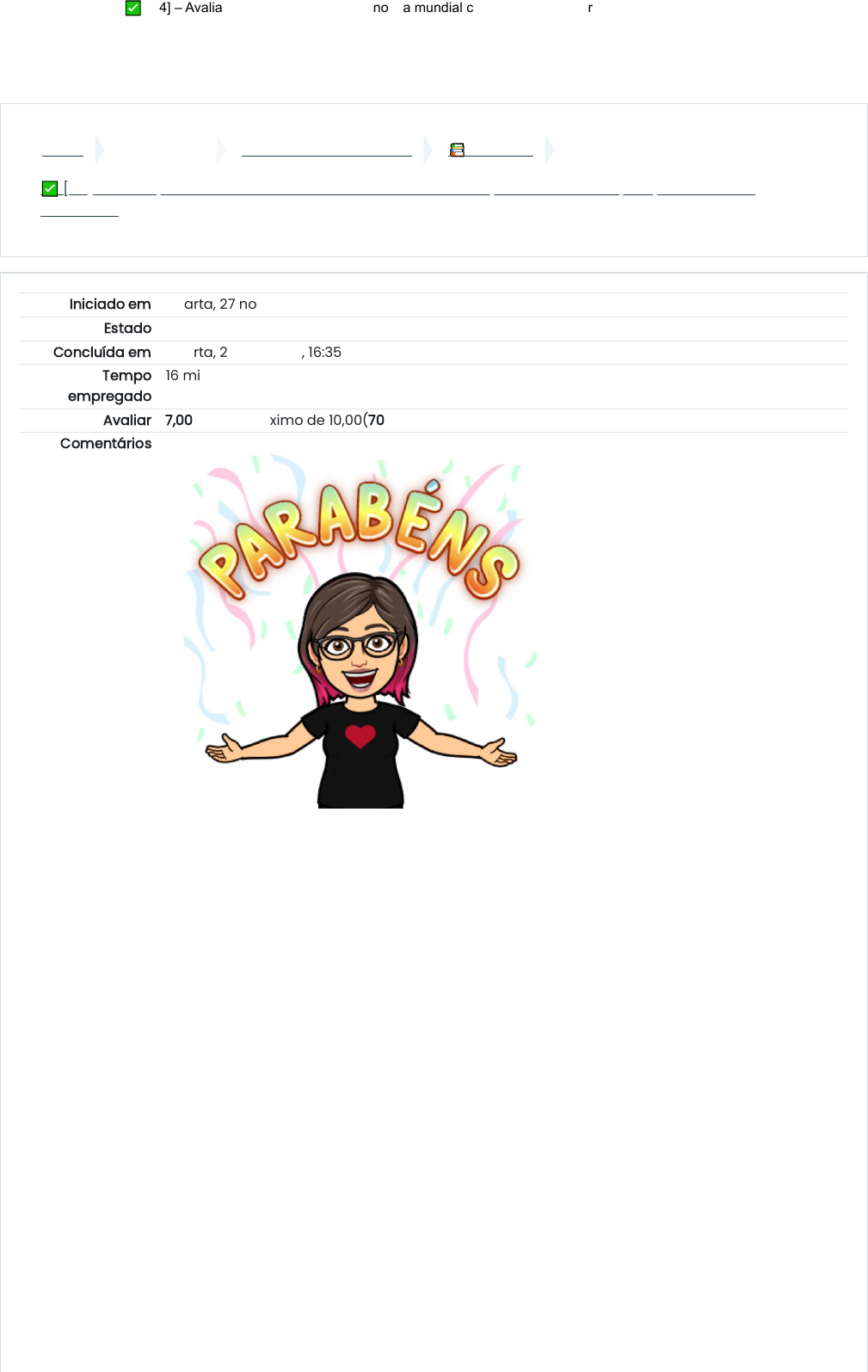 Painel Meus cursos 32010001497-T01-2024-2 📚 Módulo 4 ✅ [A4] – Avaliação do Módulo 4 – A economia mundial contemporânea: estrutura, conjuntura atual e tendências Iniciado em quarta, 27 nov 2024, 16:19 Estado Finalizada Concluída em quarta, 27 nov 2024, 16:35 Tempo empregado 16 minutos 27 segundos Avaliar 7,00 de um máximo de 10,00(70%) Comentários 20/12/2024, 11:50 ✅ [A4] – Avaliação do Módulo 4 – A economia mundial contemporânea: estrutura, conjuntura atual e tendências: Revisão da… https://ava.ufms.br/mod/quiz/review.php?attempt=1210292&cmid=846483 1/7 https://ava.ufms.br/my/ https://ava.ufms.br/course/view.php?id=60692 https://ava.ufms.br/course/view.php?id=60692#section-5 https://ava.ufms.br/mod/quiz/view.php?id=846483 Questão 1 Correto Atingiu 1,00 de 1,00 Questão 2 Correto Atingiu 1,00 de 1,00 Segundo o que foi apresentado por Vasconcellos (2015), nas leituras obrigatórias do Módulo 04 (A economia mundial contemporânea: estrutura, conjuntura atual e tendências), assinale a alternativa que contém os julgamentos corretos (verdadeiro ou falso), das afirmações a seguir, sobre bancos: ( ) Banco emissor: responsável e possui o monopólio das emissões de moeda ( ) Banco dos bancos: órgão em que os bancos depositam seus fundos e transferem fundos entre os bancos ( ) Banco do governo: canal utilizado pelo governo para implementar a política monetária. ( ) Banco depositário das reservas internacionais: responsável pela defesa da moeda do país, administração do câmbio, e reservas de divisas internacionais a. F; F; V; V b. V; V; F; F c. V; V; V; V d. V; F; F; V e. V; F; F; F Sua resposta está correta. A resposta correta é: V; V; V; V Segundo o que foi apresentado na vídeo aula 1 do módulo 4 (Renda nacional e crescimento econômico), assinale a alternativa correta sobre o PIB per capita: a. Nos mostra o desenvolvimento econômico de um país b. Nos mostra o ponto de equilíbrio entre oferta e demanda de um bem c. Nos mostra o quando de bem estar social cada pessoa possui d. Nos mostra a renda e despesa do indivíduo médio e. Nos mostra o valor da moeda ao longo do tempo Sua resposta está correta. A resposta correta é: Nos mostra a renda e despesa do indivíduo médio 20/12/2024, 11:50 ✅ [A4] – Avaliação do Módulo 4 – A economia mundial contemporânea: estrutura, conjuntura atual e tendências: Revisão da… https://ava.ufms.br/mod/quiz/review.php?attempt=1210292&cmid=846483 2/7 Questão 3 Correto Atingiu 1,00 de 1,00 Questão 4 Incorreto Atingiu 0,00 de 1,00 Segundo o que foi apresentado na vídeo aula 1 do módulo 4 (Moeda e Sistema Monetário), assinale a alternativa que contém as funções da moeda: a. Controle de impostos, unidade de conta e reserva de valor b. Meio de troca, unidade de conta e controle de impostos c. Reserva de valor, mecanismo de juros e controle de impostos d. Meio de troca, unidade de conta e reserva de valor e. Meio de troca, reserva de valor e mecanismo de juros Sua resposta está correta. A resposta correta é: Meio de troca, unidade de conta e reserva de valor Assinale a alternativa que contém os julgamentos corretos (verdadeiro ou falso), das afirmações a seguir, sobre o capital humano e físico: ( ) O capital humano tem sido o centro dos argumentos para o progresso econômico ( ) O capital humano é caracterizado como o valor do ganho de renda potencial incorporado nos indivíduos ( ) O capital físico tem sido, sempre, o foco das explicações para o progresso econômico ( ) O capital físico é caracterizado como o valor do ganho de renda incorporado nos indivíduos a. V; F; F; V b. V; F; F; F c. F; F; V; V d. V; V; F; F e. F; V; V; F Sua resposta está incorreta. A resposta correta é: F; V; V; F 20/12/2024, 11:50 ✅ [A4] – Avaliação do Módulo 4 – A economia mundial contemporânea: estrutura, conjuntura atual e tendências: Revisão da… https://ava.ufms.br/mod/quiz/review.php?attempt=1210292&cmid=846483 3/7 Questão 5 Correto Atingiu 1,00 de 1,00 Questão 6 Incorreto Atingiu 0,00 de 1,00 Segundo o que foi apresentado por Vasconcellos (2015), nas leituras obrigatórias do Módulo 04 (A economia mundial contemporânea: estrutura, conjuntura atual e tendências), assinale a alternativa que apresenta, corretamente, do que trata a Política Fiscal: a. Refere-se à política de investimento em educação e segurança pública b. É a política que trata do valor da moeda nacional frente às demais moedas utilizadas no mundo c. Refere-se aos instrumentos que o governo possui para a arrecadação de tributos e controle das despesas d. É a política que trata da compra de insumos para o crescimento da produção nacional e. Refere-se aos instrumentos que o governo possui para geração de tributos Sua resposta está correta. A resposta correta é: Refere-se aos instrumentos que o governo possui para a arrecadação de tributos e controle das despesas Segundo o que foi apresentado por Vasconcellos (2015), nas leituras obrigatórias do Módulo 04 (A economia mundial contemporânea: estrutura, conjuntura atual e tendências), assinale a alternativa que representa as questões de curto prazo da teoria macroeconômica: a. Renda e inflação b. Renda e aumento na produção c. Desemprego e renda d. Inflação e desemprego e. Mercado e oferta Sua resposta está incorreta. A resposta correta é: Inflação e desemprego 20/12/2024, 11:50 ✅ [A4] – Avaliação do Módulo 4 – A economia mundial contemporânea: estrutura, conjuntura atual e tendências: Revisão da… https://ava.ufms.br/mod/quiz/review.php?attempt=1210292&cmid=846483 4/7 Questão 7 Correto Atingiu 1,00 de 1,00 Questão 8 Correto Atingiu 1,00 de 1,00 Segundo o que foi apresentado por Vasconcellos (2015), nas leituras obrigatórias do Módulo 04 (A economia mundial contemporânea: estrutura, conjuntura atual e tendências), assinale a alternativa que não representa um dos estágios do desenvolvimento, segundo a Teoria de Etapas