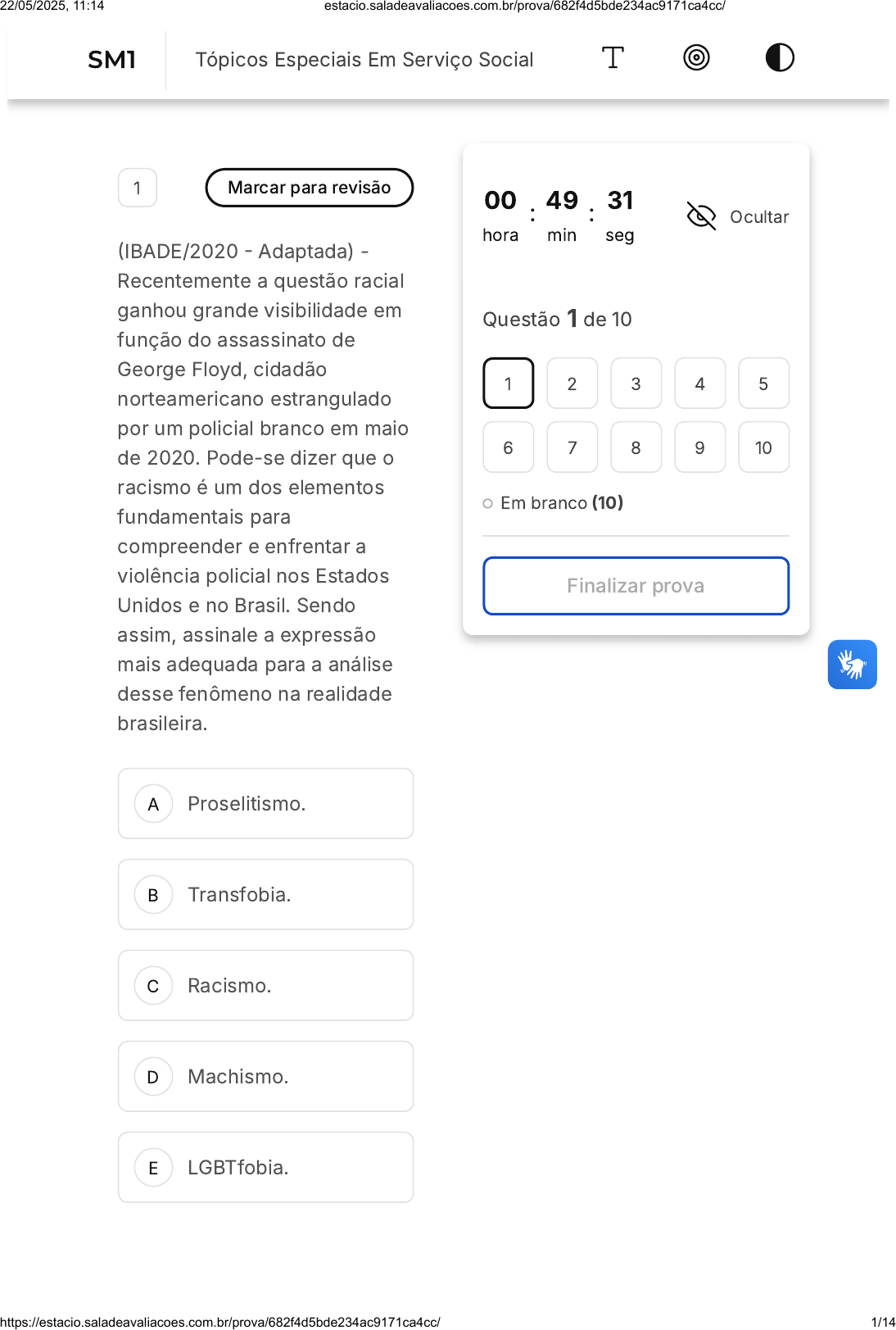 A B C D E 1 Marcar para revisão (IBADE/2020 - Adaptada) - Recentemente a questão racial ganhou grande visibilidade em função do assassinato de George Floyd, cidadão norteamericano estrangulado por um policial branco em maio de 2020. Pode-se dizer que o racismo é um dos elementos fundamentais para compreender e enfrentar a violência policial nos Estados Unidos e no Brasil. Sendo assim, assinale a expressão mais adequada para a análise desse fenômeno na realidade brasileira. Proselitismo. Transfobia. Racismo. Machismo. LGBTfobia. 00 hora : 49 min : 31 seg Ocultar Questão 1 de 10 Em branco (10) Finalizar prova 1 2 3 4 5 6 7 8 9 10 SM1 Tópicos Especiais Em Serviço Social 22/05/2025, 11:14 estacio.saladeavaliacoes.com.br/prova/682f4d5bde234ac9171ca4cc/ https://estacio.saladeavaliacoes.com.br/prova/682f4d5bde234ac9171ca4cc/ 1/14 2 Marcar para revisão A pobreza, a miséria e todas as mazelas sociais ocasionadas pela exploração capitalista possuem um recorte racial, de gênero e de orientação sexual. Isso equivale a dizer que a pobreza e a negação dos direitos sociais e humanos ainda são mais agudas em relação às mulheres, aos negros e à comunidade LGBTQUIA+. Refletindo sobre a condição da mulher na sociedade brasileira, analise as afirmativas a seguir e, em seguida, assinale a alternativa correta. I. Gênero e raça se fundem e acirram ainda mais o contexto de desigualdade para as mulheres. II. As mulheres, sejam elas brancas ou negras, são inferiorizadas ainda quando desempenhem as mesmas funções. III. As mulheres negras ganham menos da metade dos salários dos homens brancos, sendo elas, ainda, a maior parcela de mães solo. IV. A desigualdade afeta os grupos sociais, mas no segmento das mulheres, específicos como as mulheres negras, esta questão já foi superada. 22/05/2025, 11:14 estacio.saladeavaliacoes.com.br/prova/682f4d5bde234ac9171ca4cc/ https://estacio.saladeavaliacoes.com.br/prova/682f4d5bde234ac9171ca4cc/ 2/14 A B C D E Somente as afirmativas I, II e IV estão corretas. Somente as afirmativas II, II e IV estão corretas. Somente as afirmativas I, II e III estão corretas. Somente as afirmativas I, III e IV estão corretas. Somente as afirmativas I e IV estão corretas. 3 Marcar para revisão O Brasil conta com uma legislação que definiu um marco regulatório de proteção e defesa dos direitos da pessoa idosa no Brasil. Segundo seu art. 20, "o idoso tem direito a educação, cultura, esporte, lazer, diversões, espetáculos, produtos e serviços que respeitem sua peculiar condição de idade". A lei a que se refere o texto é a(o): 22/05/2025, 11:14 estacio.saladeavaliacoes.com.br/prova/682f4d5bde234ac9171ca4cc/ https://estacio.saladeavaliacoes.com.br/prova/682f4d5bde234ac9171ca4cc/ 3/14 A B C D E Política Nacional do Idoso - 8.842/94. Estatuto da Pessoa com Deficiência - 13.146/2015. Estatuto do Idoso - 10.741/2003. Lei Maria da Penha - 11.340/2006. Lei do Feminicídio - 13.104/2015. 4 Marcar para revisão Esta lei significou um avanço na legislação brasileira por assegurar e promover, em condições de igualdade, o exercício dos direitos e das liberdades fundamentais por pessoa com deficiência, visando a sua inclusão social e cidadania. O artigo 35 da mesma determina como finalidade primordial das políticas públicas de trabalho e emprego promover e garantir condições de acesso e de permanência da pessoa com deficiência no campo de trabalho. Que lei é essa? 22/05/2025, 11:14 estacio.saladeavaliacoes.com.br/prova/682f4d5bde234ac9171ca4cc/ https://estacio.saladeavaliacoes.com.br/prova/682f4d5bde234ac9171ca4cc/ 4/14 A B C D E Consolidação das Leis do Trabalho. A Lei de Diretrizes e Bases da Educação. O Código de Defesa do Consumidor. A Lei de Responsabilidade Fiscal. O Estatuto da Pessoa com Deficiência. 5 Marcar para revisão A Música "Mulher", interpretada pela cantora de Elba Ramalho, álbum CD, Compilation, Record Music - RMCD 35, 2005 de autoria dos compositores Doug Wayne & Feio, em um de seus trechos, apresenta assim a mulher: Pra descrever uma mulher Não é do jeito que quiser Primeiro tem que ser sensível Se não, é impossível Quem ver, por fora, não vai ver Por dentro o que ela é É um risco tentar resumir Mulher Refletindo sobre a trajetória da luta pela implementação de 22/05/2025, 11:14 estacio.saladeavaliacoes.com.br/prova/682f4d5bde234ac9171ca4cc/ https://estacio.saladeavaliacoes.com.br/prova/682f4d5bde234ac9171ca4cc/ 5/14 A B políticas de defesa, respeito e valorização da mulher no Brasil, há indicadores que mostram os aspectos mais flagrantes da desigualdade entre homens e mulheres. Sobre eles é, correto afirmar que: I. há desigualdade salarial, mesmo que a mulher tenha o mesmo nível de formação ou superior ao dos homens. II. a responsabilidade pelas atividades domésticas, apesar dos indicadores de submissão da mulher, já é compartilhada igualmente entre homens e mulheres. III. a violência contra a mulher reflete no âmbito doméstico, e para além dele, uma vez que a desigualdade é produzida pela concepção e justificação de uma diferenciação sexual entre os gêneros. IV. há opressão, exploração e subordinação das mulheres em relação aos homens e, quando essas escapam do padrão imposto, são passíveis dos piores tipos de violências. Somente as afirmativas I, II e IV estão corretas. Somente as afirmativas I, II e III estão corretas. 22/05/2025, 11:14 estacio.saladeavaliacoes.com.br/prova/682f4d5bde234ac9171ca4cc/ https://estacio.saladeavaliacoes.com.br/prova/682f4d5bde234ac9171ca4cc/ 6/14 C D E Somente as afirmativas I, III e IV estão corretas. Somente as afirmativas II, III e IV estão corretas. Somente as afirmativas I e IV estão corretas. 6 Marcar para revisão Muitos discursos médicos, sociais, literários, jurídicos, dentre outros, perpassam a velhice e esses respaldam e cimentam muitas possibilidades que acabam por direcionar a esta fase da vida. O Serviço Soci