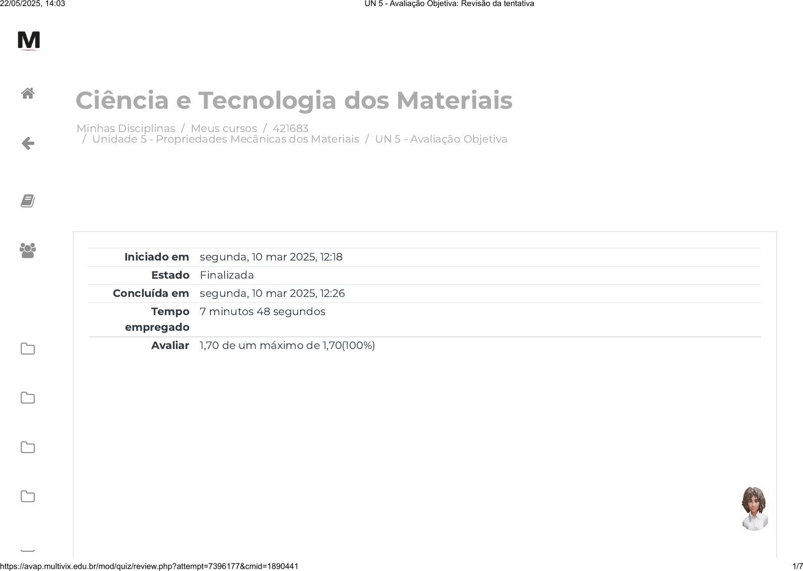 Minhas Disciplinas / Meus cursos / 421683 / Unidade 5 - Propriedades Mecânicas dos Materiais / UN 5 - Avaliação Objetiva Ciência e Tecnologia dos Materiais Iniciado em segunda, 10 mar 2025, 12:18 Estado Finalizada Concluída em segunda, 10 mar 2025, 12:26 Tempo empregado 7 minutos 48 segundos Avaliar 1,70 de um máximo de 1,70(100%) 22/05/2025, 14:03 UN 5 - Avaliação Objetiva: Revisão da tentativa https://avap.multivix.edu.br/mod/quiz/review.php?attempt=7396177&cmid=1890441 1/7 https://avap.multivix.edu.br/my/ https://avap.multivix.edu.br/course/view.php?id=33998 https://avap.multivix.edu.br/course/view.php?id=33998§ion=6 https://avap.multivix.edu.br/mod/quiz/view.php?id=1890441 https://avap.multivix.edu.br/my/ https://avap.multivix.edu.br/course/view.php?id=33998 https://avap.multivix.edu.br/user/index.php?id=33998 https://avap.multivix.edu.br/course/view.php?id=33998§ion=1 https://avap.multivix.edu.br/course/view.php?id=33998§ion=2 https://avap.multivix.edu.br/course/view.php?id=33998§ion=3 https://avap.multivix.edu.br/course/view.php?id=33998§ion=4 https://avap.multivix.edu.br/course/view.php?id=33998§ion=5 https://avap.multivix.edu.br/ https://avap.multivix.edu.br/ https://avap.multivix.edu.br/ https://avap.multivix.edu.br/ https://avap.multivix.edu.br/ https://avap.multivix.edu.br/ https://avap.multivix.edu.br/ https://avap.multivix.edu.br/ Questão 1 Correto Atingiu 0,34 de 0,34 Quando é aplicado o ensaio de tração, ocorre uma deformação no corpo de prova e, com isso, mede-se a variação no comprimento (Δl). Essa medição é feita com base na carga trativa (P). Além disso, no Sistema Internacional de Unidades (SI), utiliza-se como unidade de medida o newton (N) para a carga (P) e o metro (m) para a variação de comprimento (Δl). Depois, os resultados de (P) e (Δl) são transformados em grá�cos de tensão (σ) e deformação (ε). Sabendo disso, assinale a opção que aponta os conceitos de tensão e de deformação. Escolha uma opção: Tensão no esforço de �xação do corpo de prova; deformação longitudinal. Deformação por fadiga; alteração pela variação longitudinal do corpo de prova. Esforço de tração aplicado no corpo de prova; variação longitudinal do corpo de prova. Tração tangencial no ensaio; corpo de prova com deformação por tração. Esforço sofrido pela máquina; alteração geométrica do corpo de prova. 22/05/2025, 14:03 UN 5 - Avaliação Objetiva: Revisão da tentativa https://avap.multivix.edu.br/mod/quiz/review.php?attempt=7396177&cmid=1890441 2/7 https://avap.multivix.edu.br/ https://avap.multivix.edu.br/ https://avap.multivix.edu.br/ https://avap.multivix.edu.br/ https://avap.multivix.edu.br/ https://avap.multivix.edu.br/ https://avap.multivix.edu.br/ https://avap.multivix.edu.br/ Questão 2 Correto Atingiu 0,34 de 0,34 A utilização dos ensaios para a veri�cação da dureza é um meio de análise do material. Pode haver um comparativo entre a resistência que este oferece ao esforço e, com isso, ser possível identi�car as características de composição do material. A maior ou menor resistência, além de mostrar como está composto o corpo de prova, também pode identi�car a aplicação adequada do item. Algumas vezes, possuir maior ou menor dureza não signi�ca material de boa ou má qualidade. Isso porque as demandas variam muito, sendo também variável o quanto cada uma exigirá e como o material irá se comportar. Ante o exposto, responda: um ensaio que aponta elevada dureza em um material pode caracterizar quais qualidades em uma estrutura cristalina metálica, especi�camente? Escolha uma opção: Resistência à tração e ao cisalhamento. Resistência à corrosão e à tração tangencial. Resistência à compressão e à tração. Resistência à torção e à compressão. Resistência à abrasão e à compressão. 22/05/2025, 14:03 UN 5 - Avaliação Objetiva: Revisão da tentativa https://avap.multivix.edu.br/mod/quiz/review.php?attempt=7396177&cmid=1890441 3/7 https://avap.multivix.edu.br/ https://avap.multivix.edu.br/ https://avap.multivix.edu.br/ https://avap.multivix.edu.br/ https://avap.multivix.edu.br/ https://avap.multivix.edu.br/ https://avap.multivix.edu.br/ https://avap.multivix.edu.br/ Questão 3 Correto Atingiu 0,34 de 0,34 Quando da realização de um ensaio, pode haver variações, como em qualquer outra atividade que envolva questões operacionais não automatizadas. Essas variações, dependendo do grau, podem impactar fortemente nos resultados, portanto, toda atenção e cuidados na operação, calibração e manutenção do equipamento faz a diferença. Para um ensaio, são de�nidos alguns fatores relevantes que podem levar à dispersão das propriedades medidas nos materiais como resultado das possíveis variações de um ensaio a ser realizado, tanto nas propriedades mecânicas medidas quanto nas tensões de�nidas para aplicação pelo equipamento. As tensões de projeto, que, por sua vez, seguem a normativa sobre os ensaios se aplicam tanto para o corpo de prova quanto para o equipamento no que tange à determinação de tensões aplicadas, por exemplo. São regras que normalmente devem ser utilizadas para �ns de padronização do processo de ensaio. Assinale a opção que apresenta os cinco fatores de variabilidade dos resultados. Escolha uma opção: Método de ensaio, variações no alinhamento técnico do equipamento, in�uências do operador, calibração do dispositivo de ensaio e não homogeneidades na composição de uma amostra para outra. Preparação do corpo de prova, variações no procedimento de ensaio, in�uências do operador, calibração do dispositivo de ensaio e homogeneidades na estruturação atômica das amostras. Temperatura, variações no procedimento de fabricação dos corpos de prova, in�uências do operador, calibração do dispositivo de ensaio e homogeneidades na composição de uma amostra para outra. 22/05/2025, 14:03 UN 5