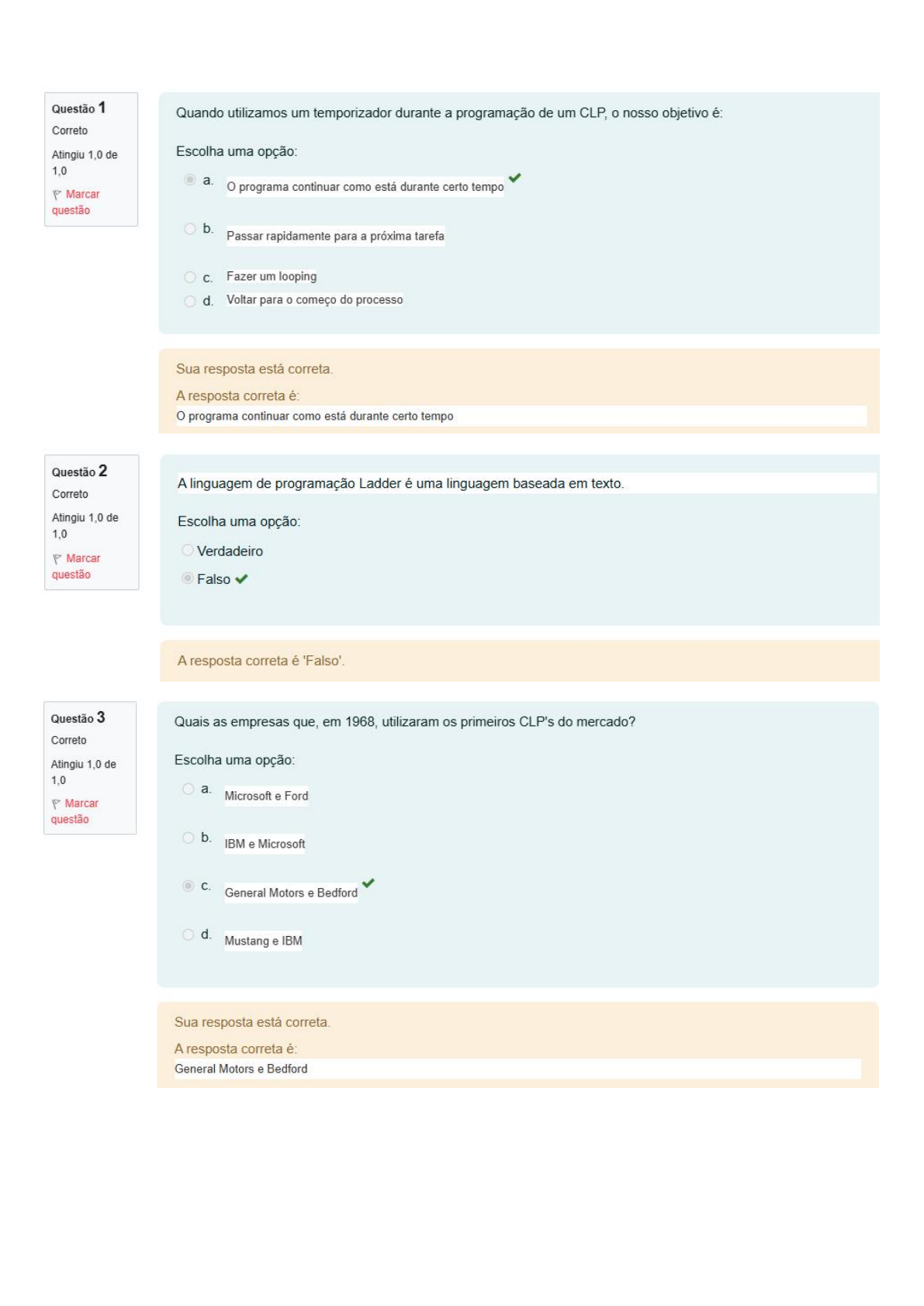 Questão 1 Quando utilizamos um temporizador durante a programação de um CLP, nosso objetivo é: Correto Atingiu 1,0 de Escolha uma opção: 1,0 a. 0 programa continuar como está durante certo tempo Marcar questão b. Passar rapidamente para a próxima tarefa C. Fazer um looping d. Voltar para começo do processo Sua resposta está correta. A resposta correta é: programa continuar como está durante certo tempo Questão 2 A linguagem de programação Ladder é uma linguagem baseada em texto. Correto Atingiu 1,0 de Escolha uma opção: 1,0 Verdadeiro P Marcar questão Falso A resposta correta é 'Falso'. Questão 3 Quais as empresas que, em 1968, utilizaram os primeiros CLP's do mercado? Correto Atingiu 1,0 de Escolha uma opção: 1,0 a. Microsoft e Ford P Marcar questão b. IBM e Microsoft C. General Motors e Bedford d. Mustang e IBM Sua resposta está correta. A resposta correta é: General Motors e BedfordQuestão 4 Qual a quantidade de pontos de entrada e saída (I/O) existem em um CLP de Médio porte? Correto Atingiu 1,0 de Escolha uma opção: 1,0 a. 256 pontos Marcar questão b. A quantidade de pontos é escalável C. 16 pontos d. 128 pontos Sua resposta está correta. A resposta correta é: 256 pontos Questão 5 que significa a sigla CLP? Correto Atingiu 1,0 de 1,0 Escolha uma opção: Marcar questão a. Controlador Lógico Puritano b. Controlador Lógico Programável C. Controle Ligado a Programação d. Controle Ligado ao Provável Sua resposta está correta. A resposta correta é: Controlador Lógico ProgramávelQuestão 6 que significa a sigla IHM? Correto Atingiu 1,0 de Escolha uma opção: 1,0 a. Interferência Homônima Maquinária P Marcar questão b. Interconexão Homem-Máquina C. Interface Homem-Máquina d. Interface Humana Sua resposta está correta. A resposta correta é: Interface Homem-Máquina Questão 7 As linguagens de programação podem ser textuais ou gráficas, qual das alternativas abaixo nos dá uma linguagem Correto de cada tipo? Atingiu 1,0 de 1,0 Escolha uma opção: P Marcar a. questão Blocos de Função e Ladder b. Lista de Instruções e Texto estruturado C. Lista de Instruções e Ladder Sua resposta está correta. A resposta correta é: Lista de Instruções e Ladder