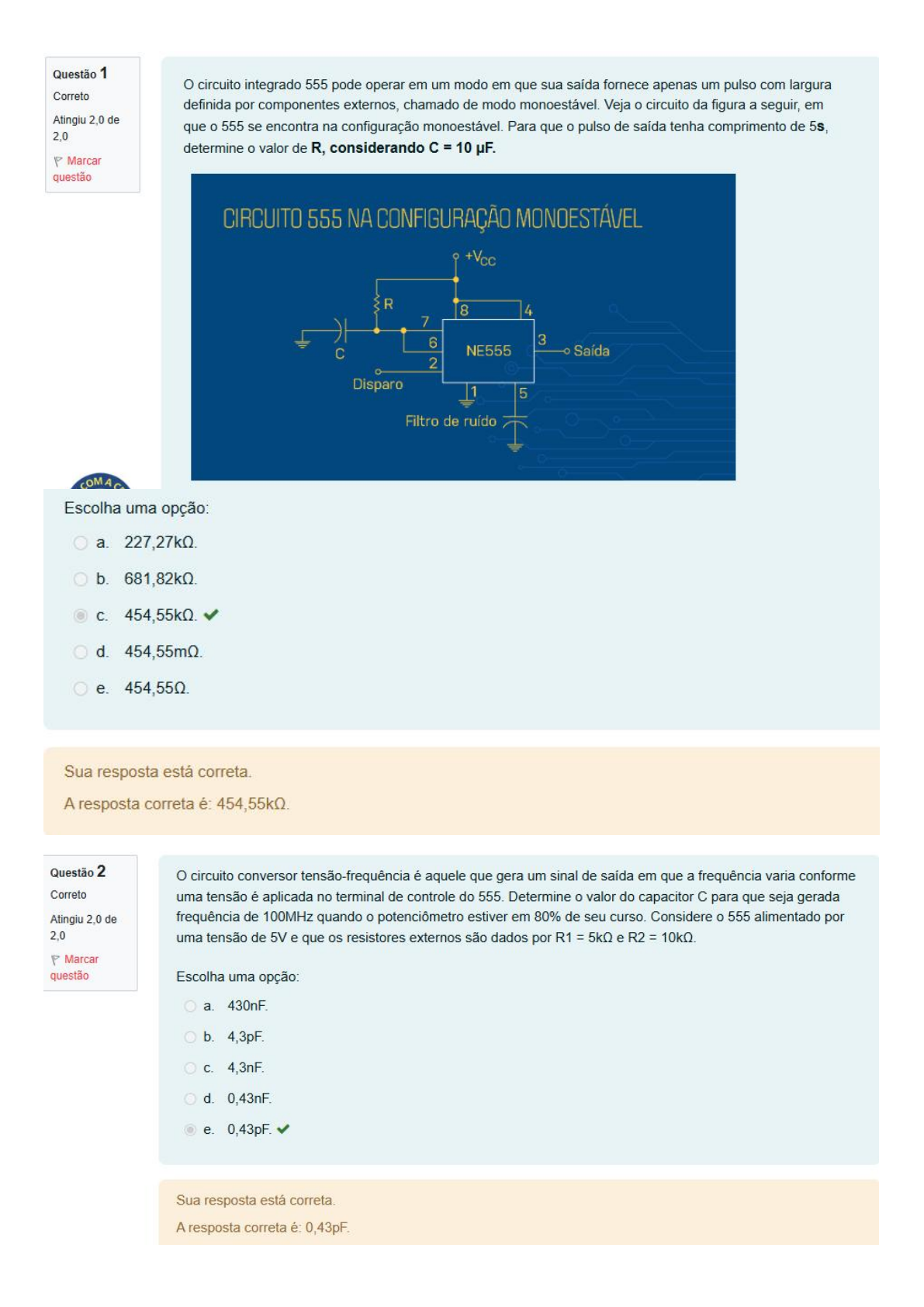 Questão 1 0 circuito integrado 555 pode operar em um modo em que sua saída fornece apenas um pulso com largura Correto definida por componentes externos, chamado de modo monoestável. Veja circuito da figura a seguir, em Atingiu 2,0 de que 0 555 se encontra na configuração monoestável. Para que pulso de saída tenha comprimento de 5s, 2,0 determine valor de R, considerando C = 10 P Marcar questão CIRCUITO 555 NA CONFIGURAÇÃO MONOESTÁVEL +Vcc R 8 4 7 6 NE555 Saída 2 Disparo 1 5 Filtro de ruído OMA Escolha uma opção: a. b. C. 454,55kQ. d. 454,55mQ. e. Sua resposta está correta. A resposta correta é: Questão 2 circuito conversor tensão-frequência é aquele que gera um sinal de saída em que a frequência varia conforme Correto uma tensão é aplicada no terminal de controle do 555. Determine valor do capacitor C para que seja gerada Atingiu 2,0 de frequência de 100MHz quando potenciômetro estiver em 80% de seu curso. Considere 0 555 alimentado por 2,0 uma tensão de 5V e que os resistores externos são dados por R1 = 5kQ e R2 = P Marcar questão Escolha uma opção: a. 430nF. b. 4,3pF. C. 4,3nF. d. 0,43nF. e. 0,43pF. Sua resposta está correta. A resposta correta é: 0,43pF.Questão 3 circuito integrado 555 na configuração astável é utilizado, entre outras aplicações, como oscilador. Correto Considere circuito astável do 555 da figura a seguir. Para que sinal oscilatório de saída tenha frequência Atingiu 2,0 de de 10kHz e que seu ciclo ativo seja de 70%, determine valores dos resistores RA e RB, considerando C 2,0 = P Marcar questão CIRCUITO 555 NA CONFIGURAÇÃO ASTÁVEL +Vcc RA 8 4 7 3 RB 6 555 Saída 2 1 5 Filtro de ruído Escolha uma opção: a. RA = 101,450 e RB = b. RA = e RB = C. RA = e RB = d. RA = 145,000 e RB = e. RA = e RB = Sua resposta está correta. A resposta correta é: RA = 57,900 e RB = Questão 4 555 no modo astável pode ser usado para gerar sinais oscilatórios, em que os componentes externos são Correto responsáveis por determinar os parâmetros do sinal de saída. Para que 0 sinal oscilatório de saída tenha Atingiu 2,0 de frequência de 10MHz e que seu ciclo ativo seja de 25%, determine os valores dos resistores RA e RB, 2,0 considerando C = 10pF P Marcar questão Escolha uma opção: a. RA = 9,667kQ e RB = 10,875kQ. b. RA = 10,875kQ e RB = C. RA = 3,625kQ e RB = 10,875kQ. d. RA = 4,833kQ e RB = e. RA = 4,833kQ e RB = Sua resposta está correta. A resposta correta é: RA = 3,625kQ e RB =Questão 5 A modulação por largura de pulso, ou PWM, é uma técnica utilizada para variar a tensão média aplicada em Correto cargas. Utilizando um 555 para geração de sinal PWM, qual deve ser 0 capacitor utilizado para gerar um ciclo Atingiu 2,0 de ativo de 50% quando a tensão de modulação for 1V? Considere que 555 é alimentado com 6V, que resistor 2,0 do circuito externo é R = e que pulso de disparo tem frequência de 1MHz. P Marcar questão Escolha uma opção: a. 279,06pF. b. 27,91pF. C. 2,79nF. d. 2,79pF. e. 248,15pF. Sua resposta está correta. A A resposta correta é: 2,79pF.