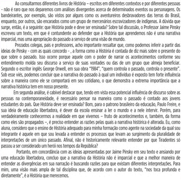 Ao consultarmos diferentes livros de História - escritos em diferentes contextos e por diferentes pessoas não é raro que nos deparemos com análises divergentes acerca de determinados eventos ou personagens. Os bandeirantes, por exemplo, são vistos por alguns como OS aventureiros desbravadores das terras do Brasil, enquanto, por outros, são encarados como um grupo de mercenários escravizadores de A dúvida que surge, então, é a seguinte: que História pode e deve ser ensinada? Sobre tal discussão, 0 Professor Jaime Pinsky escreveu um texto, em que é contundente ao defender que a que aprendemos não é uma narrativa imparcial, mas uma apropriação do passado a serviço de uma visão de mundo. Prezados colegas, pais e professores, acho importante ressaltar que, como podemos inferir a partir das ideias de Pinsky com as quais concordo a forma como a História é contada de diz mais sobre 0 presente do que sobre 0 passado. Isso ocorre porque aquele com 0 poder de narrar acontecimentos conforme seu entendimento molda seu discurso a serviço de suas vontades ou das de um grupo que almeja beneficiar. Segundo 0 escritor George Orwell, em sua obra "1984", "quem controla 0 passado, controla 0 presente". Sob esse vies, podemos concluir que a narrativa do passado à qual um é exposto tem forte influência sobre a maneira como ele se comportará em seu cotidiano, 0 que demonstra a extrema importância que a narrativa histórica tem em nosso presente. Em segunda é cabivel destacar que, tendo em vista essa potencial influência de discurso sobre as pessoas na contemporaneidade, é necessário pensar na maneira como 0 passado é contado aos jovens estudantes do pais. Que deve ser ensinada? Bom, para 0 patrono brasileiro da educação, Paulo Freire, e sua ideia de educação libertadora, é dever da escola ensinar a ler 0 mundo e a nele intervir. Porém, para verdadeiramente conhecermos a realidade em que vivemos fruto de acontecimentos e, da forma como eles são propagados -, é preciso entender as razões pelas quais a narrativa é alterada. Eu, como aluna, considero que 0 ensino de adequado para minha formação como agente na sociedade da qual sou integrante é aquele em que sou levada a entender processos que levam ao surgimento da pluralidade de interpretações de um único passado. Afinal, não é historicamente relevante entender por que Tiradentes passou a ser considerado um heroi nos tempos da Portanto, em concordância com as ideias apresentadas por Jaime Pinsky em seu texto e ansiando por uma educação libertadora, concluo que a narrativa da História não é imparcial e que a melhor maneira de entender as divergências em sua narração buscando razões para que existam diferentes interpretações. Para mim, uma visão mais ampla de tal disciplina que, de acordo com 0 autor do texto, "nos toca profunda e diretamente", é a que merecemos.