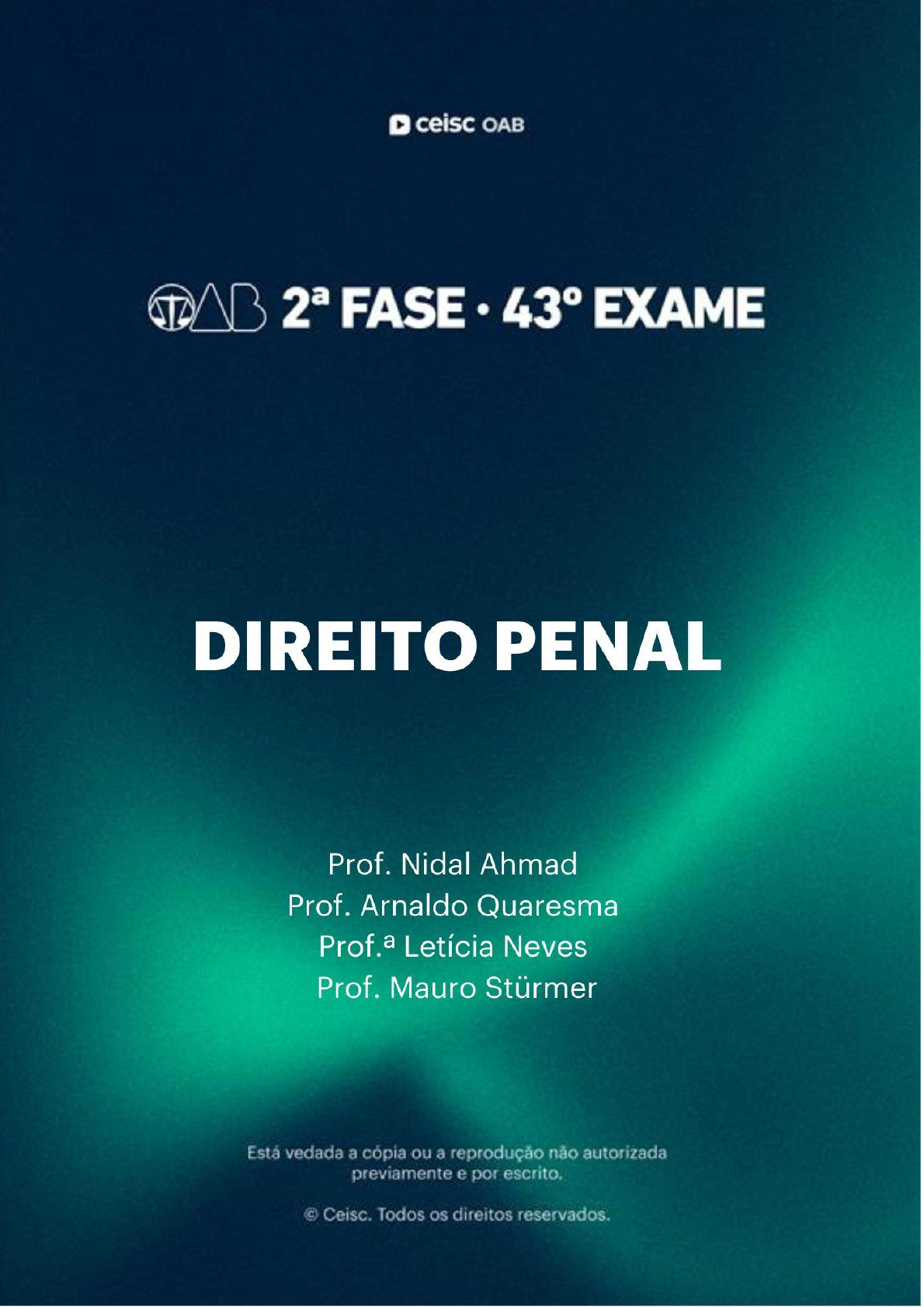 2ª Fase Penal | 43º Exame de Ordem 1 2ª Fase Penal | 43º Exame de Ordem 2 Olá, Alunos! Sejam bem-vindos! Esse material foi elaborado com muito carinho para que você possa absorver da melhor forma possível os conteúdos e se preparar para a sua 2ª fase, e deve ser utilizado de forma complementar junto com as aulas. Qualquer dúvida ficamos à disposição via plataforma “pergunte ao professor”. Lembre-se: o seu sonho também é o nosso! Bons estudos! Estamos com você até a sua aprovação! Com carinho, Equipe Ceisc ♥ 2ª Fase Penal | 43º Exame de Ordem 3 2ª FASE OAB | PENAL | 43º EXAME Direito Penal SUMÁRIO Das Nulidades 1.1 Sistema da tipicidade dos atos processuais ....................................................5 1.2 Conceito de nulidade .......................................................................................5 1.3 Nulidade absoluta e relativa ............................................................................5 1.3.1 Nulidades absolutas .....................................................................................5 1.3.2 Nulidades relativas .......................................................................................6 1.4 Vícios processuais – Art. 564 do CPP .............................................................6 1.4.1 Jurisdição e Competência – Art. 564, inciso I, do CPP ................................6 1.4.2 Ilegitimidade da Parte - Art. 564, inciso II, do CPP .......................................6 1.4.3 Falta de Atos Essenciais (Falta de Fórmulas ou Termos) – Art. 564, inciso III, do CPP .............................................................................................................7 1.5 Regularização da falta ou nulidade da citação, intimação ou notificação – Art. 570 do CPP ......................................................................................................... 11 Olá, aluno(a). Este material de apoio foi organizado com base nas aulas do curso preparatório para a 2ª Fase do 43º Exame da OAB e deve ser utilizado como um roteiro para as respectivas aulas. Além disso, recomenda-se que o aluno assista as aulas acompanhado da legislação pertinente. Bons estudos, Equipe Ceisc. Atualizado em abril de 2025. 2ª Fase Penal | 43º Exame de Ordem 4 2ª Fase Penal | 43º Exame de Ordem 5 Das Nulidades Prof. Arnaldo Quaresma @profarnaldoquaresma 1.1 Sistema da tipicidade dos atos processuais No tocante ao chamado sistema da tipicidade dos atos processuais ou legalidade dos atos processuais, podemos afirmar que o legislador construiu um modelo pelo qual o juiz, os assistentes e as partes devem se ajustar ao modelo legal, ou seja, todos aqueles que participam da relação processual devem pautar o seu agir em conformidade com aquilo que a lei processual determina. Desta feita, quando há uma inadequação ao modelo proposto pela lei no tipo processual em comento, haverá a atipicidade de tal ato processual, sendo que a consequência jurídica variará de acordo com o grau de violação respectivo, podendo ensejar uma mera irregularidade sem qualquer espécie de sanção processual ou até mesmo acarretar a inexistência do ato, por não conter os requisitos mínimos de formação. 1.2 Conceito de nulidade Nulidade é o vício que contamina determinado ato processual, praticado sem a observância da forma prevista em lei, podendo invalidar o ato ou o processo, no todo ou em parte. 1.3 Nulidade absoluta e relativa 1.3.1 Nulidades absolutas São aquelas que devem ser proclamadas pelo magistrado, de ofício ou a requerimento de qualquer das partes, porque produtoras de nítidas infrações ao interesse público na produção do devido processo legal. Exemplo: não conceder o juiz ao réu ampla defesa, cerceando a atividade do seu advogado. São nulidades insanáveis, que jamais precluem. O prejuízo da parte é presumido. A única exceção é a Súmula 160 do STF: “É nula a decisão do tribunal que acolhe, contra o réu, nulidade não arguida no recurso da acusa- ção, ressalvados os casos de recurso de ofício.” 2ª Fase Penal | 43º Exame de Ordem 6 1.3.2 Nulidades relativas São aquelas que somente serão reconhecidas caso arguidas pela parte interessada, demonstrando o prejuízo sofrido pela inobservância da formalidade legal prevista para ato realizado. 1.4 Vícios processuais – Art. 564 do CPP 1.4.1 Jurisdição e Competência – Art. 564, inciso I, do CPP *Para todos verem: esquema. 1.4.2 Ilegitimidade da Parte - Art. 564, inciso II, do CPP Nos crimes de ação penal pública, a legitimidade para oferecer a peça acusatória é do Ministério Público, ao passo que nos crimes de ação penal privada, a legitimidade será do ofendido ou do seu representante legal. Se o processo estiver em curso, verificando-se, na sequência, que o MP ofereceu denúncia em relação a crime de ação penal privada, haverá nulidade, por força da ilegitimidade de parte. Da mesma forma, se o processo estiver em curso, verificando-se, na sequência, que o ofendido ofereceu queixa-crime em relação a crime de ação penal pública, haverá nulidade, por força da ilegitimidade de parte. • A competência absoluta (em razão da matéria e de foro privilegiado) não admite prorrogação; logo, se infringida, é de ser reconhecido o vício como nulidade absoluta. Incompetência • Se houver suspeição do juiz, caberá as partes, se o próprio Magistrado não se abstiver de funcionar no feito, argui-la, nos termos do artigo 98 do Código de Processo Penal. Reconhecida a suspeição, ficarão nulos todos os atos (probatórios e decisórios), como estabelece o artigo 101 do Código de Processo Penal. Os motivos legais de suspeição estão elencados no artigo 254 do Código de Processo Penal. Suspeição 2ª Fase Penal | 43º Exame de Ordem 7 1.4.3 Falta de Atos Essenciais (Falta de Fórmulas ou Termos) – Art. 564, inciso III, do CPP Há, no processo, atos considerados ess
