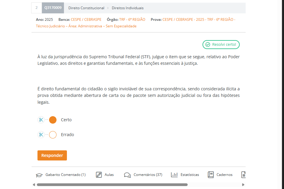 2 Q3170009 Direito Constitucional Direitos Individuais Ano: 2025 Banca: CESPE / CEBRASPE Órgão: TRF REGIÃO Prova: CESPE / CEBRASPE - 2025 - TRF - - REGIÃO Técnico Judiciário Área: Administrativa - Sem Especialidade Resolvi certo! À luz da jurisprudência do Supremo Tribunal Federal (STF), julgue 0 item que se segue, relativo ao Poder Legislativo, aos direitos e garantias fundamentais, e às funções essenciais à justiça. É direito fundamental do cidadão O sigilo inviolável de sua correspondência, sendo considerada ilícita a prova obtida mediante abertura de carta ou de pacote sem autorização judicial ou fora das hipóteses legais. Certo Errado Responder Gabarito Comentado (1) Aulas Comentários (37) Estatísticas Cadernos