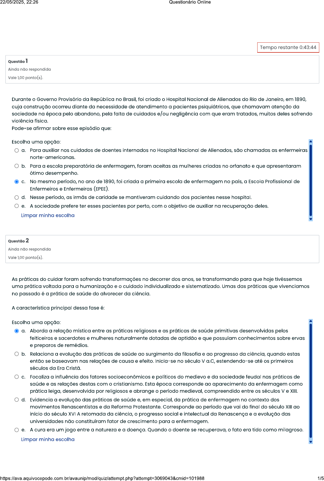 22/05/2025, 22:26 Questionário Online Tempo restante 0:43:44 Questão 1 Ainda não respondida Vale 1,00 ponto(s). Durante Governo Provisório da República no Brasil, foi criado Hospital Nacional de Alienados do Rio de Janeiro, em 1890, cuja construção ocorreu diante da necessidade de atendimento a pacientes psiquiátricos, que chamavam atenção da sociedade na época pelo abandono, pela falta de cuidados e/ou negligência com que eram tratados, muitos deles sofrendo violência física. Pode-se afirmar sobre esse episódio que: Escolha uma opção: a. Para auxiliar nos cuidados de doentes internados no Hospital Nacional de Alienados, são chamadas as enfermeiras norte-americanas. b. Para a escola preparatória de enfermagem, foram aceitas as mulheres criadas no orfanato e que apresentaram ótimo desempenho. No mesmo período, no ano de 1890, foi criada a primeira escola de enfermagem no país, a Escola Profissional de Enfermeiros e Enfermeiras d. Nesse período, as irmãs de caridade se mantiveram cuidando dos pacientes nesse hospital. e. sociedade prefere ter esses pacientes por perto, com o objetivo de auxiliar na recuperação deles. Limpar minha escolha Questão 2 Ainda não respondida Vale 1,00 ponto(s). As práticas do cuidar foram sofrendo transformações no decorrer dos anos, se transformando para que hoje tivéssemos uma prática voltada para a humanização e o cuidado individualizado e sistematizado. Umas das práticas que vivenciamos no passado é a prática de saúde do alvorecer da ciência. A característica principal dessa fase é: Escolha uma opção: a. Aborda a relação mística entre as práticas religiosas e as práticas de saúde primitivas desenvolvidas pelos feiticeiros e sacerdotes e mulheres naturalmente dotadas de aptidão e que possuíam conhecimentos sobre ervas e preparos de remédios. b. Relaciona a evolução das práticas de saúde ao surgimento da filosofia e ao progresso da ciência, quando estas então se baseavam nas relações de causa e efeito. Inicia-se no século V a.C, estendendo-se até primeiros séculos da Era Cristã. C. Focaliza a influência dos fatores e políticos do medievo e da sociedade feudal nas práticas de saúde e as relações destas com cristianismo. Esta época corresponde ao aparecimento da enfermagem como prática leiga, desenvolvida por religiosos e abrange período medieval, compreendido entre séculos V e XIII. d. Evidencia a evolução das práticas de saúde e, em especial, da prática de enfermagem no contexto dos movimentos Renascentistas e da Reforma Protestante. Corresponde ao período que vai do final do século XIII ao início do século XVI retomada da ciência, progresso social e intelectual da Renascença e a evolução das universidades não constituíram fator de crescimento para a enfermagem. e. A cura era um jogo entre a natureza e a doença. Quando doente se recuperava, fato era tido como milagroso. Limpar minha escolha 1/522/05/2025, 22:26 Questionário Online Questão 3 Ainda não respondida Vale 1,00 ponto(s). Rio de Janeiro, como capital federal do Brasil, na época, teve grande importância nas condutas de saúde do país. No final do século Brasil tem cidades crescendo e, consequentemente, aumentam as doenças e as epidemias. Serviço de Inspeção de Saúde Pública do Porto do Rio de Janeiro, existente desde 1828, demonstra deficiência no controle das doenças. Em 1904, Oswaldo Cruz implanta a reforma, criando serviços públicos, vigilância e controle dos portos com quarentenas. Em 1920, a reforma de Carlos Chagas cria Departamento Nacional de Saúde Pública, exercendo ações normativas e executivas. Essas ações têm por objetivo: Escolha uma opção: a. Oferecer mais conforto à Corte portuguesa que migrava para Brasil. b. Controlar as epidemias e avanço de doenças. C. Exterminar definitivamente índios. d. Justificar as verbas destinadas à saúde. e. Mostrar para Portugal que se prestava uma boa assistência de saúde. Limpar minha escolha Questão 4 Ainda não respondida Vale 1,00 ponto(s). Refletindo sobre a prática de enfermagem exercida historicamente a partir do cristianismo. cristianismo exerceu enorme influência na ação de cuidar, pois valorizava o cuidado com os pobres e doentes, fez com que pessoas da nobreza, como reis e rainhas se despojassem de seus bens para se dedicar à caridade ou transformassem seus palácios em abrigos para os menos favorecidos. Diante do texto referente à prática da enfermagem, podemos dizer que: Escolha uma opção: a. Teve início com Jesuítas, com assistência aos doentes nos colégios e conventos. Juntando-se a eles nas Missões Jesuítas, levando cuidado de saúde para índios e excluídos. b. Enclausuradas nos hospitais religiosos, permaneceu empírica e desarticulada durante muito tempo. Enfermeiras graduadas e pós-graduadas que realizavam assistência de qualidade e utilizavam processo de enfermagem e pensamento crítico. d. Era realizada por pajés e feiticeiros com seus deuses protetores e culto à magia e superstição. Nestes, papel da enfermagem era de assistência nos cultos. e. A enfermagem era exercida por religiosas e abnegadas mulheres que dedicavam suas vidas à assistência aos doentes. Para isso se preparavam moral e intelectualmente. Limpar minha escolha 2/522/05/2025, 22:26 Questionário Online Questão 5 Ainda não respondida Vale 1,00 ponto(s). A prática de cuidar de doentes, que mais tarde seria reconhecida como Enfermagem, surgiu com desejo de manter as pessoas saudáveis, proporcionando conforto e proteção, garantindo sua sobrevivência, constituindo, assim, a imagem da enfermeira. No início da história do cuidar, a prática cuidativa era assumida por mulheres que apresentavam desejo e habilidade para cuidar. conhecimento que essas mulheres desenvolviam e acumulavam sobre cuidar era passado oralmente de geração para geração. Analisando este relato, a prática de saúde retratada é: Escolha uma opçã