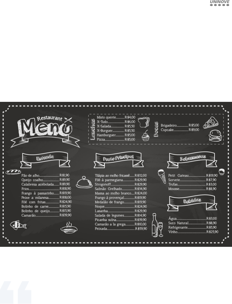 “O cardápio tem função primordial em um restaurante – é um dos seus principais instrumentos de marketing. Veículo de informação, venda e publicidade, tem como finalidade auxiliar os clientes na escolha de alimentos e bebidas. Deve ser cuidadosamente planejado e elaborado, pois transmite a imagem do estabelecimento para o consumidor”. LOURDES (2011) Planejamento de Cardápios AUXILIAR O ALUNO A CONHECER E COMPREENDER A IMPORTÂNCIA E OS CONCEITOS RELATIVOS À GESTÃO POR MEIO DO CARDÁPIO. AUTOR(A): PROF. VIVIANE CELINA CARMONA AUTOR(A): PROF. SILVIA LETICIA LOPES BITTENCOURT Legenda: CARDáPIO 13/03/2025, 17:48 AVA UNINOVE https://ava.uninove.br/seu/AVA/topico/container_impressao.php 1/8 Antes que você possa produzir um cardápio eficiente para o seu ponto de refeições ? um que irá agradar tanto aos clientes quanto contribuirá para que as próprias metas do estabelecimento sejam atingidas ? você necessita considerar exatamente quais são os objetivos que deverão ser alcançados por seu cardápio. REY; WIELAND, 1999 O CARDÁPIO O cardápio teve sua origem de acordo com (Lopes, 2007) possivelmente no século XVIII na França. Na ocasião o Rei Luís XV ofereceu um banquete à comunidade financeira e os pratos foram registrados em um documento onde foram listados (48 pratos, sopas, carnes e sobremesas). Porém ainda, segundo o autor existem relatos de um documento mais antigo, que se refere a um banquete oferecido pelo Duque Heinrich Brunswick-Wolfenbuttel em 1521 na Alemanha. Este banquete foi documentado em um pergaminho escrito pelos cozinheiros. Os primeiros cardápios surgiram oficialmente em Paris, porém eram na verdade quadros colocados na parte externa dos estabelecimentos que listavam os pratos oferecidos. Com o passar dos tempos, os serviços começaram a se profissionalizar e os atendentes começaram a tirar os pedidos na mesa, e levavam consigo uma lista escrita em uma madeira com todos os pratos e bebidas servidos, porém logo os clientes começaram a pedir estas tábuas e os estabelecimentos entenderam a necessidade e criar listas individuais para levar a mesa dos clientes, surgindo assim o cardápio ou menu (ou ainda carta). Muitos autores e profissionais afirmam que o cardápio é tão importante para um estabelecimento de alimentos e bebidas, que ele deveria sempre preceder a abertura do empreendimento, ou seja, primeiro pensar no cardápio e somente depois pensar na abertura do estabelecimento comercial, como afirma Lourdes (2011). Podemos afirmar, portanto, que o cardápio é a peça fundamental no restaurante, como afirmam Rey e Wieland (1999) que escrevem muito bem a importância do cardápio, quando afirmam: O planejamento do cardápio deve ser o primeiro item a ser pensado quando surge a ideia de investir em um empreendimento de alimentos e bebidas. Quando se pensa em um negócio de alimentação automaticamente se pensa no cardápio ? o que servir/ como servir ? passa a ser então uma preocupação que vai, de certa maneira, delinear a silhueta do estabelecimento. Ao conceber a ideia da montagem de um restaurante, os futuros proprietários devem estabelecer objetivos básicos e as formas de atingi-los. Em empreendimentos de Alimentos e Bebidas, o bom desempenho empresarial só será alcançado com a observação de diversos momentos propícios ao controle, que são gerados com a concepção de um cardápio muito bem definido e elaborado. Muitos novos proprietários, ou mesmo proprietários e gerentes experientes, acabam deixando para o último instante da abertura aquilo que deveria ser considerado como o item mais importante, ?O Planejamento do Cardápio?, como afirma Lourdes (2011). 13/03/2025, 17:48 AVA UNINOVE https://ava.uninove.br/seu/AVA/topico/container_impressao.php 2/8 Muitos donos de restaurantes, no afã de ganharem mercado ou chamarem atenção dos clientes, deixam de tirar proveito de um cardápio adequado, eficiente, atrativo. Cardápios muito extensos, por exemplo, cansam e confundem o consumidor, além de exigirem um estoque maior, dificultando o trabalho do garçom e penalizando a qualidade do serviço, o controle de material e elevando os custos. LOURDES, 2011 Ao planejar um restaurante, o ideal é listar uma série de ideias em um papel, para que, após a inauguração, o negócio venha a ser lucrativo e prazeroso, tanto para os clientes como para os administradores. A formulação dessas ideias chama-se conceito de restaurante (...). O conceito abrange a percepção total do público sobre o restaurante. WALKER; LUNDBERG, 2003 BUFFET Consequentemente, essa ação tardia, poderá representar um investimento em equipamentos e utensílios muitas vezes superdimensionados para determinadas produções culinárias, ou o oposto, simplesmente se esquecendo de prevê-los e acarretando, às vezes, a necessidade de se adicionar pontos extras de água e energia, com a consequente quebra de paredes e reformas de última hora para esse fim. Planejamento de cardápio Planejar cardápios, é um convite ao conhecimento do perfil de um restaurante, talvez ainda o perfil do proprietário ou gerente, e suas formas de gestão Walker e Lundberg afirmam que: O cardápio é ao mesmo tempo mecanismo de organização, controle, marketing e vendas, pois quando o cliente entra num restaurante, ele vem com o propósito de consumo, e o cardápio é o principal elo entre o cliente e os produtos oferecidos naquele estabelecimento, podemos dizer ainda que é a "vitrine da loja" e, portanto, deve ser apresentado com esmero. Objeto disponível na plataforma Informação: 13/03/2025, 17:48 AVA UNINOVE https://ava.uninove.br/seu/AVA/topico/container_impressao.php 3/8 O cardápio é o plano do estabelecimento de alimentação para atender às necessidades e às expectativas dos clientes. Ele lista os itens que os consumidores desejam e apreciam. E, portanto, o plano de produto de um restaurante. CHON; SPARROWE, 2003 O cardápio ? peça primordial de vendas ? refl