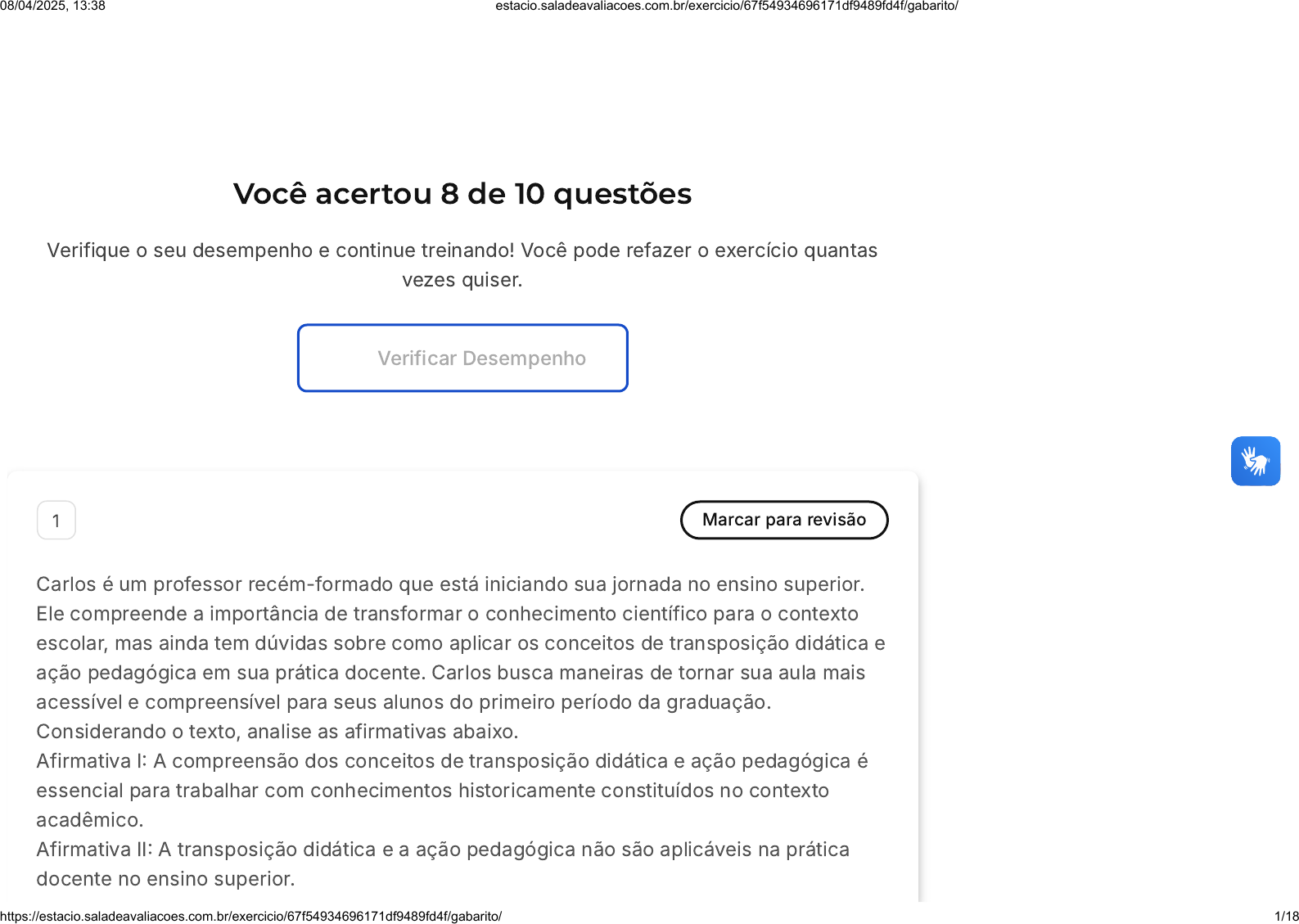 Você acertou 8 de 10 questões Verifique o seu desempenho e continue treinando! Você pode refazer o exercício quantas vezes quiser. Verificar Desempenho 1 Marcar para revisão Carlos é um professor recém-formado que está iniciando sua jornada no ensino superior. Ele compreende a importância de transformar o conhecimento científico para o contexto escolar, mas ainda tem dúvidas sobre como aplicar os conceitos de transposição didática e ação pedagógica em sua prática docente. Carlos busca maneiras de tornar sua aula mais acessível e compreensível para seus alunos do primeiro período da graduação. Considerando o texto, analise as afirmativas abaixo. Afirmativa I: A compreensão dos conceitos de transposição didática e ação pedagógica é essencial para trabalhar com conhecimentos historicamente constituídos no contexto acadêmico. Afirmativa II: A transposição didática e a ação pedagógica não são aplicáveis na prática docente no ensino superior. 08/04/2025, 13:38 estacio.saladeavaliacoes.com.br/exercicio/67f54934696171df9489fd4f/gabarito/ https://estacio.saladeavaliacoes.com.br/exercicio/67f54934696171df9489fd4f/gabarito/ 1/18 A B C D E Afirmativa III: A ação pedagógica requer uma atuação consciente e reflexiva do professor. Quais afirmativas estão corretas? Somente as afirmativas I e II estão corretas Somente as afirmativas I e III estão corretas Somente a afirmativa I está correta Somente a afirmativa II está correta Somente a afirmativa III está correta Resposta correta Parabéns, você selecionou a alternativa correta. Confira o gabarito comentado! Gabarito Comentado A compreensão dos conceitos de transposição didática e ação pedagógica é crucial para os professores, especialmente no ensino superior, onde eles lidam com conhecimentos historicamente constituídos e precisam adaptá-los ao contexto escolar. A afirmativa II está incorreta porque esses conceitos são, de fato, muito relevantes na prática docente, independentemente do nível de ensino. A afirmativa III também está 08/04/2025, 13:38 estacio.saladeavaliacoes.com.br/exercicio/67f54934696171df9489fd4f/gabarito/ https://estacio.saladeavaliacoes.com.br/exercicio/67f54934696171df9489fd4f/gabarito/ 2/18 A B incorreta, pois a ação pedagógica exige uma atuação consciente e reflexiva do professor, visando otimizar o processo de ensino e aprendizagem 2 Marcar para revisão Leia o texto abaixo e preencha as lacunas com a sequência correta de palavras que compõem as alternativas. A transposição didática é um processo _______ que envolve a adaptação do conhecimento acadêmico para torná-lo acessível e compreensível para os alunos. Neste processo, é fundamental considerar não apenas os conteúdos a serem ensinados, mas também o _______ e as características dos alunos. Um exemplo claro disso é a história de Juliana, uma professora que, ao preparar sua primeira aula sobre Botânica, levou em consideração apenas os manuais clássicos, sem adaptar o conteúdo à realidade dos alunos. Essa situação ilustra a importância de se estar atento aos movimentos da transposição ________, que ocorre dentro da instituição escolar e na sala de aula, levando em conta o cotidiano dos alunos. Qual é a sequência correta de palavras que completa o texto? complexo - contexto - interna simples - ambiente - externa 08/04/2025, 13:38 estacio.saladeavaliacoes.com.br/exercicio/67f54934696171df9489fd4f/gabarito/ https://estacio.saladeavaliacoes.com.br/exercicio/67f54934696171df9489fd4f/gabarito/ 3/18 C D E rápido - contexto - interna complexo - ambiente - externa rápido - contexto - externa Resposta correta Parabéns, você selecionou a alternativa correta. Confira o gabarito comentado! Gabarito Comentado A transposição didática é descrita no texto como um processo complexo, que vai além da simples transferência de conhecimento acadêmico para o ambiente de sala de aula. É necessário considerar o contexto em que os alunos estão inseridos e suas características individuais, algo que a professora Juliana não fez inicialmente. Ela se concentrou nos manuais clássicos, ignorando a necessidade de adaptar o conteúdo à realidade dos alunos, ilustrando a importância de se prestar atenção à transposição interna. Esta ocorre dentro da instituição escolar e na sala de aula, sendo crucial para o sucesso do processo educacional. Portanto, a sequência correta para preencher as lacunas é "complexo - contexto - interna". Questão 3 de 10 Corretas (8) Incorretas (2) Em branco (0) 1 2 3 4 5 6 7 8 9 10 Lista de exercícios Ação Pedagógica e Transposição Didática Sair 08/04/2025, 13:38 estacio.saladeavaliacoes.com.br/exercicio/67f54934696171df9489fd4f/gabarito/ https://estacio.saladeavaliacoes.com.br/exercicio/67f54934696171df9489fd4f/gabarito/ 4/18 3 Marcar para revisãoMarcar questão para revisar antes de finalizar "Nós ousamos prometer uma Didática Magna, isto é, um método universal de ENSINAR TUDO A TODOS. E de ensinar com tal certeza, que seja impossível não conseguir bons resultados. E de ensinar rapidamente, ou seja, sem nenhum enfado e sem nenhum aborrecimento para os alunos e para os professores, mas antes com sumo prazer para uns e para outros. E de ensinar solidamente, não superficialmente e apenas com palavras, mas encaminhando os alunos para uma verdadeira instrução, para os bons costumes e para a piedade sincera" (Comenius: Didática Magna. Saudação aos leitores, 3). Embora Comenius não tenha afirmado que a metodologia de ensino proposta deva ser a MESMA PARA TODOS, com a ajuda de reflexão feita a partir do conceito de Ação pedagógica hoje sabemos que este empreendimento levaria ao fracasso. As novas concepções acerca do ensino e da aprendizagem romperam séculos de pouca preocupação explícita com este processo. Acerca das concepções de ensino e aprendizagem anteriores ao surgimento do conceito de Ação Pedagógica, analise as a