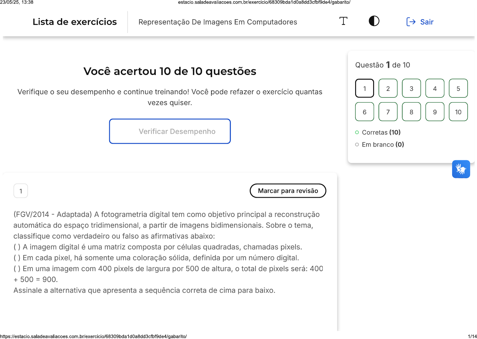 23/05/25, 13:38 Lista de exercícios Representação De Imagens Em Computadores T Sair Questão 1 de 10 Você acertou 10 de 10 questões 1 2 3 4 5 Verifique o seu desempenho e continue treinando! Você pode refazer o exercício quantas vezes quiser. 6 7 8 9 10 Verificar Desempenho Corretas (10) Em branco (0) 1 Marcar para revisão (FGV/2014 - Adaptada) A fotogrametria digital tem como objetivo principal a reconstrução automática do espaço tridimensional, a partir de imagens bidimensionais. Sobre o tema, classifique como verdadeiro ou falso as afirmativas abaixo: ( ) A imagem digital é uma matriz composta por células quadradas, chamadas pixels. ( ) Em cada pixel, há somente uma coloração sólida, definida por um número digital. ( ) Em uma imagem com 400 pixels de largura por 500 de altura, o total de pixels será: 400 Assinale a alternativa que apresenta a sequência correta de cima para baixo. 1/1423/05/25, 13:38 A F; F. B F. C V. D F; V. E F; V; V. Resposta correta Parabéns, você selecionou a alternativa correta. Confira o gabarito comentado! Gabarito Comentado F. 2 Marcar para revisão 2/1423/05/25, 13:38 Quantos pixels possui uma imagem com resolução de A 1.400 B 2.800 C 120.000 D 240.000 E 480.000 Resposta correta Parabéns, você selecionou a alternativa correta. Confira o gabarito comentado! Gabarito Comentado A quantidade de pixels em uma imagem é determinada multiplicando-se as dimensões da resolução. Neste caso, multiplicando 800 por 600, obtemos 480.000 pixels. Portanto, uma imagem com resolução de 800x600 possui 480.000 pixels. 3/1423/05/25, 13:38 3 Marcar para revisão Pensamento computacional é uma habilidade cognitiva que envolve a capacidade de resolver problemas, pensar de forma lógica e sistêmica, decompor problemas em partes menores, identificar padrões e criar soluções utilizando conceitos e técnicas da ciência da computação. computador é capaz de representar digitalmente por meio de números uma imagem do mundo real ou orgânico. Para um computador representar digitalmente por meio de números uma imagem do mundo real ou orgânico consideramos uma habilidade chamada de: A precisão. B abstração. C imperícia. D formatação. E exatidão. https://estacio.saladeavaliacoes.com.br/exercicio/68309bda1d0a8dd3cfbf9de4/gabarito 4/1423/05/25, 13:38 Resposta correta Parabéns, você selecionou a alternativa correta. Confira o gabarito comentado! Gabarito Comentado A abstração é a habilidade de simplificar a representação de um objeto ou conceito, focando apenas nos aspectos relevantes e ignorando os detalhes desnecessários. No contexto da representação de imagens digitais, a abstração é essencial para que o computador possa transformar a imagem do mundo real em uma sequência de números binários que possam ser armazenados e processados digitalmente. 4 Marcar para revisão Considere a grade de pixels a seguir: Qual é a coordenada do pixel em preto? 5/1423/05/25, 13:38 A (1,1) B (2,3) C (3,2) D (2,1) E (1,2) Resposta correta Parabéns, você selecionou a alternativa correta. Confira o gabarito comentado! Gabarito Comentado A resposta correta é: (2,1) 5 Marcar para revisão 6/1423/05/25, 13:38 Uma empresa de tecnologia está desenvolvendo um sistema de visão computacional para reconhecimento facial em tempo real. Por que a empresa deve utilizar imagens em grayscale para o sistema de visão computacional? A Para aumentar o uso de memória do sistema B Para simplificar a identificação de áreas homogêneas C Para melhorar a qualidade visual das imagens de reconhecimento D Para permitir a criação de gráficos coloridos E Para garantir a consistência das cores nas imagens Resposta correta Parabéns, você selecionou a alternativa correta. Confira o gabarito comentado! Gabarito Comentado 7/1423/05/25, 13:38 Utilizar imagens em grayscale simplifica a identificação de áreas homogêneas e reduz a quantidade de dados que os algoritmos precisam processar, levando a um desempenho mais rápido e eficiente em sistemas de visão computacional. 6 Marcar para revisão As cores são elementos fundamentais em diversas áreas do conhecimento humano, incluindo a arte, a publicidade, o design gráfico, a psicologia, entre outras. Elas desempenham um papel crucial na nossa vida cotidiana, afetando a forma como percebemos o mundo ao nosso redor e influenciando nossas emoções, comportamentos e decisões. O sistema de con RGB é baseado nas cores: A vermelho, verde e azul. B preto, cinza e laranja. C amarelo, marrom e rosa. 8/1423/05/25, 13:38 D azul, roxo e verde. E cinza, amarelo e vermelho. Resposta correta Parabéns, você selecionou a alternativa correta. Confira o gabarito comentado! Gabarito Comentado O sistema de cor RGB (Red, Green, Blue) é baseado na adição de luzes coloridas. Essas três cores primárias são usadas para criar todas as outras cores do espectro visível. A combinação de todas as três cores em igual intensidade resulta em luz branca, enquanto a ausência de todas as cores resulta em preto. sistema RGB é amplamente utilizado em dispositivos eletrônicos, como telas de computador, telefones celulares e televisores. 7 Marcar para revisão A imagem digital é uma parte essencial das peças publicitárias modernas. Ela permite que os anunciantes transmitam mensagens visualmente atraentes e envolventes para seus públicos-alvo. Sabemos que quanto mais pixels houver em uma imagem, mais próxima ela será da realidade. Nesse sentido, qual é a definição correta de pixel? 9/1423/05/25, 13:38 A tamanho físico de um ponto de cor em uma tela de computador. B A unidade básica de medida de resolução em imagens digitais. C A quantidade de cores disponíveis em uma imagem digital. D A unidade de medida para a densidade de pixels em uma imagem. E O formato de imagem mais utilizado em fotografias digitais. Resposta correta Parabéns, você selecionou a alternativa correta. Confira o gabarito comentado! Gabarito Comentado Um pi