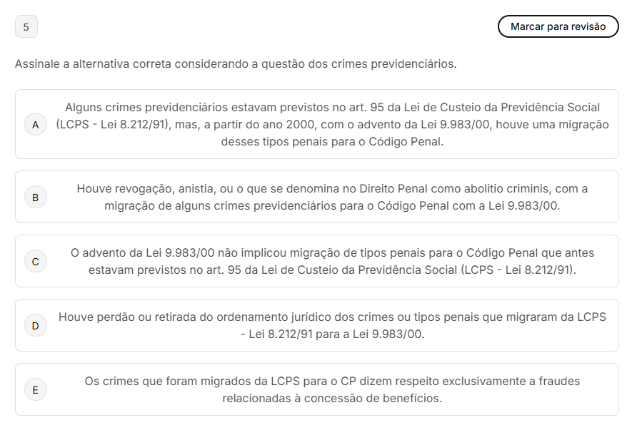 5 Marcar para revisão Assinale a alternativa correta considerando a questão dos crimes previdenciários. Alguns crimes previdenciários estavam previstos no art. 95 da Lei de Custeio da Previdência Social A (LCPS - Lei 8.212/91), mas, a partir do ano 2000, com advento da Lei 9.983/00, houve uma migração desses tipos penais para Código Penal. Houve revogação, anistia, ou que se denomina no Direito Penal como abolitio criminis, com a B migração de alguns crimes previdenciários para Código Penal com a Lei 9.983/00. o advento da Lei 9.983/00 não implicou migração de tipos penais para Código Penal que antes C estavam previstos no art. 95 da Lei de Custeio da Previdência Social (LCPS - Lei 8.212/91). Houve perdão ou retirada do ordenamento jurídico dos crimes ou tipos penais que migraram da LCPS D - Lei 8.212/91 para a Lei 9.983/00. Os crimes que foram migrados da LCPS para CP dizem respeito exclusivamente a fraudes E relacionadas à concessão de benefícios.