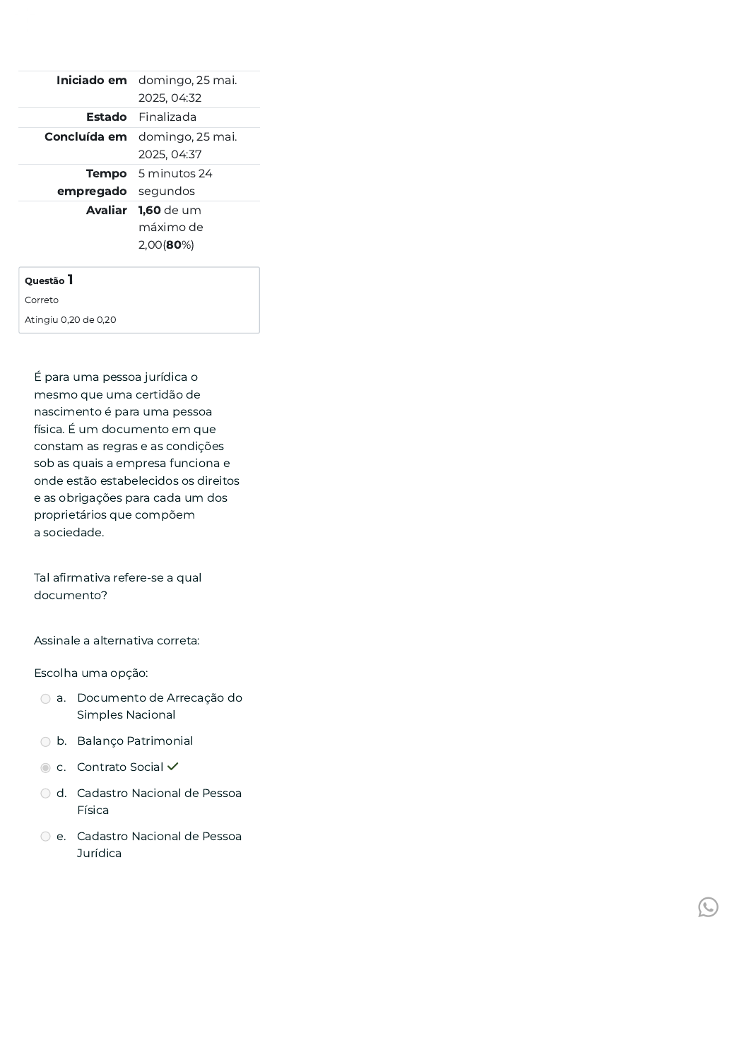 Iniciado em domingo, 25 mai. 2025, 04:32 Estado Finalizada Concluída em domingo, 25 mai. 2025, 04:37 Tempo empregado 5 minutos 24 segundos Avaliar 1,60 de um máximo de 2,00(80%) Questão 1 Correto Atingiu 0,20 de 0,20 É para uma pessoa jurídica o mesmo que uma certidão de nascimento é para uma pessoa física. É um documento em que constam as regras e as condições sob as quais a empresa funciona e onde estão estabelecidos os direitos e as obrigações para cada um dos proprietários que compõem a sociedade. Tal afirmativa refere-se a qual documento? Assinale a alternativa correta: Escolha uma opção: a. Documento de Arrecação do Simples Nacional b. Balanço Patrimonial c. Contrato Social ✓ d. Cadastro Nacional de Pessoa Física e. Cadastro Nacional de Pessoa Jurídica https://api.whatsapp.com/send?phone=554491540086&text=Ol%C3%A1,%20como%20podemos%20te%20ajudar%20hoje? Questão 2 Correto Atingiu 0,20 de 0,20 De acordo com Feitosa (2021, on- line), costuma-se dizer que um contrato social é para uma pessoa jurídica o mesmo que uma certidão de nascimento é para uma pessoa física. O contrato social é um documento em que constam as regras e as condições sob as quais a empresa funciona e onde estão estabelecidos os direitos e as obrigações para cada um dos proprietários que compõem a sociedade. Assim, a respeito deste documento, analise as afirmativas abaixo: I. É possível identificar a existência de variados modelos de contratos sociais, então, apesar de existir um padrão na construção, é possível ao futuro empreendedor, estipular novos capítulos e cláusulas que lhes forem convenientes. II. Neste documento é recomendado fazer a qualificação dos sócios - Essa é uma parte padrão para todos os contratos, em que é preciso discriminar quem são os sócios da empresa e suas informações; III. É necessário definar o tipo de empresa e o local onde vai operar neste documento. IV. Não é necessário especificar as atividades e serviços desenvolvidos. Assinale a alternativa correta: Escolha uma opção: a. Todas as alternativas estão corretas. b. Apenas III e IV estão corretas. c. Apenas II e III estão corretas. d. Apenas II, III e IV estão corretas. e. Apenas I, II e III estão corretas. ✓ https://api.whatsapp.com/send?phone=554491540086&text=Ol%C3%A1,%20como%20podemos%20te%20ajudar%20hoje? Questão 3 Correto Atingiu 0,20 de 0,20 Para Barbosa et al. (2021, p. 05), o primeiro passo da legalização de uma organização é definir a(s) atividade(s) econômica(s), o tipo jurídico e a tributação, uma vez que essas informações serão exigidas ao longo do processo. A definição da atividade econômica correta é primordial no processo de legalização de uma entidade, uma vez que essa informação irá impactar na autorização do local pela prefeitura e na escolha da melhor forma de tributação. Assim, analise as afirmativas abaixo e classifique-as com “V” para verdadeiro e “F” para falso: ( ) A Classificação Nacional de Atividade Econômica dita qual a área de atuação da atividade empresarial; ( ) A Classificação Nacional de Atividade Econômica dita qual o público alvo da organização; ( ) O CNAE é um código que atribui um conjunto de atividades desempenhadas pelo empresário; ( ) Toda atividade econômica possui seu próprio código CNAE, empresas públicas, privadas, organizações não governamentais e, até mesmo, pessoas físicas que exercem atividade autônoma. Assinale a alternativa correta: Escolha uma opção: a. V, F, V, V. ✓ b. F, F, V, V. c. V, V, V, V. d. V, F, F, V. e. V, F, F, V. https://api.whatsapp.com/send?phone=554491540086&text=Ol%C3%A1,%20como%20podemos%20te%20ajudar%20hoje? Questão 4 Incorreto Atingiu 0,00 de 0,20 Globalização, transformação digital empresarial e avanços das tecnologias de comunicação e informação (TICs) são fenômenos modernos nos quais as empresas estão repensando não apenas sua estrutura organizacional, mas também suas motivações internas e externas. Uma tendência que se intensificou no mundo dos negócios nos últimos anos para se manter competitivo é o compartilhamento de informações, competências e conhecimentos entre as empresas. Em seguida, trabalhar em rede auxilia na criação de valor para todos os envolvidos (SECAF, 2020). Não obstante, analise as afirmativas abaixo: I. Pivot: é o movimento de redirecionamento do projeto de negócios da empresa. II. Lean startup: é o momento que o investidor entrega sua parte da empresa, que ele havia comprado no início, em troca de dinheiro. III. Bootstrapping: é um termo que se refere à criação de uma start- up com recursos próprios, sem o aporte financeiro de investidores. IV. Venture capital: termo que se aplica a todos os investidores de risco. Geralmente se agrupam em sociedades investidoras e investem em empresas que já têm lucro. Assinale a alternativa correta: Escolha uma opção: a. Todas as alternativas estão corretas. b. Apenas I, III e IV estão corretas. c. Apenas II, III e IV estão corretas. d. Apenas I, II e III estão corretas. × e. Apenas II e III estão corretas https://api.whatsapp.com/send?phone=554491540086&text=Ol%C3%A1,%20como%20podemos%20te%20ajudar%20hoje? Questão 5 Correto Atingiu 0,20 de 0,20 A característica fundamental de um empreendedor é o espírito de criatividade e pesquisa. Está sempre em busca de novos caminhos e soluções, sempre pensando nas necessidades das pessoas. A essência de um empreendedor de sucesso está constantemente interessada em descobrir novas oportunidades de negócios ou aprimorar produtos e processos. CAMARGO, R. B. Empreendedorismo, inovação e tecnologia. 1ª ed. Maringá: UniCV, 2021. Com base no enunciado, e no significado dos termos ligamos a negócios e empreendedorismo, relacione a primeira coluna com a segunda coluna: Primeira Coluna Segunda Coluna 1. Meetup ( ) Investidor que busca baixo risco e se envolve em modelos tradicionais e s