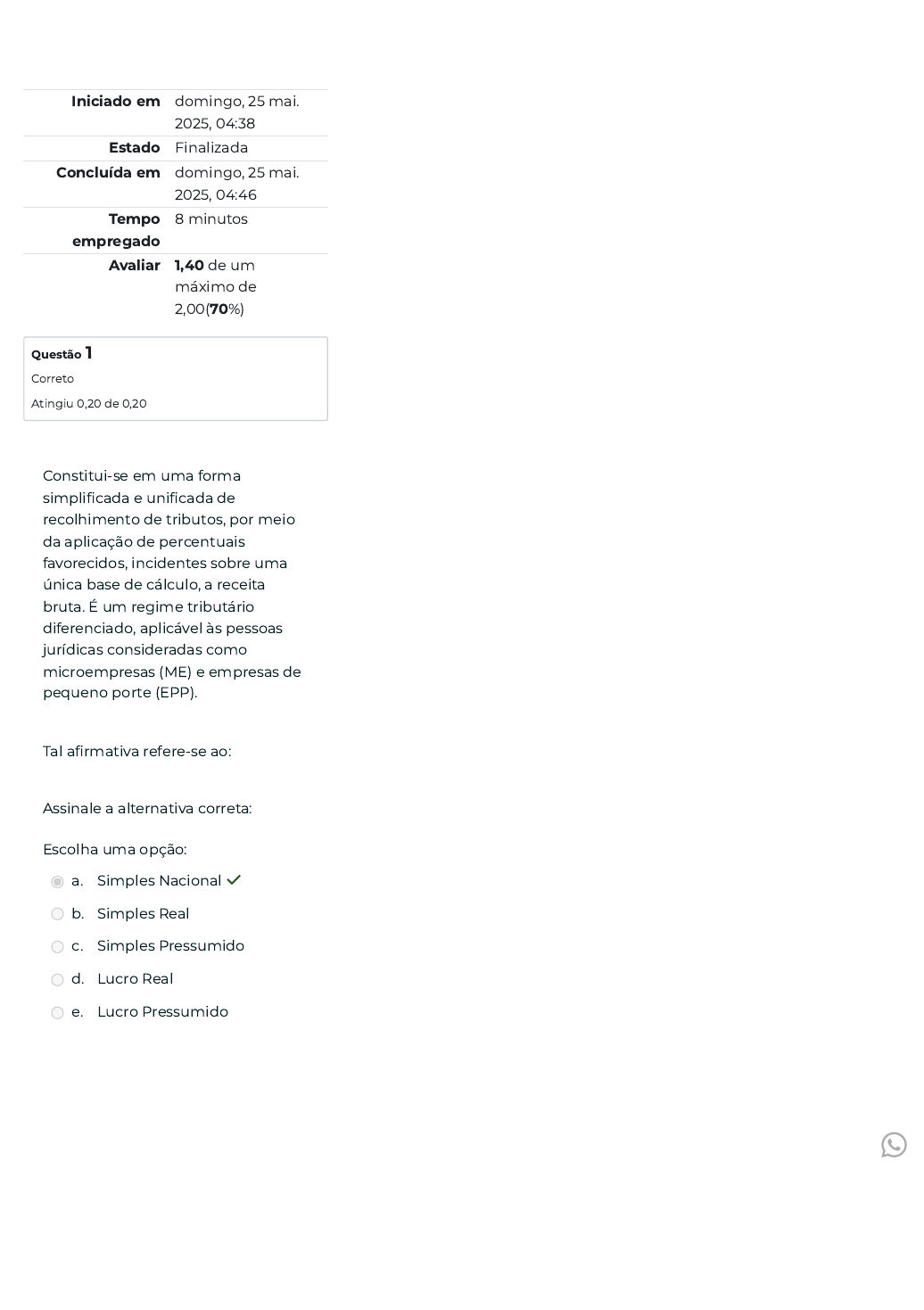 Iniciado em domingo, 25 mai. 2025, 04:38 Estado Finalizada Concluída em domingo, 25 mai. 2025, 04:46 Tempo empregado 8 minutos Avaliar 1,40 de um máximo de 2,00(70%) Questão 1 Correto Atingiu 0,20 de 0,20 Constitui-se em uma forma simplificada e unificada de recolhimento de tributos, por meio da aplicação de percentuais favorecidos, incidentes sobre uma única base de cálculo, a receita bruta. É um regime tributário diferenciado, aplicável às pessoas jurídicas consideradas como microempresas (ME) e empresas de pequeno porte (EPP). Tal afirmativa refere-se ao: Assinale a alternativa correta: Escolha uma opção: a. Simples Nacional ✓ b. Simples Real c. Simples Pressumido d. Lucro Real e. Lucro Pressumido https://api.whatsapp.com/send?phone=554491540086&text=Ol%C3%A1,%20como%20podemos%20te%20ajudar%20hoje? Questão 2 Incorreto Atingiu 0,00 de 0,20 Para as Micro e Pequenas Empresas, o Simples Nacional costuma ser a opção mais vantajosa para quem está começando uma empresa ou para as que desejam revisar seu modelo de tributação e garantir competitividade no mercado. Por outro lado, para conseguir realizar essa opção, existem diversas requisitos que precisam ser atendidos, como por exemplo: I. Faturamento anual de superior a 4,8 Milhões; II. Não possuir como sócio outro CNPJ; III. Ser empresa constituída como S/As; IV. Possuir atividades impeditivas. É verdadeiro o que se afirma em: Escolha uma opção: a. Apenas I, II e III estão corretas. b. Apenas II está correta. c. Apenas II, III e IV estão corretas. d. Todas as alternativas estão corretas. e. Apenas III e IV estão corretas. × https://api.whatsapp.com/send?phone=554491540086&text=Ol%C3%A1,%20como%20podemos%20te%20ajudar%20hoje? Questão 3 Incorreto Atingiu 0,00 de 0,20 Para Barbosa et al. (2021, p. 05), o primeiro passo da legalização de uma organização é definir a(s) atividade(s) econômica(s), o tipo jurídico e a tributação, uma vez que essas informações serão exigidas ao longo do processo. A definição da atividade econômica correta é primordial no processo de legalização de uma entidade, uma vez que essa informação irá impactar na autorização do local pela prefeitura e na escolha da melhor forma de tributação. Assim, o responsável pelo processo de legalização deverá relacionar todas as atividades a serem exercidas pela entidade, bem como a sua Classificação Nacional de Atividade Econômica (CNAE). Com base nesta informação analise as asserções abaixo: I. A Classificação Nacional de Atividade Econômica dita qual a área de atuação da atividade empresarial, Ou seja, II. É um código que atribui um conjunto de atividades desempenhadas pelo empresário. A respeito dessas asserções, assinale a opção correta: Escolha uma opção: a. As asserções I e II são proposições falsas. b. A asserção I é uma proposição falsa e a II é uma proposição verdadeira. c. As asserções I e II são proposições verdadeiras e a II é uma justificativa correta da I. d. A asserção I é uma proposição verdadeira e a II é uma proposição falsa. × https://api.whatsapp.com/send?phone=554491540086&text=Ol%C3%A1,%20como%20podemos%20te%20ajudar%20hoje? e. As asserções I e II são proposições verdadeiras, mas a II não é uma justificativa correta da I. https://api.whatsapp.com/send?phone=554491540086&text=Ol%C3%A1,%20como%20podemos%20te%20ajudar%20hoje? Questão 4 Incorreto Atingiu 0,00 de 0,20 Verschoore e Balestrin (2008) diz que para o ganho competitivo um dos pontos a serem analisados em redes associa-se ao tempo de constituição da rede, no Brasil, as redes de cooperação mapeadas tiveram início em 1995 com a Rede de Incubadoras, Parques Tecnológicos e Polos do Rio de Janeiro e, embora, muitas redes não indiquem o ano de seus lançamentos ou formalizações, evidencia-se que não há uma concentração expressiva de redes que tiveram seus inícios em um mesmo ano. Especificamente, considerando o tempo de atuação das redes brasileiras analisadas, observa-se que todas as redes possuem mais de cinco anos de existência. Dito isto, analise as afirmativas abaixo: I. De acordo com a Rede Catarinense de Inovação (RECEPETI, 2017), existiam 62 redes de cooperação em atuação no Brasil. II. As redes são frequentemente flexíveis e pluralizadas, em vez de organizações com uma estrutura organizacional uniforme definida. III. Quando uma organização conecta-se com outra organização para estabelecer parcerias e estreitar sinergias na busca de objetivos comuns e por um propósito, existe uma conexão em escala. IV. No Brasil esse tema tem recebido destaque na área universitária e conta com o apoio do setor público. Assinale a alternativa correta: Escolha uma opção: a. Todas as alternativas estão corretas. × b. Apenas II e IV estão corretas. c. Apenas I, III e IV estão corretas d. Apenas I, II e III estão corretas. https://api.whatsapp.com/send?phone=554491540086&text=Ol%C3%A1,%20como%20podemos%20te%20ajudar%20hoje? e. Apenas II e III estão corretas. https://api.whatsapp.com/send?phone=554491540086&text=Ol%C3%A1,%20como%20podemos%20te%20ajudar%20hoje? Questão 5 Correto Atingiu 0,20 de 0,20 Quando há interação entre universidade-indústria-governo, forma-se a “hélice tríplice” de inovação e empreendedorismo, essa chave é essencial para o crescimento e o desenvolvimento social tomando como base o conhecimento. Wolff (1950), diz que um molde institucional na Hélice Tríplice, em que governo universidade indústria atuam instigando a inovação. Assim, analise as afirmativas abaixo: I. A criação de conhecimento torna-se insumo para a construção de sociedades inovadoras e desenvolvidas. II. Em uma relação que envolve partes com interesses distintos, existem situações de divergências e de convergências. III. Quando existe uma relação trilateral (Governo, indústria e universidade) é relevante que haja alguém que faça a intermedia