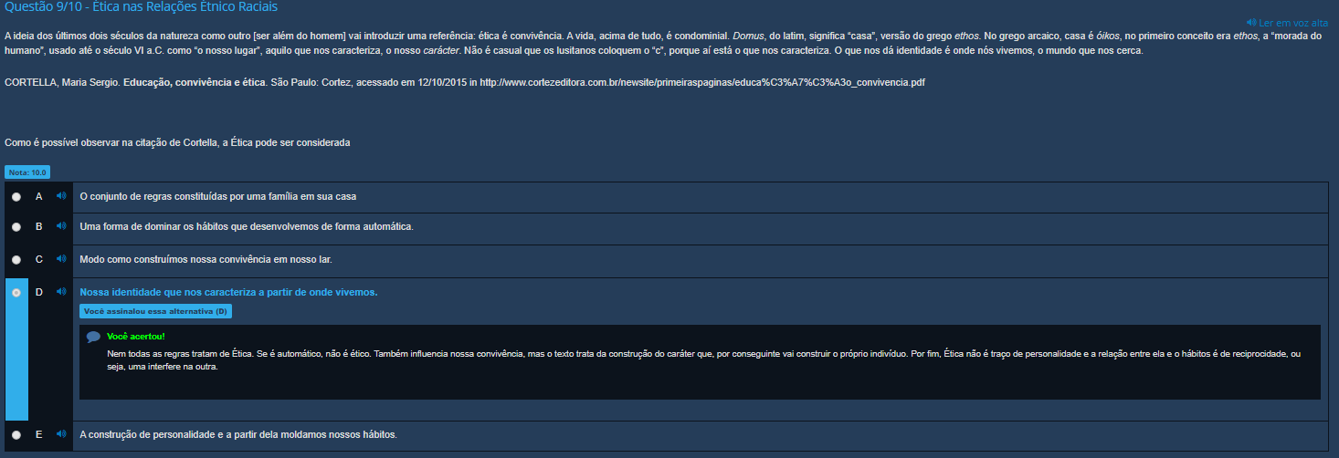 Questão 9/10 nas Relações Etnico Raciais Ler em voz alta A ideia dos últimos dois séculos da natureza como outro [ser além do vai introduzir uma referência: ética é convivência A vida, acima de tudo, é do latim, significa versão do grego ethos. No grego casa é no primeiro conceito era a "morada do humano", usado até século VI a.C. como nosso aquilo que nos nosso Não é casual que os lusitanos coloquem porque está que nos O que nos dá identidade é onde nós vivemos, mundo que nos cerca Maria Sergio. Educação, convivência e ética. São Paulo: Cortez, acessado em Como é possível observar na citação de a Ética pode ser considerada Nota: 10.0 A conjunto de regras constituídas por uma família em sua casa Uma forma de dominar os hábitos que desenvolvemos de forma automática Modo como construímos nossa convivência em nosso Nossa identidade que nos caracteriza a partir de onde assinalou essa alternativa (D) Você acertou! Nem todas as regras tratam de Se é não é influencia nossa convivência, mas texto trata da construção do caráter que, por conseguinte vai construir próprio Por fim, não é traço de personalidade e a relação entre ela e o hábitos é de ou seja, uma interfere na outra E A construção de personalidade e a partir dela moldamos nossos hábitos