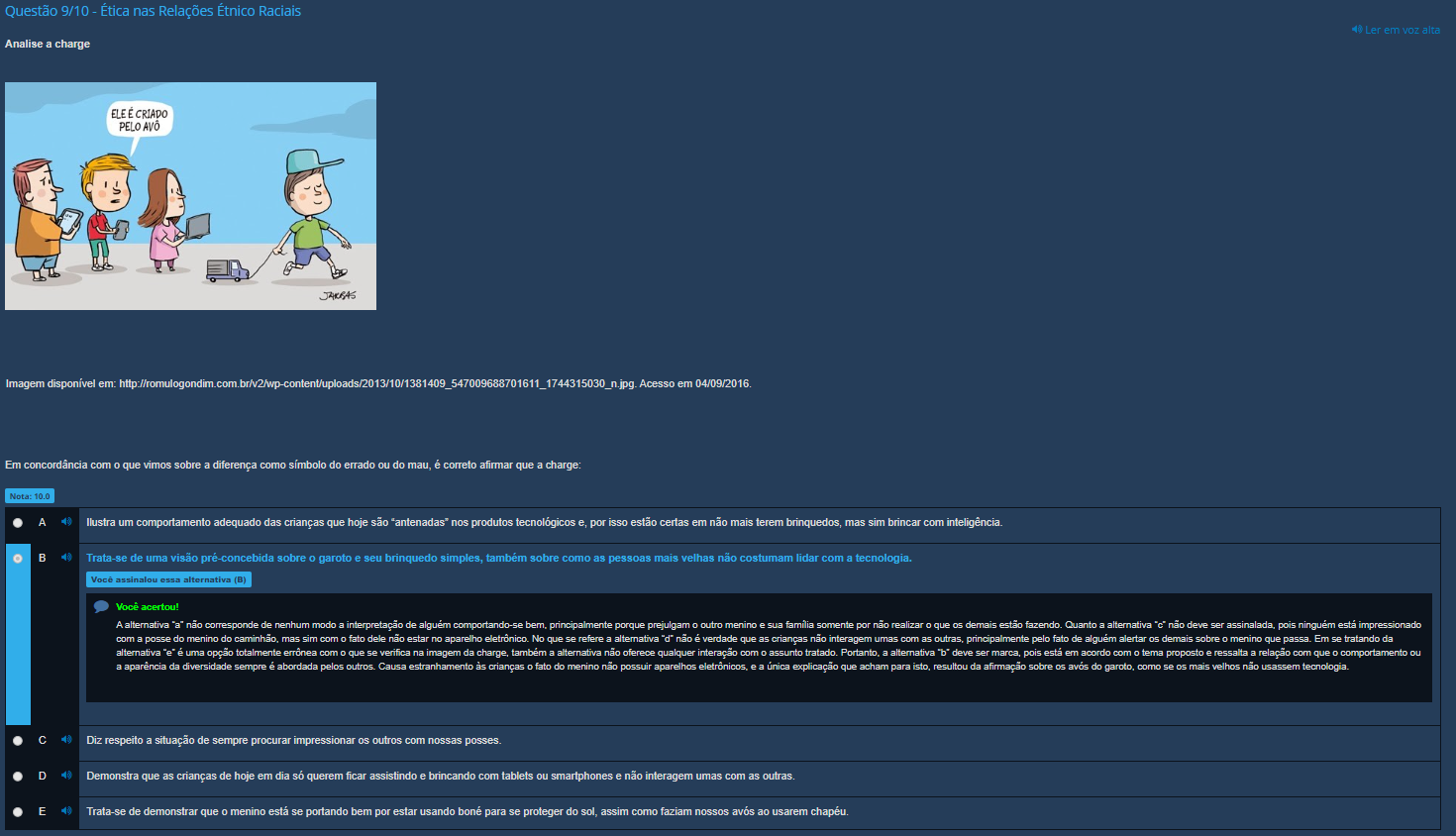 Ler em voz alta Questão 9/10 - Ética nas Relações Étnico Raciais Analise a charge CRIADO Imagem disponível em: 1744315030 Acesso em 04/09/2016 Fm concordância com que vimos sobre a diferença como símbolo do errado ou do é correto afirmar que a charge: Nota: 10.0 A Ilustra um comportamento adequado das crianças que hoje são nos produtos tecnológicos e, por isso estão certas em não mais terem brinquedos mas sim brincar com inteligência. 4 Trata-se de uma visão pré-concebida sobre garoto e seu brinquedo simples, também sobre como as pessoas mais velhas não costumam lidar com a tecnologia. assinalou essa alternativa (B) Você acertou! interpretação de alguém comportando-se bem, principalmente porque prejulgam outro e sua família somente por não realizar que demais estão Quanto a alternativa "c" demais não deve sobre ser assinalada, menino pois passa. ninguém Em se está tratando impressionado da A com alternativa "a" não menino corresponde do de nenhum mas sim modo com a fato dele não estar no aparelho No que se refere a alternativa não é verdade que as crianças não interagem umas com as outras, principalmente pelo está fato em de acordo alguém com alertar tema proposto e ressalta a relação que com que comportamento ou a posse do errônea verifica na imagem da charge, também a alternativa não oferece qualquer interação com assunto Portanto, a alternativa deve ser pois mais velhos não usassem tecnologia. a alternativa aparência "e" da é diversidade uma opção sempre totalmente é abordada com pelos outros. que se Causa estranhamento às crianças fato do mening não possui aparelhos eletrônicos e a única explicação que acham para resultou da afirmação sobre os avos do garoto, como se os C Diz respeito a situação de sempre procurar impressionar outros com nossas D Demonstra que as crianças de hoje em dia só querem ficar assistindo e brincando com tablets ou smartphones e não interagem umas com as E 4 Trata-se de demonstrar que menino está se portando bem por estar usando boné para se proteger do assim como faziam nossos ao usarem chapéu