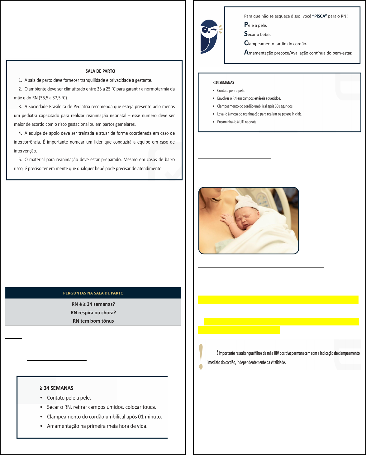 NEONATOLOGIA· Neonato : do nascimento até 28 dias de vida. · É fundamental ao pediatra conhecer a história materna, não só gestacional como também pessoal. Um pré natal bem feito, aliado a um médico informado, diminui o risco de morbidade e mortalidade no período neonatal. RECEPÇÃO DO NEONATO Para avaliar a vitalidade de qualquer recém nascido, devemos ter em mente três parâmetros importantes : 1. Idade gestacional: separar entre os menores e os maiores/iguais a 34 semanas. Determina a diretriz que será utilizada. 2. Respiração: devemos avaliar a presença de respiração regular ou choro forte. 3. Tônus: o RN deve apresentar tônus flexor. OBS: O aspecto do líquido amniótico não faz parte da avaliação da vitalidade do RN ! · Se tivermos sim para RN RESPIRA OU CHORA? RN TEM BOM TÔNUS? Devemos: · TOUCA DUPLA CONTATO PELE A PELE Ele ocorre quando o RN despido é colocado no tórax ou abdome da mãe, também despida. CLAMPEAMENTO TARDIO DO CORDÃO As vantagens do método são: • Aumentar o nível de hemoglobina no bebê e, com isso, diminuir a ocorrência de anemia neonatal e do lactente (3 a 6 meses de idade) e de transfusões sanguíneas. • Redução de hemorragias intracranianas, enterocolite necrosante e sepse neonatal. REANIMAÇÃO NEONATAL DOS ≥ A 34 SEMANAS PASSOS INICIAIS: Os objetivos desse passo são: manter a normotermia (36,5 a 37,5 °C) e as vias aéreas pérvias. O tempo de realização desses passos deve ser de 30 segundos. MANUTENÇÃO DA HIPOTERMIA: • Manter o ambiente com temperatura controlada entre 23 e 26 °C. • Colocar o RN sob fonte de calor radiante. • Secar, remover campos úmidos e colocar touca. MANUTENÇÃO DAS VIAS AÉREAS: • Posicionar a cabeça e o pescoço do RN em leve extensão para abrir as vias aéreas. • Aspirar a boca primeiro e, depois, as narinas do RN, delicadamente, apenas se houver excesso de secreções em vias aéreas! A boca deve ser aspirada primeiro para minimizar o risco de broncoaspiração. · Após essas manobras, avaliamos a frequência cardíaca e o ritmo respiratório para decidir se há necessidade de IR EM FRENTE. MELHOR MÉTODO PARA MENSURAR A FC : 1- é o monitor cardíaco, ele deve ser locado sempre que a reanimação for iniciada. 2- Oxímetro de pulso ( porém demorar mensurar e pode subestimar a FC ). 3- Ausculta do précordio ( porem também subestima) SE o RN estiver em : apneia, respiração irregular ou bradicárdico (FC menor do que 100 bpm) siga para o próximo passo, que é a ventilação com pressão positiva . VENTILAÇÃO COM PRESSÃO POSITIVA COM BALÃO E MÁSCARA Esse passo deve durar 30 segundos. AMAMENTAÇÃO NA PRIMEIRA MEIA HORA DE VIDA A amamentação deve ser incentivada ainda na sala de parto, na primeira hora de vida, trazendo vantagens para a mãe e para o bebê, por exemplo: • A sucção estimula a produção de ocitocina materna, que auxilia na contração uterina e diminui o risco de hemorragias no pós-parto. • Aumentar o vínculo entre a mãe e o bebê, a chance de sucesso do aleitamento materno exclusivo e a apojadura do colostro. REANIMAÇÃO NEONATAL RN COM POUCA VITALIDADE Por fim, vamos à segunda resposta, RNs em apneia, respiração irregular ou hipotonia! • Tentar estímulo tátil. • Clampear o cordão de imediato. • Iniciar a reanimação neonatal. ( Chamamos esses bebes de DEPRIMIDOS) A primeira coisa a ser feita é tentar um estímulo tátil no dorso por, no máximo, duas vezes. · Se o neonato SIM responder, encaminhamos para o contato pele a pele e procedemos com o clampeamento tardio. · Se NÃO, clampeamos o cordão de imediato e precisamos iniciar a reanimação neonatal. Compressão x ventilação A proporção compressão x ventilação deve ser de 3:1, ou seja, 3 compressões para cada ventilação, e deve ser realizada por 60 segundos. A avaliação após o ciclo deve ser realizada, de preferência, por monitor cardíaco. Agora, vamos aos possíveis desfechos. 1. Caso o RN apresente FC maior do que 60 bpm, interrompemos a massagem cardíaca e persistimos na ventilação. 2. Se o RN apresentar FC maior do que 100 bpm e respiração espontânea, podemos interromper também a ventilação. 3. Agora, caso a técnica esteja correta e o bebê persistir com a frequência menor do que 60 bpm, partimos para o próximo passo, o mais invasivo deles: cateterismo umbilical e administração de medicações, principalmente a adrenalina. MEDICAÇÕES EM SALA DE PARTO A adrenalina deve estar previamente preparada, diluída em soro fisiológico na proporção 1:10.000 (1 mL de adrenalina + 9 mL de soro fisiológico 0,9%) Nas diretrizes de 2022, a infusão foi padronizada para a dose de 0,02 mg/kg (0,2 mL/kg) via endovenosa e pode ser repetida a cada 3 a 5 minutos. Se via endotraqueal, 0,1 mg/kg (1 mL/kg). A via endotraqueal pode ser utilizada uma única vez. · Quando iniciamos a reanimação neonatal, é indicado que uma segunda pessoa coloque o oxímetro de pulso em membro superior direito. · Os neonatos demoram até 10 minutos para subir a saturação. · Revisão da VPP Após cada passo da reanimação, se não houver melhora, está indicada a revisão da técnica para saber se ela está sendo efetiva ou há alguma falha de equipamento ou execução. MÁSCARA LARÍNGEA A possibilidade de utilizarmos a máscara laríngea como interface de ventilação. Considerar máscara laríngea VPP antes de intubar o RN. Porém, os critérios para que ela seja utilizada são: RN ≥ 34 semanas e/ou ≥ 2000g. Caso não seja efetivo, seguimos para intubação orotraqueal. INTUBAÇÃO OROTRAQUEAL · Deve ser realizada pelo médico mais experiente e deve durar até 30 segundos. ( se falhar reiniciamos VPP) · Devemos ventilar com tubo endotraqueal por mais 30 segundos e, após, reavaliar frequência cardíaca e ritmo respiratório. Não se esqueça de revisar a técnica! · Agora, podemos ter três desfechos. 1- FC >100 + Ritmo respiratório regular (aquele b