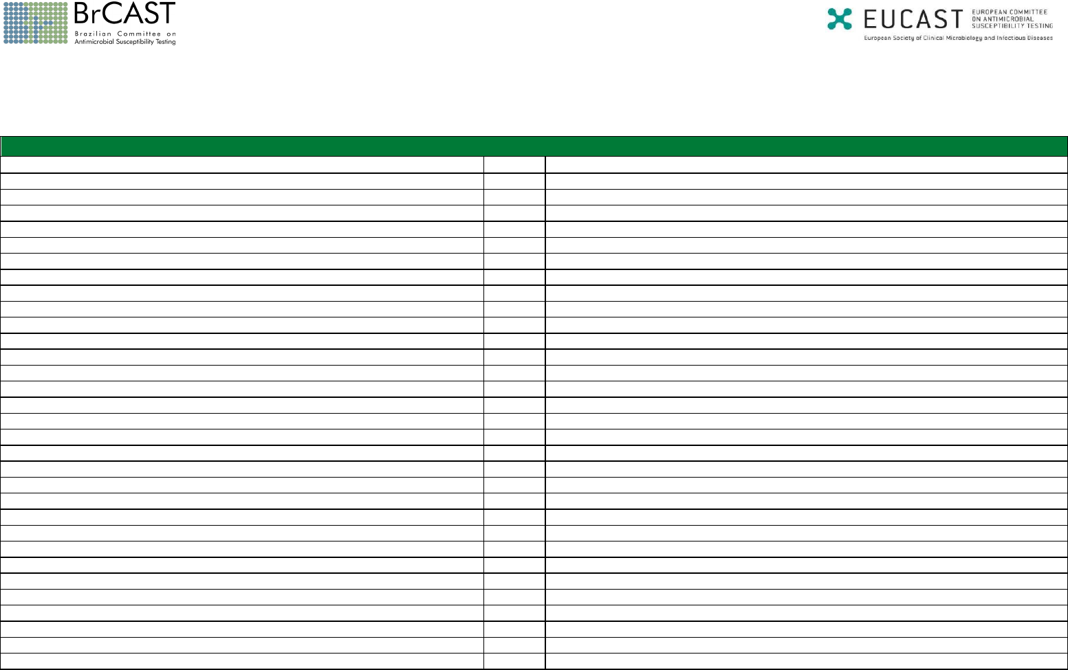 Conteúdo Página Informação adicional Alterações 3 Notas 8 Orientações para leitura das tabelas de pontos de corte do BrCAST-EUCAST 10 Dosagens utilizadas para definir pontos de corte 11 Informações sobre incerteza técnica (AIT) 16 Enterobacterales 18 Pseudomonas spp. 24 Stenotrophomonas maltophilia 27 Hiperlink para Documento de Orientação sobre Stenotrophomonas maltophilia Acinetobacter spp. 29 Staphylococcus spp. 32 Enterococcus spp. 38 Streptococcus dos grupos A, B, C e G 42 Streptococcus pneumoniae 46 Streptococcus do grupo viridans 50 Haemophilus influenzae 54 Moraxella catarrhalis 59 Neisseria gonorrhoeae 61 Neisseria meningitidis 63 Anaeróbios 65 Helicobacter pylori 69 Listeria monocytogenes 70 Pasteurella spp. 71 Campylobacter jejuni e C. coli 73 Corynebacterium spp. exceto C. diphtheriae e C. ulcerans 74 Corynebacterium diphtheriae e C. ulcerans 76 Aerococcus sanguinicola e A. urinae 78 Kingella kingae 80 Aeromonas spp. 82 Achromobacter xylosoxidans 84 Vibrio spp. 86 Bacillus spp. (exceto Bacillus anthracis ) 88 Brazilian Committee on Antimicrobial Susceptibility Testing - BrCAST Tabelas de pontos de corte para interpretação de CIMs e diâmetros de halos Este documento, exceto onde indicado, é baseado nos pontos de corte da versão 15.0, 2025 do EUCAST(www.eucast.org) - Versão BrCAST válida a partir de 01-02-2025 Comitê Brasileiro de Testes de Sensibilidade aos Antimicrobianos - http://www.brcast.org.br https://www.eucast.org/eucastguidancedocuments/ https://www.eucast.org/eucastguidancedocuments/ http://www.eucast.org/ http://www.brcast.org.br/ Bacillus anthracis 89 Brucella melitensis 91 Burkholderia pseudomallei 92 Complexo Burkholderia cepacia 94 Hiperlink para Documento de Orientação sobre o complexo Burkholderia cepacia Legionella pneumophila 95 Hiperlink para Documento sobre Legionella pneumophila Mycobacterium tuberculosis 96 Agentes Tópicos 97 Hiperlink para Documento de Orientação do EUCAST sobre Agentes Tópicos Valores de corte PK/PD 98 Regras de Especialistas - Hiperlink para Regras de Especialistas do BrCAST-EUCAST Detecção de Mecanismos de Resistência - Hiperlink para Documento de Detecção de Mecanismos de Resistência Testes de sensibilidade antimicrobiana em grupos de organismos ou de antimicrobianos para os quais não há pontos de corte do BrCAST-EUCAST - Hiperlink para Documento de Orientação sobre como testar e interpretar resultados quando não há pontos de corte Orientação sobre pontos de corte entre parênteses - Hiperlink para Documento sobre pontos de corte entre parênteses Orientação sobre testes de triagem - Hiperlink para Documento sobre testes de triagem Orientação sobre pontos de corte para endocardites Hiperlink para Documento de Orientação sobre pontos de corte para endocardites Guia de leitura do BrCAST-EUCAST para microdiluição em caldo - Hiperlink para Guia de leitura do BrCAST-EUCAST para microdiluição em caldo Guia de leitura do BrCAST-EUCAST para disco-difusão - Hiperlink para Guia de leitura do BrCAST-EUCAST para disco-difusão 2 https://www.eucast.org/eucastguidancedocuments/ https://www.eucast.org/eucastguidancedocuments/ https://www.eucast.org/eucastguidancedocuments/ https://www.eucast.org/eucastguidancedocuments/ https://www.eucast.org/eucastguidancedocuments/ https://brcast.org.br/documentos/ http://brcast.org.br/documentos/ https://brcast.org.br/documentos/ https://brcast.org.br/documentos/ https://www.eucast.org/eucastguidancedocuments https://www.eucast.org/eucastguidancedocuments https://www.eucast.org/eucastguidancedocuments/ https://brcast.org.br/documentos/ https://brcast.org.br/documentos/ Versão 15.0, EUCAST Versão BrCAST 01-02-2025 Alterações (células contendo alguma alteração, deleção ou adição) em relação à versão de 13-04-2024 estão marcadas em amarelo. Notas modificadas ou adicionadas estão sublinhadas. Notas removidas estão escritas com fonte tachada. Geral • Cefepima-enmetazobactam e aztreonam-avibactam adicionados. Os novos agentes não são listados como novos pontos de corte na lista de alterações quando adicionados como traço "-", IE ou Nota. • Hiperlink para documentos de orientação adicionado no topo de cada tabela. • A menos que indicado de outra forma, os pontos de corte são válidos também para situações especiais, como endocardite e meningite para espécies e agentes relevantes. Os pontos de corte para endocardite e meningite são listados em linhas separadas apenas quando diferem dos pontos de corte gerais. Para obter informações sobre espécies e agentes em endocardite, consultar https://www.eucast.org/eucastguidancedocuments/. • Comentários específicos sobre endocardite e meningite nos fluxogramas para triagem de resistência a betalactâmicos em S. pneumoniae e H. influenzae são mantidos apenas se as recomendações não forem cobertas pelas recomendações gerais. Notas Notas novas • Nota 7 Notas revisadas • Nota 2 • Nota 9 • Nota 19 Dosagens • Informações sobre pontos de corte do EUCAST e dosagem para locais de infecção desafiadores e sobre situações especiais para tratamento antimicrobiano são adicionadas abaixo da tabela de dosagens Dosagens novas • Cefepima-enmetazobactam • Aztreonam-avibactam Dosagens revisadas • Benzilpenicilina Comentários novos • Cefazolina, cefepima e cefuroxima iv Comentários revisados • Benzilpenicilina • Cefaclor Tabelas de pontos de corte para interpretação de CIMs e diâmetros de halos de inibição Versão BrCAST válida a partir de 01-02-2025 Brazilian Committee on Antimicrobial Susceptibility Testing - BrCAST Comitê Brasileiro de Testes de Sensibilidade aos Antimicrobianos - http://www.brcast.org.br 3 Versão 15.0, EUCAST Versão BrCAST 01-02-2025 Alterações (células contendo alguma alteração, deleção ou adição) em relação à versão de 13-04-2024 estão marcadas em amarelo. Notas modificadas ou adicionadas estão sublinhadas. Notas removid