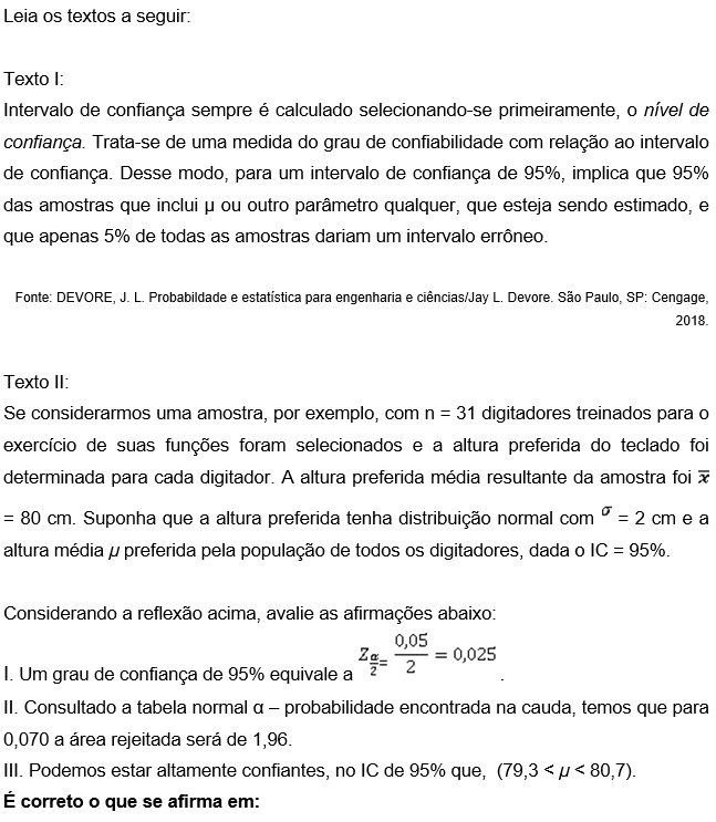 Leia os textos a seguir: Texto I: Intervalo de confiança sempre é calculado selecionando-se primeiramente, o nível de confiança. Trata-se de uma medida do grau de confiabilidade com relação ao intervalo de confiança. Desse modo, para um intervalo de confiança de implica que 95% das amostras que inclui ou outro parâmetro qualquer, que esteja sendo estimado, e que apenas 5% de todas as amostras dariam um intervalo Fonte: DEVORE, J. L. Probabildade e estatística para engenharia e ciências/Jay L. Devore São Paulo, SP: 2018. Texto II: Se considerarmos uma amostra, por exemplo, com n = 31 digitadores treinados para o exercício de suas funções foram selecionados e a altura preferida do teclado foi determinada para cada digitador. A altura preferida média resultante da amostra foi x = 80 cm. Suponha que a altura preferida tenha distribuição normal com = 2 cm e a altura média preferida pela população de todos os digitadores, dada o IC = Considerando a reflexão acima, avalie as afirmações abaixo: 0.05 I. Um grau de confiança de 95% equivale a II. Consultado a tabela normal a - probabilidade encontrada na cauda, temos que para 0,070 a área rejeitada será de 1,96. III. Podemos estar altamente confiantes, no IC de 95% que, É correto o que se afirma em: