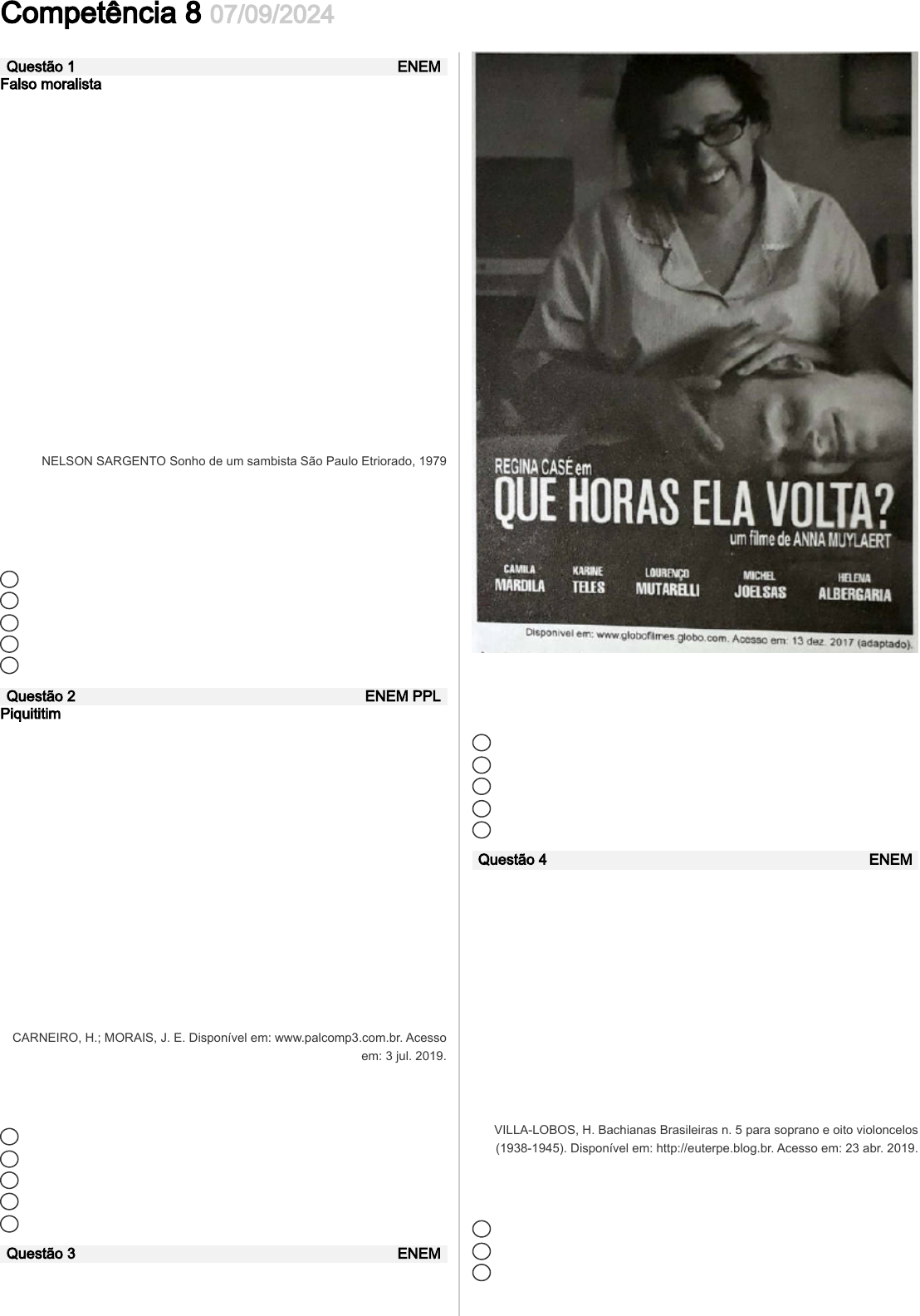 Competência 8 07/09/2024 ENEMQuestão 1 Falso moralista Você condena o que a moçada anda fazendo e não aceita o teatro de revista arte moderna pra você não vale nada e até vedete você diz não ser artista Você se julga um tanto bom e até perfeito Por qualquer coisa deita logo falação Mas eu conheço bem o seu defeito e não vou fazer segredo não Você é visto toda sexta no Joá e não é só no Carnaval que vai pros bailes se acabar Fim de semana você deixa a companheira e no bar com os amigos bebe bem a noite inteira Segunda-feira chega na repartição pede dispensa para ir ao oculista e vai curar sua ressaca simplesmente Você não passa de um falso moralista As letras de samba normalmente se caracterizam por apresentarem marcas informais do uso da língua. Nessa letra de Nelson Sargento, são exemplos dessas marcas a “falação” e “pros bailes”. b “você” e “teatro de revista”. c “perfeito” e “Carnaval”. d “bebe bem” e “oculista”. e “curar e "falso moralista”. ENEM PPLQuestão 2 Piquititim Se eu fosse um passarim Destes bem avoadô Destes bem piquititim Assim que nem beija-flor Avoava do gaim e assentava sem assombro Nas grimpinha do seu ombro Mode beijá seus beicim E se ocê deixasse as veiz Com um fio do seu cabelim No prazo de quaiz um mês Eu fazia nosso nin Aí sei que dessa veiz Em poquim tempo dispoiz Nóis largava de ser dois Pra ser quatro, cinco ou seis A estratégia linguística predominante na configuração regional da linguagem representada na letra de canção é o(a) a ausência da marca de concordância nominal. b redução da sílaba final de determinadas palavras. c emprego de vocabulário característico da fauna brasileira. d uso da regra variável de concordância verbal. e supressão do R na sílaba final dos vocábulos. ENEMQuestão 3 A frase, titulo do filme, reproduz uma variedade linguística recorrente na fala de muitos brasileiros. Essa estrutura caracteriza-se pelo(a) a uso de uma marcação temporal. b imprecisão do referente de pessoa. c organização interrogativa da frase. d utilização de um verbo de ação. e apagamento de uma preposição. ENEMQuestão 4 lrerê, meu passarinho do sertão do Cariri, Irerê, meu companheiro, Cadê viola? Cadê meu bem”? Cadê Maria? Ai triste sorte a do violeiro cantadô! Ah! Sem a viola em que cantava o seu amô, Ah! Seu assobio é tua flauta de irerê: Que tua flauta do sertão quando assobia, Ah! A gente sofre sem querê! Ah! Teu canto chega lá no fundo do sertão, Ah! Como uma brisa amolecendo o coração, Ah! Ah! lrerê, solta teu canto! Canta mais! Canta mais! Prá alembrá o Cariri! Nesses versos, há uma exaltação ao sertão do Cariri em uma ambientação linguisticamente apoiada no(a) a uso recorrente de pronomes. b variedade popular da língua portuguesa. c referência ao conjunto da fauna nordestina. NELSON SARGENTO Sonho de um sambista São Paulo Etriorado, 1979 CARNEIRO, H.; MORAIS, J. E. Disponível em: www.palcomp3.com.br. Acesso em: 3 jul. 2019. VILLA-LOBOS, H. Bachianas Brasileiras n. 5 para soprano e oito violoncelos (1938-1945). Disponível em: http://euterpe.blog.br. Acesso em: 23 abr. 2019. d exploração de instrumentos musicais eruditos. e predomínio de regionalismos lexicais nordestinos. ENEMQuestão 5 O homem disse, Está a chover, e depois, Quem é você,,Não sou daqui, Anda à procura de comida, Sim, há quatro dias que não comemos, E como sabe que são quatro dias, E um cálculo, Está sozinha, Estou com o meu marido e uns companheiros, Quantos são, Ao todo, sete, Se estão a pensar em ficar conosco, tirem daí o sentido, já somos muitos, Só estamos de passagem, Donde vêm, Estivemos internados desde que a cegueira começou, Ah, sim, a quarentena, não serviu de nada, Por que diz isso, Deixaram-nos sair, Houve um incêndio e nesse momento percebemos que os soldados que nos vigiavam tinham desaparecido, E saíram, Sim, Os vossos soldados devem ter sido dos últimos a cegar, toda a gente está cega, Toda a gente, a cidade toda, o país, A cena retrata as experiências das personagens em um país atingido por uma epidemia. No diálogo, a violação de determinadas regras de pontuação a revela uma incompatibilidade entre o sistema de pontuação convencional e a produção do gênero romance. b provoca uma leitura equivocada das frases interrogativas e prejudica a verossimilhança. c singulariza o estilo do autor e auxilia na representação do ambiente caótico. d representa uma exceção às regras do sistema de pontuação canônica. e colabora para a construção da identidade do narrador pouco escolarizado. ENEMQuestão 6 Zé Araújo começou a cantar num tom triste, dizendo aos curiosos que começaram a chegar que uma mulher tinha se ajoelhado aos pés da santa cruz e jurado em nome de Jesus um grande amor, mas jurou e não cumpriu, fingiu e me enganou, pra mim você mentiu, 'pra Deus você pecou, o coração tem razões que a própria razão desconhece, faz promessas e juras, depois esquece. O caboclo estava triste e inspirado. Depois dessa canção que arrepiou os cabelos da Neusa, emendou com uma valsa mais arretada ainda, cheia de palavras difíceis, mas bonita que só a gota serena. Era a história de uma boneca encantadora vista numa vitrine de cristal sobre o soberbo pedestal. Zé Araújo fechava os olhos e soltava a voz: Seus cabelos tinham a cor/ Do sol a irradiar/ Fulvos raios de amor./ Seus olhos eram circúnvagos/ Do romantismo azul dos lagos/ Mãos liriais, uns braços divinais,/ Um corpo alvo sem pari E os pés muito pequenos./ Enfim eu vi nesta boneca/ Uma perfeita Vênus. O comentário do narrador do romance "[ ... ] emendou com uma valsa mais arretada ainda, cheia de palavras difíceis, mas bonita que só a gota serena" relaciona-se ao fato de que essa valsa é representativa de uma variedade linguística a detentora de grande prestígio social. b específica da modalidade oral da língua. c previsível p