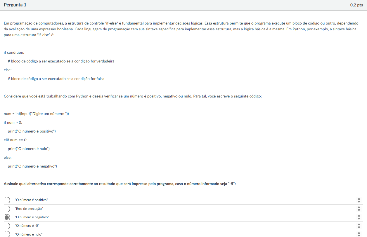 Pergunta 1 0,2 pts Em programação de computadores, a estrutura de controle "if-else" é fundamental para implementar decisões lógicas. Essa estrutura permite que programa execute um bloco de código ou outro, dependendo da avaliação de uma expressão booleana. Cada linguagem de programação tem sua sintaxe específica para implementar essa mas a lógica básica é a mesma. Em Python, por exemplo, a sintaxe básica para uma estrutura "if-else" é: if condition: # bloco de código a ser executado se a condição for verdadeira else: # bloco de código a ser executado se a condição for falsa Considere que você está trabalhando com Python e deseja verificar se um número é positivo, negativo ou Para você escreve seguinte código: num - int(input("Digite um numero: ")) if num print("O é positivo") elif num == print("O numero é nulo") else: print("O numero é negativo") Assinale qual alternativa corresponde corretamente ao resultado que será impresso pelo programa, caso numero informado seja "-5": "O número é "Erro de execução" "O número é "O número é número é nulo"
