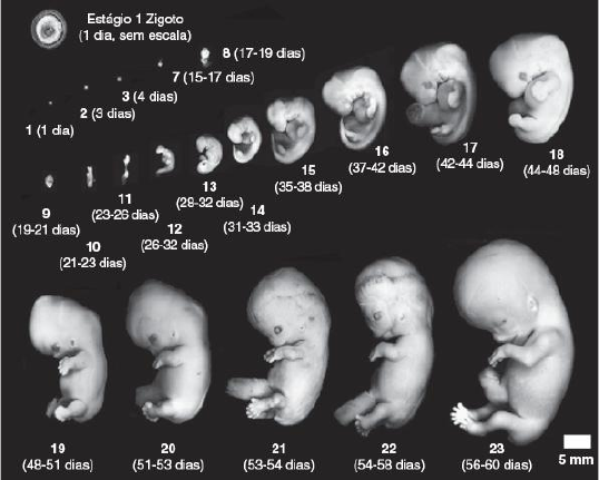 DESENVOLVIMENTO EMBRIONÁRIO E GESTACIONAL • FASE EMBRIONÁRIA X FASE FETAL o A fase embrionária começa com a fertilização e dura 8 semanas. o A fase fetal é da 10ª semana da gravidez (contando da DUM) até o parto. • IDADE GESTACIONAL X IDADE FETAL o Idade gestacional (IG) ▪ Refere-se ao tempo desde o primeiro dia da DUM até a data atual. ▪ É a diferença entre 14 dias antes da data da concepção e o dia do parto. ▪ Obstetras -> dia 1 da gravidez o dia da DUM; a partir dele, a cada 7 dias, completa- se uma semana de gestação. • Nas 2 primeiras semanas de gravidez, a mulher não está grávida (1ª semana - > menstruada) -> a fecundação acontece na terceira semana de gestação. • Ex: gestante com 8 semanas de gestação -> bebê que surgiu há cerca de 6 semanas; grávida com 40 semanas -> bebê com cerca de 38. ▪ Utilizar o último período menstrual para determinar a IG não determina a IE real do feto, mas é o padrão universal entre obstetras para discutir a maturação fetal. o Idade fetal/embrionária (IF/IE) ▪ É o tempo desde a fecundação (concepção) até a data atual. ▪ É 2 semanas menor que a idade gestacional. o Idade gestacional é duas semanas a frente da idade fetal. DESENVOLVIMENTO EMBRIONÁRIO • O desenvolvimento inicia-se com a fecundação, quando o espermatozoide se funde com o óvulo para dar origem ao ovo. • 23 estágios Carnegie o Os estágios Carnegie receberam o nome do Instituto Americano que começou a coletar e classificar embriões no início dos anos 1900. o O período embrionário humano propriamente dito é dividido em 23 estágios, abrangendo as primeiras 8 semanas pós-ovulação (10ª semana de IG). o São baseados no desenvolvimento morfológico externo e/ou interno do embrião e não dependem diretamente da idade ou do tamanho, embora cada um corresponda a uma IF aproximada pós-fertilização e tamanho em termos de comprimento cabeça-nádega. 1, folículo primário inicial; 2, folículo em crescimento; 3, folículo secundário; 4, folículo se aproximando da maturidade; 5, folículo maduro; 6, oócito. • Primeira Semana: Segmentação, Formação da Mórula e Blastocisto, Início da Implantação • Após a fertilização, o ovo (zigoto) percorre a tuba uterina em direção ao útero, passando por divisões mitóticas rápidas (segmentação), formando os blastômeros. • No 3º dia, o embrião atinge o estágio de mórula (com 16 ou mais blastômeros) e penetra na cavidade uterina. • No 4º dia, forma-se uma cavidade interna na mórula, originando o blastocisto/blástula, composto por: o Embrioblasto: grupo de células internas que formarão o embrião (no polo embrionário); o Blastocele ou cavidade blastocística: cavidade central; o Trofoblasto: camada externa que envolve embrioblasto e blastocele. • Entre o 4º e 5º dias, o blastocisto permanece livre na cavidade uterina. • No 5º dia, ocorre a degeneração da zona pelúcida. • No 7º dia, inicia-se a implantação: o As células do trofoblasto começam a invadir o epitélio do endométrio. o O trofoblasto diferencia-se em: ▪ Citotrofoblasto ou células de Langhans (células individuais) -> camada interna; ▪ Sinciciotrofoblasto (massas protoplasmáticas multinucleadas, sem limites celulares nítidos) -> camada externa. o O sinciciotrofoblasto começa a invadir o epitélio e estroma do endométrio. • Concomitantemente com a implantação do blastocisto, o embrioblasto inicia a formação da primeira camada germinativa (são 3), o endoderma embrionário. • Ao final da 1ª semana, o blastocisto encontra-se superficialmente implantado no endométrio. • Segunda Semana: Formação do Disco Embrionário Bilaminar e Desenvolvimento do Trofoblasto Modificações no Trofoblasto: • O trofoblasto diferencia-se completamente em: o Citotrofoblasto (interna) -> células mononucleadas; essencial para a formação da placenta; há atividade mitótica; se replica rapidamente e migra para a periferia para sustentar o sinciciotrofoblasto em crescimento. o Sinciciotrofoblasto (externa) -> células multinucleadas; não há atividade mitótica; penetra no endométrio para que o blastocisto fique bastante aderido; (sob a influência do LIF) começa a produzir gonadotrofina coriônica humana (β-hCG). o Obs: as células deciduais – fibroblastos poligonais no endométrio que controlam a profundidade da penetração do blastocisto – estão aumentadas. Ovo de 8 dias. • Lacunas surgem no sinciciotrofoblasto e se unem, formando a rede lacunar. • O trofoblasto erode os sinusoides maternos, permitindo o fluxo de sangue materno para a rede lacunar, formando a circulação uteroplacentária primitiva. Ovo de 9 dias. Ovo de 12 dias completamente implantado. • Surgem as vilosidades coriônicas primárias na superfície do saco coriônico. • A implantação se completa, e o blastocisto fica completamente imerso no endométrio. • A resposta das alterações do endométrio à implantação é chamada de reação decidual. Desenvolvimento das vilosidades primárias. A. Detalhe ampliado da área delimitada em B, mostrando a parede do saco coriônico com as vilosidades primárias. B. Ovo de 14 dias. C. Secção transversal de uma vilosidade primária. Formação das Cavidades e Membranas: • Origina-se o mesoderma extraembrionário a partir da superfície interna do trofoblasto, a cavidade blastocística diminui e passa a se chamar vesícula vitelina primitiva. • Quando se forma o celoma extraembrionário, proveniente de espaços criados no mesoderma extraembrionário que se fundem, a vesícula vitelina primitiva torna-se menor e origina a vesícula vitelina secundária, constituindo o restante o saco vitelino. • De vesícula primária para secundária -> grandes porções da cavidade exocelômica são pinçadas para fora -> cistos exocelômicos. • O celoma extraembrionário se expande e transforma-se na cavidade coriônica. • O mesoderma extrae