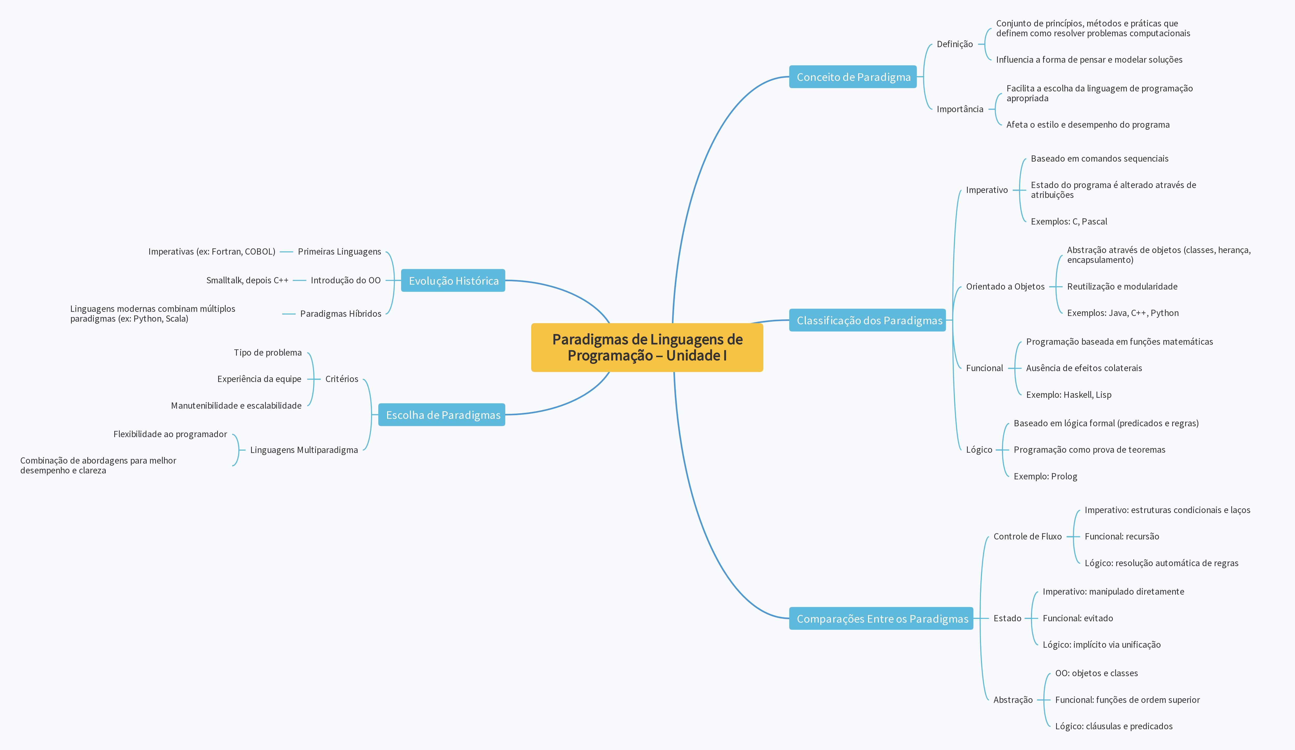 Conjunto de princípios, métodos e práticas que definem como resolver problemas computacionais Definição Influencia a forma de pensar e modelar soluções Conceito de Paradigma Facilita a escolha da linguagem de programação apropriada Importância Afeta o estilo e desempenho do programa Baseado em comandos sequenciais Estado do programa é alterado através de Imperativo atribuições Exemplos: C, Pascal Imperativas (ex: Fortran, COBOL) Primeiras Linguagens Abstração através de objetos (classes, herança, encapsulamento) Smalltalk, depois C++ Introdução do Evolução Histórica Orientado a Objetos Reutilização e modularidade Linguagens modernas combinam múltiplos paradigmas (ex: Python, Scala) Paradigmas Híbridos Exemplos: Java, C++, Python Classificação dos Paradigmas Paradigmas de Linguagens de Programação baseada em funções matemáticas Tipo de problema Programação - Unidade I Funcional Ausência de efeitos colaterais Experiência da equipe Critérios Exemplo: Haskell, Lisp Manutenibilidade e escalabilidade Escolha de Paradigmas Baseado em lógica formal (predicados e regras) Flexibilidade ao programador Linguagens Multiparadigma Lógico Programação como prova de teoremas Combinação de abordagens para melhor desempenho e clareza Exemplo: Prolog Imperativo: estruturas condicionais e laços Controle de Fluxo Funcional: recursão Lógico: resolução automática de regras Imperativo: manipulado diretamente Comparações Entre os Paradigmas Estado Funcional: evitado Lógico: implícito via unificação OO: objetos e classes Abstração Funcional: funções de ordem superior Lógico: cláusulas e predicados