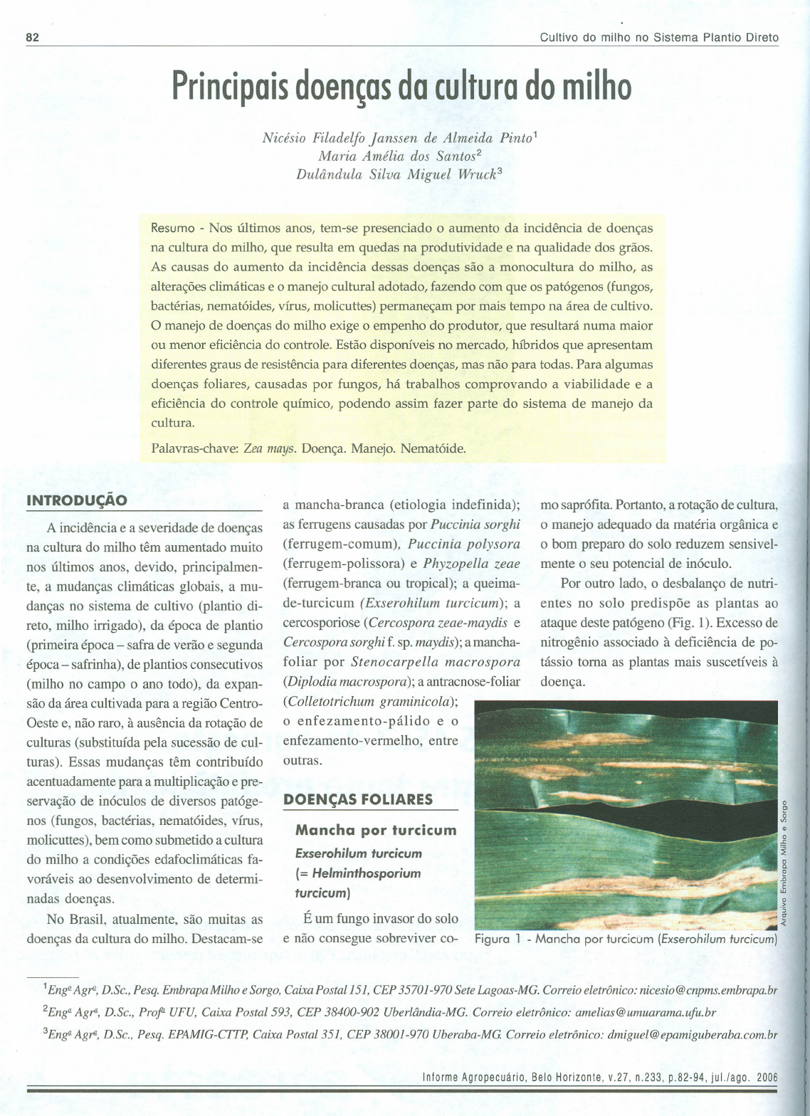 82 Cultivo do milho no Sistema Plantio Direto Principais doenças da cultura do milho Nicésio Filadelfo janssen de Almeida Pinto 1 Maria Amélia dos Santos" Dulândula Silva Miguel WrucP mo saprófita. Portanto, a rotação de cultura, o manejo adequado da matéria orgânica e o bom preparo do solo reduzem sensivel- mente o seu potencial de inóculo. Por outro lado, o desbalanço de nutri- entes no solo predispõe as plantas ao ataque deste patógeno (Fig. 1). Excesso de nitrogênio associado à deficiência de po- tássio toma as plantas mais suscetíveis à doença. Resumo - Nos últimos anos, tem-se presenciado o aumento da incidência de doenças na cultura do milho, que resulta em quedas na produtividade e na qualidade dos grãos. As causas do aumento da incidência dessas doenças são a monocultura do milho, as alterações climáticas e o manejo cultural adotado, fazendo com que os patógenos (fungos, bactérias, nematóides, vírus, molicuttes) permaneçam por mais tempo na área de cultivo. O manejo de doenças do milho exige o empenho do produtor, que resultará numa maior ou menor eficiência do controle. Estão disponíveis no mercado, híbridos que apresentam diferentes graus de resistência para diferentes doenças, mas não para todas. Para algumas doenças foliares, causadas por fungos, há trabalhos comprovando a viabilidade e a eficiência do controle químico, podendo assim fazer parte do sistema de manejo da cultura. Palavras-chave: Zea mays. Doença. Manejo. Nematóide. INTRODUÇÃO A incidência e a severidade de doenças na cultura do milho têm aumentado muito nos últimos anos, devido, principalmen- te, a mudanças climáticas globais, a mu- danças no sistema de cultivo (plantio di- reto, milho irrigado), da época de plantio (primeira época - safra de verão e segunda época - safrinha), de plantios consecutivos (milho no campo o ano todo), da expan- são da área cultivada para a região Centro- Oeste e, não raro, à ausência da rotação de culturas (substituída pela sucessão de cul- turas). Essas mudanças têm contribuído acentuadamente para a multiplicação e pre- servação de inóculos de diversos patóge- nos (fungos, bactérias, nematóides, vírus, molicuttes), bem como submetido a cultura do milho a condições edafoclimáticas fa- voráveis ao desenvolvimento de determi- nadas doenças. No Brasil, atualmente, são muitas as doenças da cultura do milho. Destacam-se a mancha-branca (etiologia indefinida); as ferrugens causadas por Puccinia sorghi (ferrugem-comum), Puccinia polysora (ferrugem-polissora) e Phyzopella zeae (ferrugem-branca ou tropical); a queima- de-turcicum (Exserohilum turcicum); a cercosporiose (Cercospora zeae-maydis e Cercospora sorghi f. sp. maydis); a mancha- foliar por Stenocarpella macrospora (Diplodia macrospora); a antracnose-foliar (Colletotrichum graminicola); o enfezamento-pálido e o enfezamento-vermelho, entre outras. DOENÇAS FOLlARES Mancha por turcicum Exserohilum turcicum (= Helminthosporium turcicum) É um fungo invasor do solo e não consegue sobreviver co- Figura 1 o e>.g •o,f ~ oc. e .D .fi g "__ é' ..,...: - Moncha por turcicum (Exserohilum turcicum) 1Eng" Agf', D.Sc., Pesq. Embrapa Milho e Sorgo, Caixa Postal 151, CEP 35701-970 Sete Lagoas-MG. Correio eletrônico: nicesio@cnpms.embrapa.br 2Eng" Agf', D.Sc., Prol UFU, Caixa Postal 593, CEP 38400-902 Uberlândia-MG. Correio eletrônico: amelias@umuarama.ufu.br 3Eng" Agf', D.Sc., Pesq. EPAM1G-CTTp, Caixa Postal 351, CEP 38001-970 Uberaba-MG Correio eletrônico: dmiguel@epamiguberaba.com.br Informe Agropecuário, Belo Horizonte, v.27, n.233, p.82·94, jul./ago. 2006 Cultivo do milho no Sistema Plantio Direto 83 Mancha-branca Etiologia indefinida A medida de controle mais recomen- dada para a mancha-branca é a utilização de cultivares resistentes. Materiais comer- ciais de milho têm apresentado alta varia- bilidade no grau de resistência a esta doen- ça (Fig. 2). A alteração na época de plantio deve coincidir com a fase de suscetibilida- de do hospedeiro e ausência do patógeno. Em algumas regiões de ocorrência desta doença, sua severidade tem sido maior nos meses de dezembro a maio, não ocorrendo normalmente nos meses de julho a outu- bro. Figura 2 - Mancha-branca Ferrugem-comum Puccinia sorghi A ferrugem-comum do milho (Fig. 3) é favorecida por temperaturas entre 16°C e 23°C, alta umidade relativa e altitudes su- periores a 900 m. Por ser parasita obrigatório e apresentar ciclo completo, as principais medidas de controle são a utilização de cultivares resistentes, a eliminação de plan- tas hospedeiras alternativas e o controle químico. Ferrugem-branca ou tropical Physopella zeae A ferrugem-branca (Fig. 5) é de ocor- rência mais recente no Brasil. Nos últi- mos anos, disseminou-se de forrna que se tomou comum em muitas regiões do País. É favorecida por ambientes úmidos e por temperaturas moderadas a altas. Portan- to, por amplitude maior de temperatura que aquela mais favorável à ferrugem-polissora, apresentando grande capacidade de adap- ~ tação em diferentes ambientes. Em geral, Vl " apresenta maior severidade em locais de ~i baixa altitude e, principalmente, em plantios o _ ••~'·H'\fIIe tardios. Por ser parasita obrigatório e apre- .D .É sentar ciclos completos, as principais me- ~ '3 didas de controle para as três ferrugens ~ citadas são a utilização de cultivares resis- tentes, a eliminação de plantas hospedeiras e o controle químico. Figura 3 - Ferrugem-comum (Puccinia sorghi) Ferrugem-polissora Puccinia polysora A ferrugem-polissora (Fig. 4) é favo- recida por temperaturas em tomo de 27°C, umidade relativa alta e altitudes inferiores a 900 m. Altitudes superiores a 1.200 m são desfavoráveis à doença. Figura 5 - Ferrugem-branca ou tropical (Physopella zeae) o~ o Vl "o '"i oa. ~ .D .É Cercosporiose Cercospora zeae-maydis e C. sorghi f. sp. maydis ~ A cercosporiose (mancha-cinza-da- '3 ~ folha)