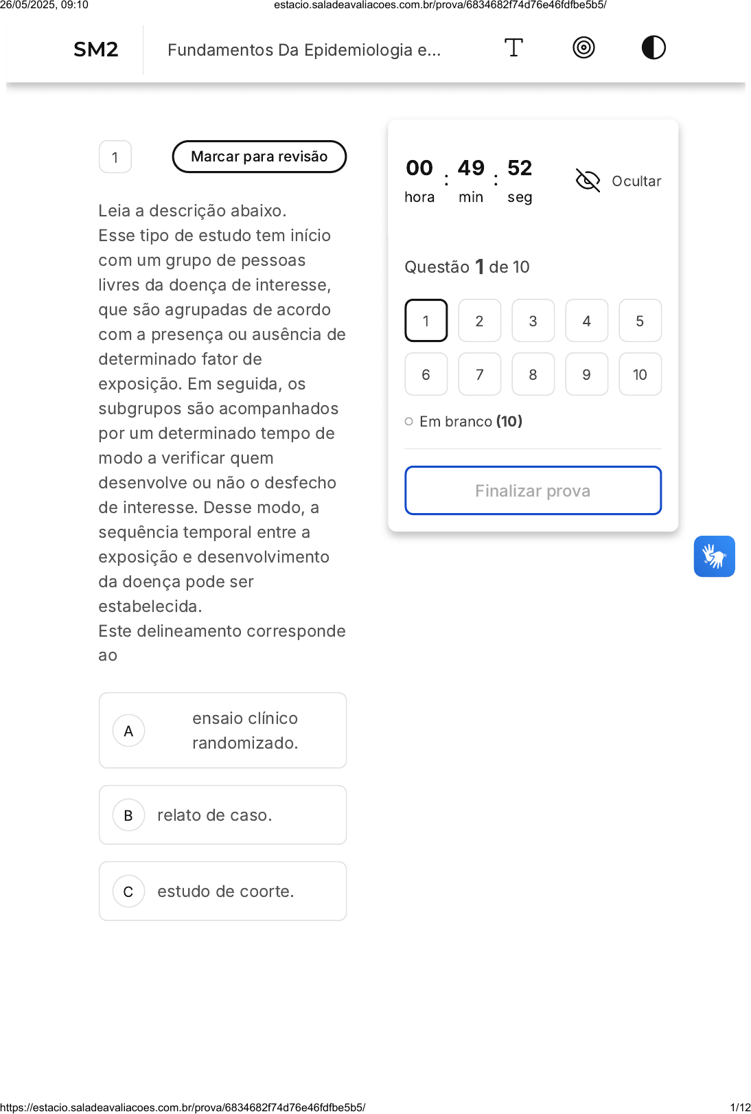 A B C 1 Marcar para revisão Leia a descrição abaixo. Esse tipo de estudo tem início com um grupo de pessoas livres da doença de interesse, que são agrupadas de acordo com a presença ou ausência de determinado fator de exposição. Em seguida, os subgrupos são acompanhados por um determinado tempo de modo a verificar quem desenvolve ou não o desfecho de interesse. Desse modo, a sequência temporal entre a exposição e desenvolvimento da doença pode ser estabelecida. Este delineamento corresponde ao ensaio clínico randomizado. relato de caso. estudo de coorte. 00 hora : 49 min : 52 seg Ocultar Questão 1 de 10 Em branco (10) Finalizar prova 1 2 3 4 5 6 7 8 9 10 SM2 Fundamentos Da Epidemiologia e… 26/05/2025, 09:10 estacio.saladeavaliacoes.com.br/prova/6834682f74d76e46fdfbe5b5/ https://estacio.saladeavaliacoes.com.br/prova/6834682f74d76e46fdfbe5b5/ 1/12 User User D E série de casos. estudo transversal. 2 Marcar para revisão Um dos objetivos principais da metodologia epidemiológica é fornecer informações válidas e confiáveis sobre a ocorrência de desfechos e doenças, associando-as a fatores de exposição e de risco. Contudo, essas análises podem apresentar erros em seu percurso. A respeito dos erros em estudos epidemiológicos, leia as alternativas abaixo e marque a alternativa verdadeira. 26/05/2025, 09:10 estacio.saladeavaliacoes.com.br/prova/6834682f74d76e46fdfbe5b5/ https://estacio.saladeavaliacoes.com.br/prova/6834682f74d76e46fdfbe5b5/ 2/12 A B C Um erro aleatório apresenta três principais causas (variação individual, erros de medida e erros de amostragem) e nunca podem ser completamente eliminados. A variação individual quase nunca ocorre e suas medidas costumam ser absolutamente precisas. Aumentar o tamanho amostral não impacta no erro aleatório de amostragem. 26/05/2025, 09:10 estacio.saladeavaliacoes.com.br/prova/6834682f74d76e46fdfbe5b5/ https://estacio.saladeavaliacoes.com.br/prova/6834682f74d76e46fdfbe5b5/ 3/12 User D E Um estudo com um pequeno erro sistemático apresenta baixa precisão, que é afetada pelo tamanho da amostra. O viés de mensuração ocorre quando há uma diferença sistemática entre as características dos indivíduos selecionados para o estudo e aqueles que não foram selecionados. 3 Marcar para revisão Os estudos epidemiológicos observacionais têm especial relevância no contexto do Sistema Único de Saúde (SUS), fornecendo informações a respeito dos indicadores locais e dos potenciais determinantes do processo saúde-doença para auxiliar no planejamento e avaliação das ações de saúde, bem como na alocação de recursos. São exemplos de estudos epidemiológicos observacionais: Assinale a alternativa correta: 26/05/2025, 09:10 estacio.saladeavaliacoes.com.br/prova/6834682f74d76e46fdfbe5b5/ https://estacio.saladeavaliacoes.com.br/prova/6834682f74d76e46fdfbe5b5/ 4/12 A B C D E Série de casos e ensaios de campo. Ensaios clínicos randomizados e estudos transversais. Relato de caso e ensaios comunitários. Ensaios ecológicos e ensaios de campo. Estudo de coorte e estudos transversais. 4 Marcar para revisão A epidemiologia _______________ busca avaliar com mais profundidade as relações entre o estado de saúde e outras variáveis, enquanto a epidemiologia _______________, frequentemente o primeiro passo de uma investigação epidemiológica, descreve a ocorrência de uma doença em uma população. Em relação aos tipos de investigação epidemiológica, marque a alternativa que completa corretamente a lacuna. 26/05/2025, 09:10 estacio.saladeavaliacoes.com.br/prova/6834682f74d76e46fdfbe5b5/ https://estacio.saladeavaliacoes.com.br/prova/6834682f74d76e46fdfbe5b5/ 5/12 User A B C D E A B descritiva - analítica. analítica - descritiva. experimental - descritiva. observacional - experimental. experimental - analítica. 5 Marcar para revisão Durante a pandemia de COVID- 19, observou-se o grande aumento do número de casos de transtornos mentais, tais como depressão e ansiedade. A epidemiologia social possui muitas vertentes teóricas e uma delas busca compreender esse fenômeno. Marque a alternativa que corresponde a essa vertente. Vertente do materialismo histórico. Vertente psicossocial. 26/05/2025, 09:10 estacio.saladeavaliacoes.com.br/prova/6834682f74d76e46fdfbe5b5/ https://estacio.saladeavaliacoes.com.br/prova/6834682f74d76e46fdfbe5b5/ 6/12 User User C D E A B C Vertente do culturalismo moderno. Vertente da ecoepidemiologia. Vertente antropológica. 6 Marcar para revisão (Quadrix - 2019 - Prefeitura de Jataí - GO) No que se refere aos determinantes sociais da saúde, assinale a alternativa correta. As condições de vida e trabalho dos indivíduos não estão relacionadas com sua situação de saúde. A análise dos determinantes sociais de saúde permite melhorias nas políticas públicas de saúde. Os fatores macrodeterminantes da saúde possuem pouca influência sobre os indivíduos. 26/05/2025, 09:10 estacio.saladeavaliacoes.com.br/prova/6834682f74d76e46fdfbe5b5/ https://estacio.saladeavaliacoes.com.br/prova/6834682f74d76e46fdfbe5b5/ 7/12 User D E A B Para a Comissão Nacional sobre os Determinantes Sociais da Saúde (CNDSS), estabelecida em 2006, os fatores culturais não estão relacionados com a situação de saúde da população. Os fatores psicológicos e comportamentais não influenciam a ocorrência de problemas de saúde. 7 Marcar para revisão A promoção da saúde é apontada como uma das melhores estratégias para a redução das iniquidades da saúde e para a construção de uma sociedade mais saudável. Portanto, a responsabilidade da promoção da saúde: é exclusivamente do setor saúde. cabe ao setor cultural e saúde. 26/05/2025, 09:10 estacio.saladeavaliacoes.com.br/prova/6834682f74d76e46fdfbe5b5/ https://estacio.saladeavaliacoes.com.br/prova/6834682f74d76e46fdfbe5b5/ 8/12 C D E é de cada indivíduo e da comunidade onde vive. é resultado de um conjunto de fatores sociais, econô