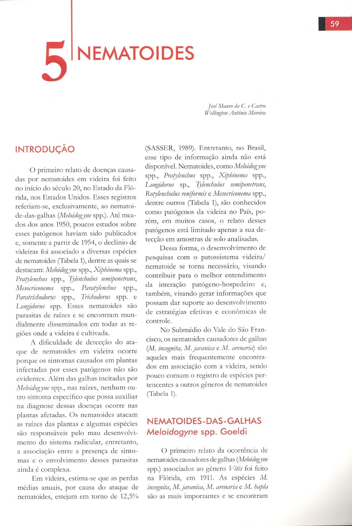 59 5 NEMATOIDES Mauro da C. e Castro Wellington Antônio Moreira INTRODUÇÃO (SASSER, 1989). Entretanto, no Brasil, esse tipo de informação ainda não está O primeiro relato de doenças causa- disponível. Nematoides, como Meloidogyne das por nematoides em videira foi feito spp., Pratylenchus spp., Xiphinema spp., no início do século 20, no Estado da Fló- Longidorus sp., Tylenchulus semipenetrans, rida, nos Estados Unidos. Esses registros Rotylenchulus reniformis e Mesocriconema spp., referiam-se, exclusivamente, ao nematoi- dentre outros (Tabela 1), são conhecidos de-das-galhas (Meloidogyne spp.). Até mea- como patógenos da videira no País, po- dos dos anos 1950, poucos estudos sobre rém, em muitos casos, o relato desses esses patógenos haviam sido publicados patógenos está limitado apenas a sua de- e, somente a partir de 1954, de tecção em amostras de solo analisadas. videiras foi associado a diversas espécies Dessa forma, desenvolvimento de de nematoides (Tabela 1), dentre as quais se pesquisas com patossistema videira/ destacam: Meloidogyne spp., Xiphinema spp., nematoide se torna necessário, visando Pratylenchus spp., Tylenchulus semipenetrans, contribuir para melhor entendimento Mesocriconema spp., Paratylenchus spp., da interação patógeno-hospedeiro e, Paratrichodorus spp., Trichodorus spp. e também, visando gerar informações que Longidorus spp. Esses nematoides são possam dar suporte ao desenvolvimento parasitas de raízes e se encontram mun- de estratégias efetivas e econômicas de dialmente disseminados em todas as re- controle. No Submédio do Vale do São Fran- giões onde a videira é cultivada. A dificuldade de detecção do ata- cisco, os nematoides causadores de galhas que de nematoides em videira ocorre (M. incognita, M. javanica e M. arenaria) são porque os sintomas causados em plantas aqueles mais frequentemente encontra- infectadas por esses patógenos não são dos em associação com a videira, sendo evidentes. Além das galhas incitadas por pouco comum registro de espécies per- Meloidog yne spp., nas raízes, nenhum ou- tencentes a outros gêneros de nematoides tro sintoma específico que possa auxiliar (Tabela 1). na diagnose dessas doenças ocorre nas plantas afetadas. Os nematoides atacam as raízes das plantas e algumas espécies são responsáveis pelo mau desenvolvi- Meloidogyne spp. Goeldi mento do sistema radicular, entretanto, a associação entre a presença de sinto- O primeiro relato da ocorrência de mas e envolvimento desses parasitas nematoides causadores de galhas (Meloidogyne ainda é complexa. spp.) associados ao gênero Vitis foi feito Em videira, estima-se que as perdas na Flórida, em 1911. As espécies M. médias anuais, por causa do ataque de incognita, M. javanica, M. arenaria e M. hapla nematoides, estejam em torno de 12,5% são as mais importantes e se encontram60 Uva de Mesa Fitossanidade Frutas do Brasil, 14 Tabela 1. Nematoides associados à rizosfera de videira (Vitis spp.) no Nome comum Nome científico Estado de ocorrência Nematoide-das-galhas Meloidogyne sp. PE, MG, SP, PR M. javanica MG M. incognita SP, MG M. arenaria RS M. hapla RS Nematoide-das-lesões Pratylenchus sp. SP, RS P. brachyurus MG P. jordanensis SC, RS P. thornei MG P. zege Nematoide-punhal Xiphinema sp. SP, MG (Dagger nematode) X. americanum (sin. X. brevicolle) MG X. brasiliense MG X. index PR X. krugi MG Nematoide-agulha Longidorus sp. (Needle nematode) Tylenchulus semipenetrans MG, SP, RS Nematoide-reniforme Rotylenchulus reniformis MG Nematoide-anelado Mesocriconema sp. SP M. curvata MG M. onoensis MG M. palustris MG M. sphaerocephalum MG M. xenoplax MG Hemicycliophora sp. RS H. poranga MG Discocriconemella degrissei MG D. repleta MG Nematoide-espiralado Helicotylenchus sp. MG, SP, RS H. dihystera MG Hoplolaimus galeatus RS Nematoide-charuto Trichodorus sp. RS Outros nematoides Aphelenchoides sp. RS Aphelenchoides coffege -- Aphelenchus sp. RS Aphelenchus avenae MG, PE Aorolaimus sp. (sin. Peltamigratus sp.) MG Ditylenchus sp. RS Tylenchus sp. RS T. devainei RS (1) Sem informação sobre o local de ocorrência. Fonte: adaptado de Lordello e Lordello (2003) e Naves (2005). amplamente distribuídas na maioria das soja, entretanto, porta-enxerto CV. Ru- regiões cultivadas com videira. A espécie pestris du Lot foi imune a essa espécie de M. hapla foi registrada, inicialmente, nos nematoide (CARNEIRO et al., 2003). estados de Washington e Michigan, nos Estados Unidos. No Brasil, foi detectada em videira Sintomatologia na região da Serra Gaúcha, no Estado do e epidemiologia Rio Grande do Sul (NAVES et al., 2005). Em condições experimentais, a cultivar Os nematoides-das-galhas, assim Niágara Rosada foi considerada boa hos- como outras espécies patogênicas à vi- pedeira de M. ethiopica, isolado de kiwi e deira, não causam sintomas específicosFrutas do Brasil, 14 Uva de Mesa Fitossanidade 61 na parte aérea das plantas. Baixa produti- cimento do sistema radicular de videiras, vidade, subdesenvolvimento da copa, sem incitar a formação de galhas, no Es- amarelecimento da folhagem e alta sensi- tado americano de Michigan. bilidade ao estresse são sintomas que po- dem ser desencadeados pela infecção da planta por esses patógenos. Porém, são Ciclo de vida e disseminação frequentemente confundidos com sinto- O ciclo de vida e disseminação de mas ocasionados por estresse hídrico ou Meloidogyne spp. em videira é semelhante deficiência nutricional. Esses patógenos que ocorre em outras plantas hos- provocam, ainda, redução do vigor e de- pedeiras desses nematoides. A fêmea de- clínio das plantas mais suscetíveis ao es- posita os ovos numa substância gelatino- tresse, interferindo na absorção de água e sa que pode conter cerca de 2 mil ovos. nutrientes e, consequentemente, afetan- Os juvenis têm corpo alongado, sofrem do a produção. ecdise ainda dentro do e emergem no O sintoma característico causado segundo est