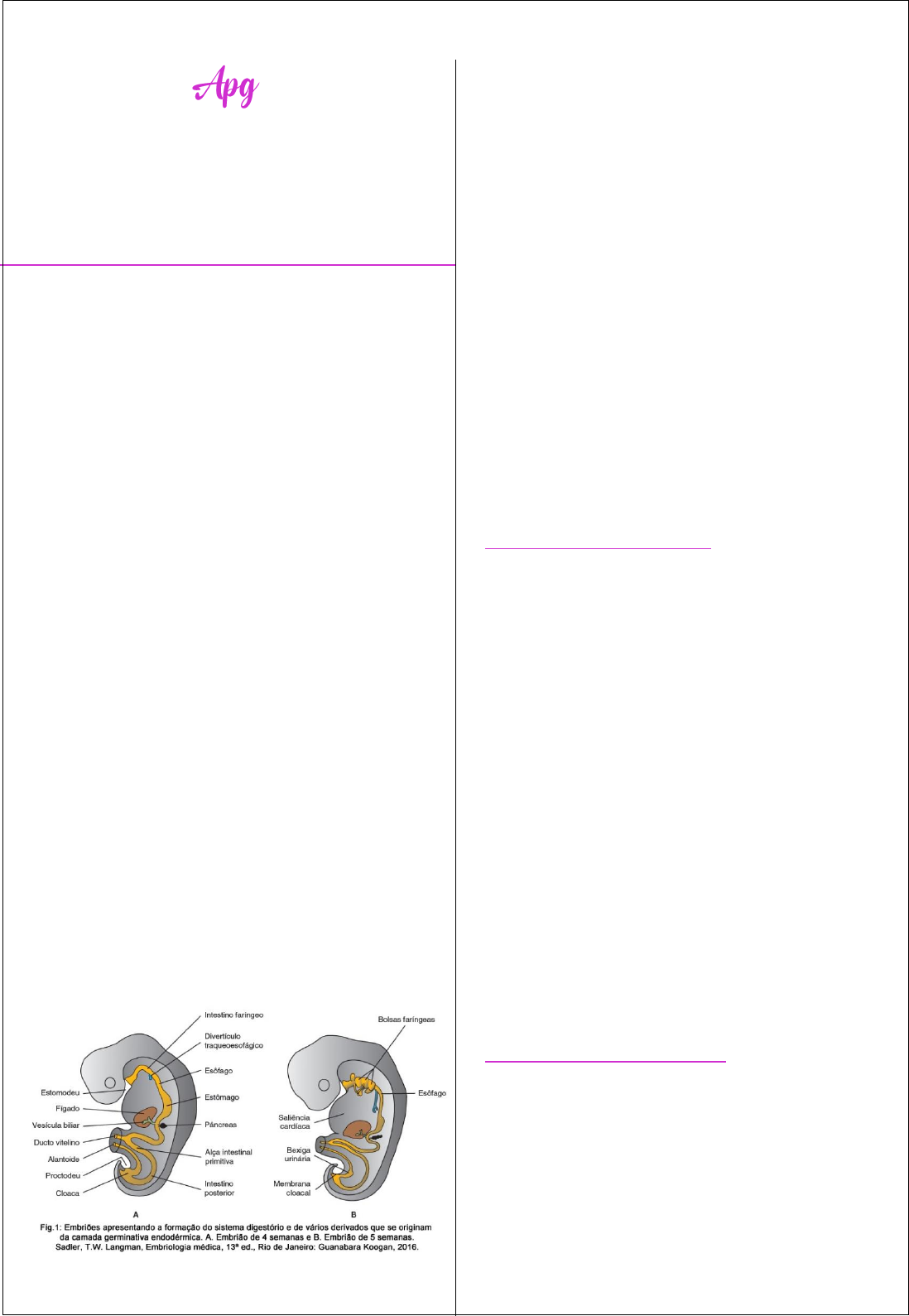 OBJETIVOS 1-Descrever o desenvolvimento embriológico do sistema digestório 2-Descrever tipos de fenda 3-Reconhecer as consequências dessa má formação 1- SISTEMA DIGESTÓRIO – TUBO DIGESTÓRIO O desenvolvimento do sistema digestório começa no início da quarta semana com a formação do intestino primitivo, a partir da incorporação do endoderma e de parte da vesícula umbilical (saco vitelino) pelas pregas cefálica, laterais e caudal durante o dobramento do embrião. O endoderma do intestino primitivo origina a maior parte do epitélio e das glândulas do trato digestivo, enquanto que o epitélio da extremidade cefálica (cranial) é derivado do ectoderma do estomodeu (futura cavidade bucal) e o epitélio da extremidade caudal deriva do ectoderma do proctodeu (futuro canal anal). O intestino primitivo é limitado na sua extremidade cefálica (cranial) pela membrana bucofaríngea e na sua extremidade caudal pela membrana cloacal. Os tecidos muscular, conjuntivo e as outras camadas da parede do trato digestivo são derivados do mesênquima esplâncnico que circunda o intestino primitivo. Para fins de descrição, o intestino primitivo é dividido em três partes: Intestino anterior Intestino médio Intestino posterior INTESTINO ANTERIOR Os derivados do intestino anterior são: A faringe primitiva e seus derivados; O sistema respiratório inferior; O esôfago e o estômago; O duodeno, proximal à abertura do dueto biliar; O fígado, o aparelho biliar (ductos hepáticos, vesícula biliar e ducto biliar) e o pâncreas. Todos esses derivados do intestino anterior, exceto a faringe, o trato respiratório e a maior parte do esôfago, são vascularizados pelo tronco celíaco, a artéria do intestino anterior. Desenvolvimento do Esôfago O esôfago começa a se desenvolver a partir do intestino anterior imediatamente caudal à faringe. A separação da traqueia do esôfago se dá pelo traqueoesofágico. Inicialmente, o esôfago é curto, porém ele irá se alongar rapidamente, graças, principalmente, ao crescimento e à descida do coração e dos pulmões. O esôfago alcança o seu comprimento final relativo durante a sétima semana. Seu epitélio e suas glândulas são derivados do endoderma. O epitélio prolifera e oblitera, parcial ou completamente, a luz; entretanto, a recanalização do esôfago normalmente ocorre no final do período embrionário. O músculo estriado que forma a camada muscular externa do terço superior do esôfago é derivado do mesênquima do 4º ao 6º arco faríngeo. O músculo liso, principalmente no terço inferior do esôfago, se desenvolve do mesênquima esplâncnico circunjacente. Desenvolvimento do Estômago Em torno da metade da quarta semana, uma ligeira dilatação no intestino anterior, até o momento tubular, indica o local do primórdio do estômago. No início, ele aparece como um alargamento fusiforme da porção caudal do intestino anterior e está orientado no plano mediano. Esse primórdio logo se expande e se amplia dorsoventralmente. Durante as próximas duas semanas, a face dorsal do estômago cresce mais rapidamente do que a sua face ventral; isso demarca a curvatura maior e a curvatura menor do estômago. Durante o seu desenvolvimento, o estômago sofre alterações na sua posição, e estas alterações são mais facilmente entendidas quando explicadas separadamente em dois eixos – eixo longitudinal e eixo anteroposterior. O estômago gira 90° no sentido horário ao redor de seu eixo longitudinal, fazendo com que o lado esquerdo original se torna a superfície ventral (para frente), e o lado direito se torna a superfície dorsal (para trás). Essa rotação e o crescimento do órgão explicam porque o nervo vago esquerdo supre a sua parede anterior e o nervo vago direito inerva a sua parede posterior. Com a progressão do desenvolvimento, o estômago gira ao redor do eixo anteroposterior, fazendo com que a sua região cefálica (cranial ou cardíaca) se mova para a esquerda e ligeiramente para baixo, e sua região caudal (pilórica), consequentemente, se mova para a direita e para cima. Após essas mudanças de posição, o estômago assume a sua posição final, com o seu eixo indo da porção esquerda superior para a direita inferior. Desenvolvimento do Duodeno O duodeno se desenvolve a partir da porção caudal do intestino anterior, da porção cranial do intestino médio e do mesênquima esplâncnico associado ao endoderma dessas porções do intestino primitivo. A junção das duas porções do duodeno situa-se logo após a origem do ducto biliar. O duodeno em desenvolvimento cresce rapidamente, formando uma alça em forma de C que se projeta ventralmente. A medida que o estômago rotaciona, aliado ao rápido crescimento da cabeça do pâncreas, a alça duodenal gira para a direita e vai se localizar retroperitonealmente (externa ao peritônio). Por se originar dos intestinos anterior e médio, o duodeno é suprido por ramos das artérias celíaca e mesentérica superior, artérias que vascularizam essas porções do intestino primitivo. Durante a quinta e a sexta semanas, a luz do duodeno se torna progressivamente menor e é, temporariamente, obliterada, devido à proliferação de suas células epiteliais, recanalizando normalmente no final do período embrionário. Nessa ocasião, a maior parte do mesentério ventral já desapareceu. INTESTINO MÉDIO Os derivados do intestino médio são: O intestino delgado, incluindo o duodeno distal até a abertura do ducto biliar. O ceco, o apêndice, o colo ascendente e a metade a dois terços do colo transverso. Todos esses derivados do intestino médio são supridos pela artéria mesentérica superior. O desenvolvimento do intestino médio é caracterizado pelo alongamento do intestino e seu mesentério resultando na formação de uma alça intestinal ventral com a forma de U — a alça do intestino médio, também chamada de alça intestinal primária ou alça intestinal média. O