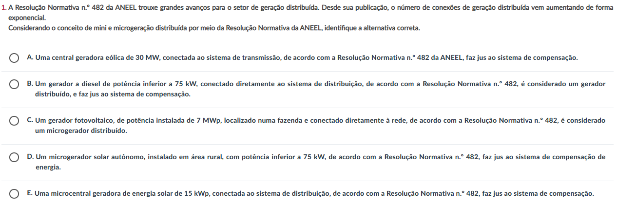 1. A Resolução Normativa 482 da ANEEL trouxe grandes avanços para setor de geração distribuída. Desde sua publicação, O numero de conexões de geração distribuída vem aumentando de forma exponencial. Considerando conceito de mini e microgeração distribuída por meio da Resolução Normativa da ANEEL, identifique a alternativa correta. A. Uma central geradora eólica de 30 MW, conectada ao sistema de transmissão, de acordo com a Resolução Normativa 482 da ANEEL, faz jus ao sistema de compensação. B. Um gerador a diesel de potência inferior a 75 kW, conectado diretamente ao sistema de distribuição, de acordo com a Resolução Normativa 482, é considerado um gerador distribuído, e faz jus ao sistema de compensação. C. Um gerador fotovoltaico, de potência instalada de 7 MWp, localizado numa fazenda e conectado diretamente à rede, de acordo com a Resolução Normativa 482, é considerado um microgerador distribuído. D. Um microgerador solar autônomo, instalado em área rural, com potência inferior a 75 kW, de acordo com a Resolução Normativa 482, faz jus ao sistema de compensação de energia. E. Uma microcentral geradora de energia solar de 15 kWp, conectada ao sistema de distribuição, de acordo com a Resolução Normativa 482, faz jus ao sistema de compensação.