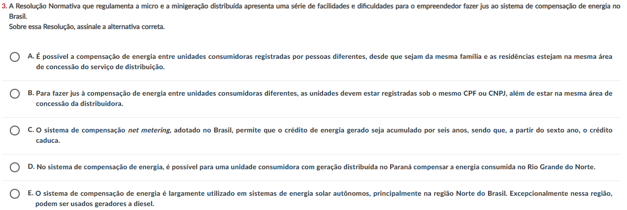 3. A Resolução Normativa que regulamenta a micro e a minigeração distribuída apresenta uma série de facilidades e dificuldades para o empreendedor fazer jus ao sistema de compensação de energia no Brasil. Sobre essa Resolução, assinale a alternativa correta. A. É possível a compensação de energia entre unidades consumidoras registradas por pessoas diferentes, desde que sejam da mesma família e as residências estejam na mesma área de concessão do serviço de distribuição. B. Para fazer jus à compensação de energia entre unidades consumidoras diferentes, as unidades devem estar registradas sob mesmo CPF ou CNPJ, além de estar na mesma área de concessão da distribuidora. C. sistema de compensação net metering, adotado no Brasil, permite que crédito de energia gerado seja acumulado por seis anos, sendo que, a partir do sexto ano, crédito caduca. D. No sistema de compensação de energia, é possível para uma unidade consumidora com geração distribuída no Paraná compensar a energia consumida no Rio Grande do Norte. E.O sistema de compensação de energia é largamente utilizado em sistemas de energia solar autônomos, principalmente na região Norte do Brasil. Excepcionalmente nessa região, podem ser usados geradores a diesel.
