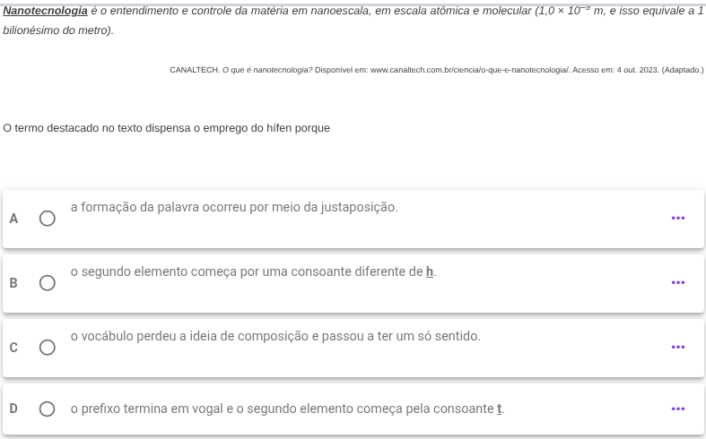 Nanotecnologia é entendimento e controle da matéria em nanoescala, em escala atômica e molecular e isso equivale a 1 do metro). CANALTECH que é nanotecnologia? Disponível em: em: 4 out 2023. (Adaptado.) O termo destacado no texto dispensa emprego do hifen porque a formação da palavra ocorreu por meio da A ... segundo elemento começa por uma consoante diferente de h. B ... vocábulo perdeu a de composição e passou a ter um só sentido C ... D O prefixo termina em vogal e O segundo elemento começa pela consoante ...