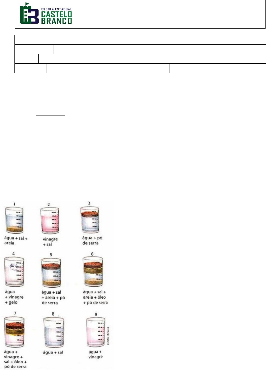 GOVERNO DO ESTADO DE MATO GROSSO DO SUL SECRETARIA ESTADUAL DE EDUCAÇÃO ESCOLA ESTADUAL CASTELO BRANCO 1º BIMESTRE AVALIAÇÃO BIMESTRAL DE CIÊNCIAS Aluno (a): Data: Professora: Sandra Mara Ströher Turma: 6º ano Turno: Vespertino (Questões de 1 a 8 - MS.EF06CI01.s.01 - Classificar como homogênea ou heterogênea a mistura de dois ou mais materiais (água e sal, água e óleo, água e areia, etc.): As misturas podem ser homogêneas ou heterogêneas. Sobre este assunto avalie as questões abaixo e responda corretamente 1. Misturas homogêneas são (valendo 1,0): a) Aquelas que não são puras; b) Aquelas em que se pode separar a olho nú seus componentes; c) Aquelas em que NÃO se pode separar a olho nú seus componentes; d) São aquelas encontradas facilmente na natureza pois são impuras; e) São aquelas que são produzidas em laboratório e vendidas como substâncias artificiais. 2. Misturas heterogêneas são(valendo 1,0): a) Aquelas que não são puras; b) Aquelas em que se pode separar a olho nú seus componentes; c) Aquelas em que NÃO se pode separar a olho nú seus componentes; d) São aquelas encontradas facilmente na natureza pois são impuras; e) São aquelas que são produzidas em laboratório e vendidas como substâncias artificiais. Avalie a imagem abaixo: 3. Dos exemplos ao lado, são consideradas misturas homogêneas (valendo 1,0): a) 1, 4 e 6 b) 3, 5 e 7 c) 2, 8 e 9 d) 5, 7 e 8 e) 4, 6 e 9 4. Dos exemplos ao lado, são consideradas misturas heterogêneas (valendo 1,0): a) 1, 2, 4, 5, 7, e 9 b) 3, 4, 5, 6, 7 e 8 c) 2, 3, 4, 6, 8 e 9 d) 1, 3, 4, 5, 6 e 7 e) 2, 4, 5, 6, 7 e 9 As misturas podem apresentar 1, 2 ou mais fases. Avalie os exemplos ao lado e aponte quais são: 5. Misturas compostas por 1 fase (valendo 1,0): a) 1, 3 e 5 b) 2, 8 e 9 c) 3, 7 e 8 d) 4, 5 e 6 e) 5, 7 e 9 6. Misturas compostas por 2 fases (valendo 1,0): 7. Misturas compostas por 3 fases (valendo 1,0): a) 1, 5 e 7 a) 1 e 3 b) 2, 6 e 8 b) 4 e 8 c) 1, 3 e 4 c) 5 e 7 d) 5, 8 e 9 d) 6 e 9 e) 3, 4 e 6 e) 3 e 5 8. Misturas compostas por 4 fases (valendo 1,0): a) 4 b) 9 c) 6 d) 3 e) 5 9. MS.EF06CI03.s.03 - Selecionar métodos mais adequados para a separação de diferentes sistemas heterogêneos a partir da identificação de processos de separação de materiais (como a produção de sal de cozinha, a destilação de petróleo, entre outros) - Sobre os métodos de separação de misturas, observe a imagem a seguir e relacione os números com as colunas: ( ) peneiração; ( ) catação; ( ) decantação; ( ) separação magnética; ( ) filtração. A sequência correta é (valendo 1,0): a) 1, 2, 3, 4, 5 b) 2, 5, 3, 4, 1 c) 3, 1, 4, 2, 5 d) 4, 3, 5, 2, 1 e) 2, 5, 3, 1, 4 10. MS.EF06CI02.s.02 - Identificar evidências de transformações químicas a partir do resultado de misturas de materiais que originam produtos diferentes dos que foram misturados (misturas de ingredientes para fazer um bolo, mistura de vinagre com bicarbonato de sódio, etc.) - A matéria pode sofrer mudanças no estado físico e químico. Avalie as imagens ao lado e aponte quais dos exemplos representa uma mudança química do estado da matéria (vale 1,0): a) 1 b) 2 c) 3 e 4 d) 4 e) 2 e 3 Agora, preencha o gabarito corretamente: Ex. Aluno (a): Turma: 6º ano image6.png image1.jpeg image2.jpeg image3.jpeg image4.jpeg image5.png