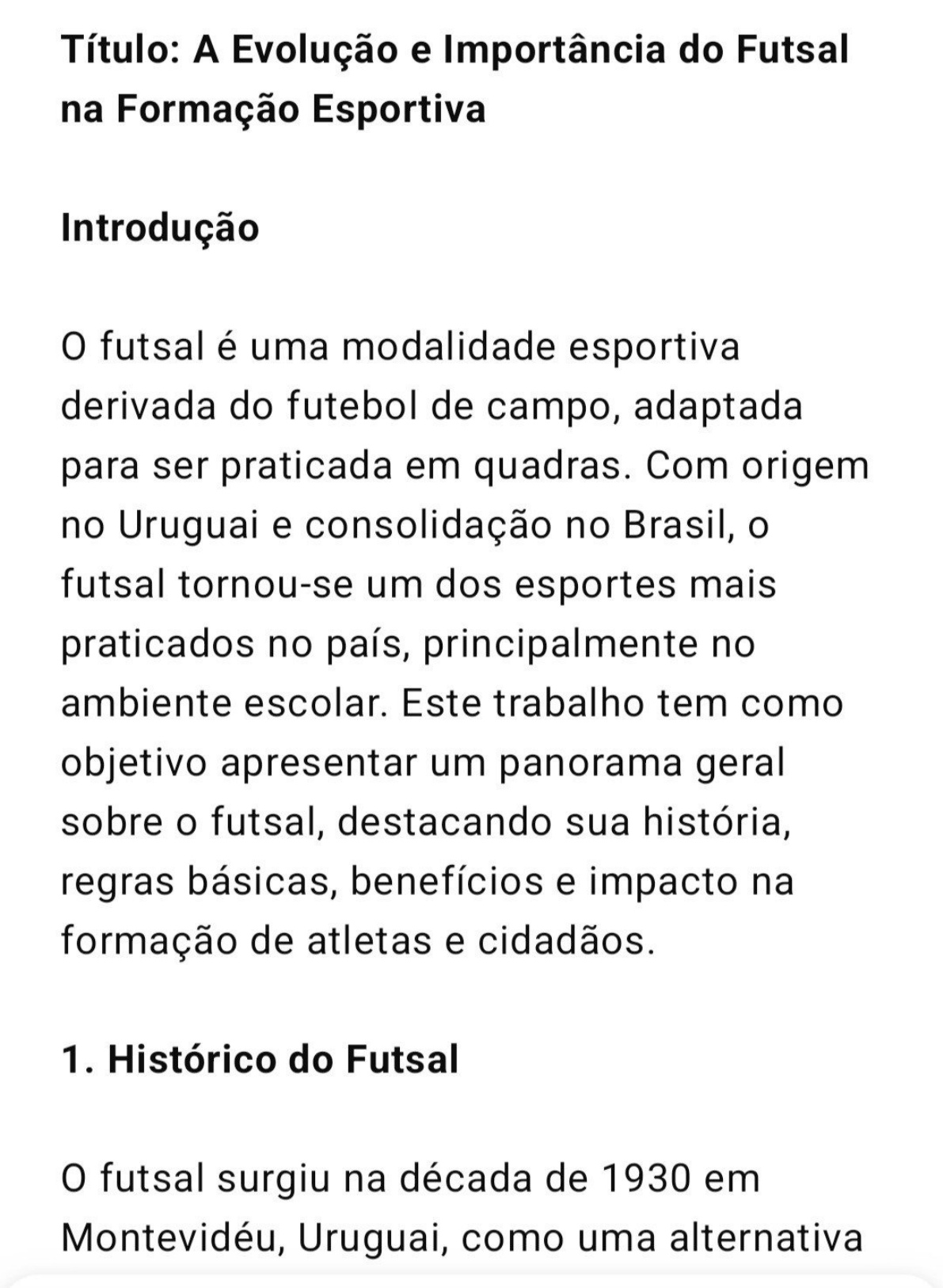 Título: A Evolução e Importância do Futsal na Formação Esportiva Introdução futsal é uma modalidade esportiva derivada do futebol de campo, adaptada para ser praticada em quadras. Com origem no Uruguai e consolidação no Brasil, o futsal tornou-se um dos esportes mais praticados no país, principalmente no ambiente escolar. Este trabalho tem como objetivo apresentar um panorama geral sobre o futsal, destacando sua história, regras básicas, benefícios e impacto na formação de atletas e cidadãos. 1. Histórico do Futsal futsal surgiu na década de 1930 em Montevidéu, Uruguai, como uma alternativafutsal surgiu na década de 1930 em Montevidéu, Uruguai, como uma alternativa para a prática do futebol em espaços menores. A modalidade rapidamente se espalhou pela América do Sul, sendo o Brasil um dos principais países a desenvolver e promover o esporte. Com a fundação da Confederação Brasileira de Futebol de Salão (CBFS) em 1979, o futsal passou a ganhar notoriedade nacional e internacional. 2. Regras Básicas futsal é praticado por duas equipes de cinco jogadores, incluindo o goleiro. A partida tem duração de 40 minutos, dividida em dois tempos de 20 minutos, com cronômetro parado. A bola é menor e mais pesada que a de futebol de campo, o que favorece o controle e a técnica. Faltas acumulativas, substituições ilimitadas e o uso de quadras delimitadas são características que tornam o jogo maiso controle e a tecnica. Faltas acumulativas, substituições ilimitadas e o uso de quadras delimitadas são características que tornam o jogo mais dinâmico e intenso. 3. Benefícios da Prática do Futsal A prática do futsal oferece inúmeros benefícios físicos, cognitivos e sociais. Entre os principais, destacam-se: Desenvolvimento da coordenação motora e agilidade; Estímulo ao trabalho em equipe e à disciplina; Promoção da saúde cardiovascular e do condicionamento físico; Formação de valores como respeito, cooperação e perseverança. 4. Futsal na Formação de Atletas futsal é reconhecido como umaConclusão futsal é mais do que um esporte recreativo; é uma ferramenta educacional e formativa. Sua prática contribui para desenvolvimento integral do indivíduo, promovendo saúde, sociabilidade e habilidades técnicas. Investir no futsal é investir no esporte idadania.no e investir no esporte e na cidadania. Referências Confederação Brasileira de Futebol de Salão (CBFS) - www.cbfs.com.br SOUZA, J. R. Futsal: Técnica e Tática. São Paulo: Editora Esportiva, 2017. SANTOS, L. M. Educação Física Escolar e Futsal. Belo Horizonte: Ed. UFMG, 2019.