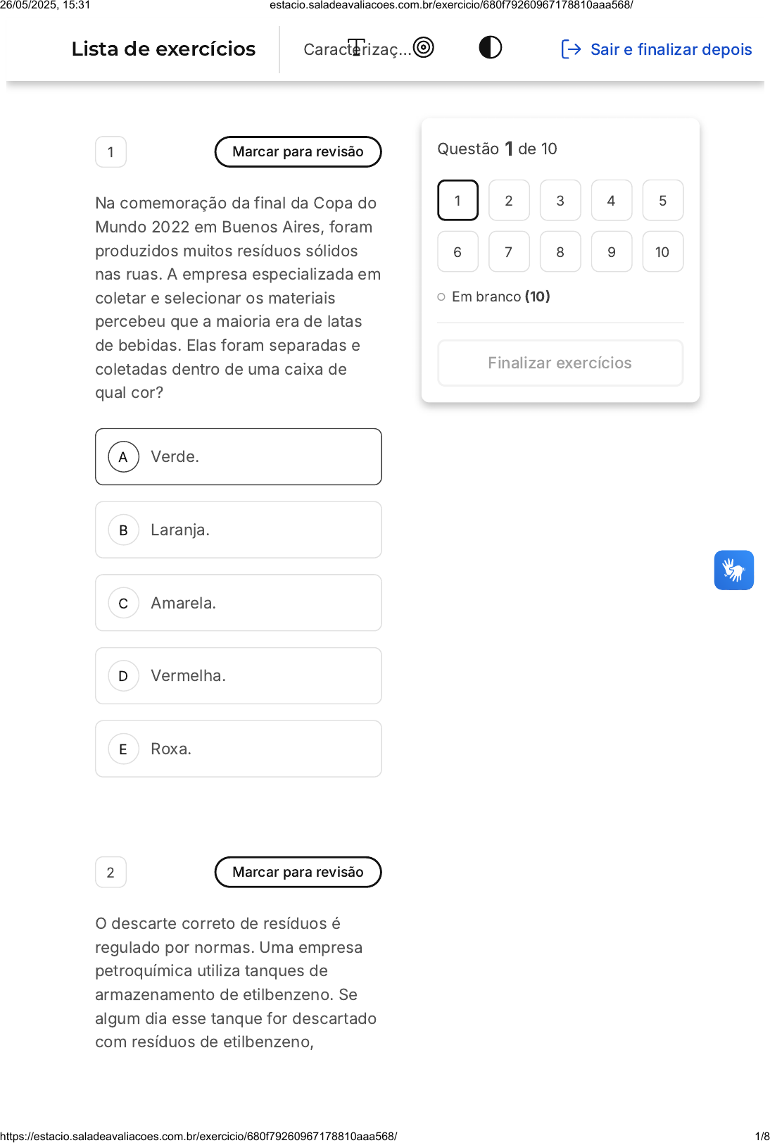 A B C D E 1 Marcar para revisão Na comemoração da final da Copa do Mundo 2022 em Buenos Aires, foram produzidos muitos resíduos sólidos nas ruas. A empresa especializada em coletar e selecionar os materiais percebeu que a maioria era de latas de bebidas. Elas foram separadas e coletadas dentro de uma caixa de qual cor? Verde. Laranja. Amarela. Vermelha. Roxa. 2 Marcar para revisão O descarte correto de resíduos é regulado por normas. Uma empresa petroquímica utiliza tanques de armazenamento de etilbenzeno. Se algum dia esse tanque for descartado com resíduos de etilbenzeno, Questão 1 de 10 Em branco (10) 1 2 3 4 5 6 7 8 9 10 Finalizar exercícios Lista de exercícios Caracterizaç… Sair e finalizar depois 26/05/2025, 15:31 estacio.saladeavaliacoes.com.br/exercicio/680f79260967178810aaa568/ https://estacio.saladeavaliacoes.com.br/exercicio/680f79260967178810aaa568/ 1/8 A B C D E A B C podemos considerar esse resíduo como? Classe I - inflamável. Classe II A - não inerte. Classe II B - inerte. Classe I - corrosivo. Classe I - infeccioso. 3 Marcar para revisão Você trabalha numa oficina e seu chefe solicita dar descarte de galões de óleo lubrificante usados. Você lembra da aula em tratamento de resíduos e sabe que deve ser descartada por uma empresa especializada, mas para facilitar o trabalho deles você decidiu classificar ele como: Classe I - inflamável. Classe II A - não inerte. Classe II B - inerte. 26/05/2025, 15:31 estacio.saladeavaliacoes.com.br/exercicio/680f79260967178810aaa568/ https://estacio.saladeavaliacoes.com.br/exercicio/680f79260967178810aaa568/ 2/8 D E A B C D E Classe I - tóxico. Classe I - infecioso. 4 Marcar para revisão Uma empresa produz tinta industrial e dentro desta existe uma estação de tratamento de água industrial. No processo de tratamento de água se produz um lodo rico em cadmio, cromo e chumbo, compostos que são inclusive utilizados na produção de pinturas. Qual seria o código de identificação deste resíduo? F018. F019. F020. F021. F022. 5 Marcar para revisão Você trabalha numa empresa de montagem de peças com gesso. Após certo tempo, vários resíduos do material ficaram espalhados e precisa dar um bom descarte dele. O gesso é 26/05/2025, 15:31 estacio.saladeavaliacoes.com.br/exercicio/680f79260967178810aaa568/ https://estacio.saladeavaliacoes.com.br/exercicio/680f79260967178810aaa568/ 3/8 A B C D E A B C considerado um produto de baixa reação e, portanto, é classificado como: Classe I - inflamável. Classe II A - não inerte. Classe II B - inerte. Classe I - tóxico. Classe I - infecioso. 6 Marcar para revisão A caracterização de resíduos sólidos é muito importante para facilitar o processo de classificação. Uma característica física é o conteúdo de umidade. Uma amostra apresenta uma massa total de 15 kg e após um processo de secagem observou-se que 1 kg de água foram evaporados. Qual é o conteúdo de umidade da amostra? 6,6%. 7,5%. 15%. 26/05/2025, 15:31 estacio.saladeavaliacoes.com.br/exercicio/680f79260967178810aaa568/ https://estacio.saladeavaliacoes.com.br/exercicio/680f79260967178810aaa568/ 4/8 D E A B C D E 1%. 10%. 7 Marcar para revisão Na refinaria de Paulínia em São Paulo são utilizados trocadores de calor nos processos de processamento de petróleo. O trocador com o tempo precisa de uma limpeza para a remoção de incrustações que afetam a transferência de calor. Durante o processo de limpeza um lodo é produzido e por tanto deve ser coletado e descartado de forma adequada. Qual seria o código de identificação deste resíduo? K048. K049. K050. K051. K052. 8 Marcar para revisão Duas cidades apresentaram na sua amostragem de resíduos sólidos a 26/05/2025, 15:31 estacio.saladeavaliacoes.com.br/exercicio/680f79260967178810aaa568/ https://estacio.saladeavaliacoes.com.br/exercicio/680f79260967178810aaa568/ 5/8 A B C D E seguinte composição. Qual cidade gera mais cinza em base per capita? Cidade 1 com 0,14 kg/pessoa - dia. Cidade 2 com 0,03 kg/pessoa - dia. Cidade 2 com 0,14 kg/pessoa - dia. Cidade 1 com 0,03 kg/pessoa - dia. Ambas geram a mesma quantidade. 9 Marcar para revisão Um resíduo sólido foi encontrado num laboratório sem nenhum rótulo. No entanto, o técnico do laboratório verificou que dentro da capela em condições ambiente de temperatura e pressão houve uma ignição. Podemos classificar esse resíduo como: 26/05/2025, 15:31 estacio.saladeavaliacoes.com.br/exercicio/680f79260967178810aaa568/ https://estacio.saladeavaliacoes.com.br/exercicio/680f79260967178810aaa568/ 6/8 A B C D E A B C Reativo. Corrosivo. Inflamável. Tóxico. Patogênico. 10 Marcar para revisão A caracterização de resíduos sólidos é muito importante para facilitar o processo de classificação. Uma característica física é o conteúdo de umidade. Uma amostra apresenta uma massa total de 15 kg e após um processo de secagem observou-se que 1 kg de água foram evaporados. Qual é a massa em base seca da amostra? 6,01 kg. 7,5 kg. 15 kg. 26/05/2025, 15:31 estacio.saladeavaliacoes.com.br/exercicio/680f79260967178810aaa568/ https://estacio.saladeavaliacoes.com.br/exercicio/680f79260967178810aaa568/ 7/8 D E 2,01 kg. 14,01 kg. 26/05/2025, 15:31 estacio.saladeavaliacoes.com.br/exercicio/680f79260967178810aaa568/ https://estacio.saladeavaliacoes.com.br/exercicio/680f79260967178810aaa568/ 8/8