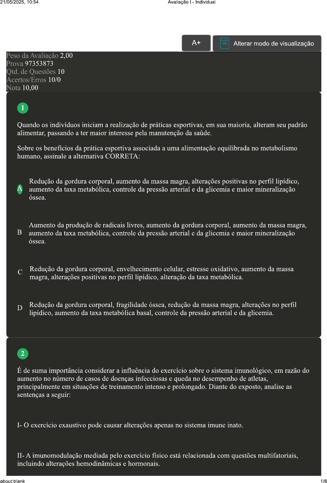 10:54 Avaliação Individual A+ Alterar modo de visualização Peso da Avaliação 2,00 Prova 97353873 Qtd. de Questões 10 Acertos/Erros 10/0 Nota 10,00 1 Quando os indivíduos iniciam a realização de práticas esportivas, em sua maioria, alteram seu padrão alimentar, passando a ter maior interesse pela manutenção da saúde. Sobre os benefícios da prática esportiva associada a uma alimentação equilibrada no metabolismo humano, assinale a alternativa CORRETA: Redução da gordura corporal, aumento da massa magra, alterações positivas no perfil lipídico, aumento da taxa metabólica, controle da pressão arterial e da glicemia e maior mineralização Aumento da produção de radicais livres, aumento da gordura corporal, aumento da massa magra, B aumento da taxa metabólica, controle da pressão arterial e da glicemia e maior mineralização óssea. C Redução da gordura corporal, envelhecimento celular, estresse oxidativo, aumento da massa magra, alterações positivas no perfil lipídico, alteração da taxa metabólica. D Redução da gordura corporal, fragilidade óssea, redução da massa magra, alterações no perfil lipídico, aumento da taxa metabólica basal, controle da pressão arterial e da glicemia. 2 É de suma importância considerar a influência do exercício sobre sistema imunológico, em razão do aumento no número de casos de doenças infecciosas e queda no desempenho de atletas, principalmente em situações de treinamento intenso e prolongado. Diante do exposto, analise as sentenças a seguir: I- O exercício exaustivo pode causar alterações apenas no sistema imune A imunomodulação mediada pelo exercício físico está relacionada com questões multifatoriais, incluindo alterações hemodinâmicas e hormonais. about:blank 1/821/05/2025, 10:54 Avaliação I - Individual III- Nos exercícios moderados, os efeitos imunológicos se apresentam diante da redução do risco para infecções. IV- A incidência de infecções do trato respiratório superior (ITRS) acomete somente atletas engajados em exercícios moderados. Assinale a alternativa CORRETA: A As sentenças I e II estão corretas. B As sentenças III e IV estão corretas. C As sentenças I e IV estão corretas. D As sentenças II e III estão corretas. 3 Na atividade física as proteínas, gorduras e carboidratos são possíveis fontes de combustíveis para contração muscular. Desta forma, ciclo de Krebs é alimentado por glicose, ácidos graxos e esqueletos de carbono de aminoácidos específicos. Sobre exposto, assinale a alternativa CORRETA: A Principalmente a metionina e cistina. B Principalmente a alanina e aminoácidos de cadeia ramificada. C Principalmente a treonina e fenilalanina. D Principalmente a fenilalanina e lisina. 4 A redução da glicemia durante os exercícios mais intensos induz uma resposta contrarreguladora, promovendo aumento da glicemia e a manutenção da concentração sanguínea de glicose. O fígado exerce um papel importante no aumento e na manutenção da glicemia, uma vez que esse tecido sofre influência neural e hormonal, estimulando a produção hepática de glicose. about:blank 2/821/05/2025, 10:54 Avaliação I - Individual Sobre os hormônios contrarregulatórios, assinale a alternativa CORRETA: A Glucagon, adrenalina, noradrenalina e cortisol. B Glucagon, adrenalina, acetilcolina e T3. C GH, insulina e FSH. D Adrenalina, noradrenalina, cortisol e testosterona. 5 O corpo humano pode se apresentar em estado de repouso ou de exercício e nas duas situações possuem mecanismos fisiológicos capazes de minimizar as alterações do meio interno, preservando a homeostasia. Os efeitos fisiológicos do exercício físico podem ser divididos em: agudos imediatos, agudos tardios e crônicos. Sobre as divisões e suas características, analise as sentenças a seguir: I- Agudos imediatos: ocorrem nas primeiras 24 horas após uma sessão de exercício, identificados na pequena diminuição dos níveis tensionais e na elevação do número de receptores de insulina nas membranas das células musculares. II- Agudos tardios: ocorrem nos períodos pré-imediato, e pós-imediato do exercício físico, caracterizados pelos aumentos de frequência cardíaca, ventilação e sudorese normalmente associados ao esforço. III- Crônicos: são adaptações, resultam da exposição regular às sessões de exercício. Exemplo: hipertrofia muscular e aumento do consumo máximo de oxigênio. Assinale a alternativa CORRETA: A As sentenças I e II estão corretas. B As sentenças II e III estão corretas. C Somente a sentença III está correta. D As sentenças I e III estão corretas about:blank 3/821/05/2025, 10:54 Avaliação Individual 6 A principal função dos sistemas energéticos é formar ATP, qual será utilizado na contração muscular, pois musculoesquelético não é capaz de utilizar diretamente a energia originada pela quebra dos grandes compostos energéticos provenientes da alimentação, como carboidrato, os ácidos graxos e as proteínas. Considerando os diferentes sistemas energéticos, associe os itens, utilizando código a seguir: I- Sistema Anaeróbio Alático. II- Sistema Anaeróbio III- Sistema Oxidativo. ( ) Sistema que utiliza como principal combustível energético carboidrato e atua em um tempo médio de 45 a 90 segundos (exercício de cura/média duração) ( ) Sistema que utiliza como principal combustível energético fosfato de alta energia e atua em um tempo médio de 1 a 15 segundos (exercício de curtíssima duração). ( ) Sistema que utiliza como principal combustível energético carboidrato, proteína e gordura e atua em um tempo médio de 3 a 5 minutos (exercício de média/longa duração). Assinale a alternativa que apresenta a sequência CORRETA: A III - I - II. B C I - III II. D II I III. 7 Há diferentes formas de exercício físico, cada uma delas gera diferentes efeitos agudos ou crônicos, sendo importante sistematizar classificando a via me