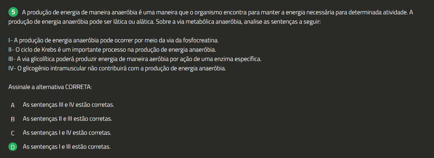 5 A produção de energia de maneira anaeróbia é uma maneira que organismo encontra para manter a energia necessária para determinada atividade. A produção de energia anaeróbia pode ser lática ou alática. Sobre a via metabólica anaeróbia, analise as sentenças a |- A produção de energia anaeróbia pode ocorrer por meio da via da fosfocreatina. II- ciclo de Krebs é um importante processo na produção de energia anaeróbia. III - A via glicolítica poderá produzir energia de maneira aeróbia por ação de uma enzima específica. - glicogênio intramuscular não contribuirá com a produção de energia anaeróbia. Assinale a alternativa CORRETA: A As sentenças III e IV estão corretas. B As sentenças II e III estão corretas. C As sentenças I e IV estão corretas. D As sentenças I e III estão corretas.