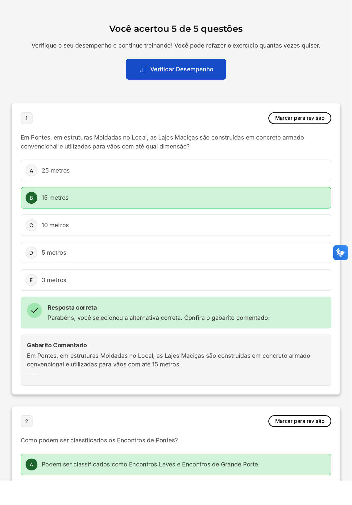 Você acertou 5 de 5 questões Verifique o seu desempenho e continue treinando! Você pode refazer o exercício quantas vezes quiser. Verificar Desempenho A B C D E A B 1 Marcar para revisão Em Pontes, em estruturas Moldadas no Local, as Lajes Maciças são construídas em concreto armado convencional e utilizadas para vãos com até qual dimensão? 25 metros 15 metros 10 metros 5 metros 3 metros Resposta correta Parabéns, você selecionou a alternativa correta. Confira o gabarito comentado! Gabarito Comentado Em Pontes, em estruturas Moldadas no Local, as Lajes Maciças são construídas em concreto armado convencional e utilizadas para vãos com até 15 metros. ----- 2 Marcar para revisão Como podem ser classificados os Encontros de Pontes? Podem ser classificados como Encontros Leves e Encontros de Grande Porte. Podem ser classificados como Encontros Leves e Encontros de Pequeno Porte. C D E A B C D E Podem ser classificados como Encontros Pesados e Encontros de Grande Porte. Podem ser classificados como Encontros Leves e Encontros Médios. Podem ser classificados como Encontros Rigidos e Encontros de Grande Porte. Resposta correta Parabéns, você selecionou a alternativa correta. Confira o gabarito comentado! Gabarito Comentado Os Encontros de Pontes podem ser classificados como Encontros Leves e Encontros de Grande Porte. Os Encontros de Pontes podem ser classificados como Encontros Leves e Encontros de Grande Porte. Os Encontros Leves são aqueles que não possuem grande peso e são construídos com materiais leves, como madeira e aço. Os Encontros de Grande Porte são aqueles que possuem grande peso e são construídos com materiais pesados, como concreto e ferro. 3 Marcar para revisão Qual o Programa Computacional que calcula de maneira eficiente a Linha de Influência? Autocad Lumion Vectorworks Topograph Ftool Resposta correta Parabéns, você selecionou a alternativa correta. Confira o gabarito comentado! Gabarito Comentado Uma maneira eficiente de calcular a Linha de Influência é com o Programa Computacional Ftool que é um programa para a análise estrutural de pórticos planos. ----- A B C D E A B C D E 4 Marcar para revisão Em Pontes Ferroviárias, como é classificado o Choque Lateral? Como um Fenomêno Excepcional Como um Fenômeno Comum Como um Fenômeno Extra Como um Fenômeno Singular Como um Fenômeno Catastrófico Resposta correta Parabéns, você selecionou a alternativa correta. Confira o gabarito comentado! Gabarito Comentado No caso de Pontes Ferroviárias, é um fenômeno comum onde há uma Força Normal que é aplicada na altura do topo do trilho. ----- 5 Marcar para revisão As solicitações atuantes nos elementos estruturais são classificadas quanto a qual aspecto na Mesoestrutura? Incidencia Dimensão Volume Direção de Atuação Sobrecarga Resposta correta Parabéns, você selecionou a alternativa correta. Confira o gabarito comentado! Gabarito Comentado Na Mesoestrutura, as solicitações atuantes nos elementos estruturais são classificadas quanto a direção de atuação, sendo em verticais e horizontais. -----