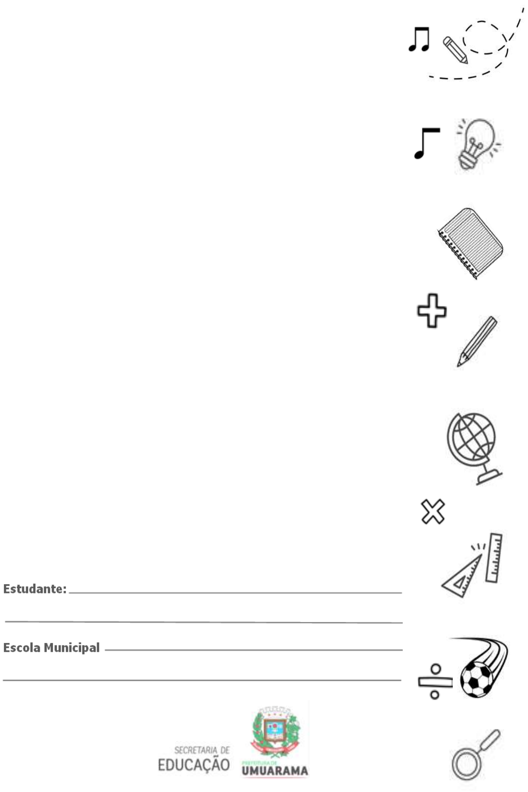 Caderno de Atividades 5º ANO Ciências, Geografia, Língua Portuguesa e Matemática 2º Semestre Data: ____/_____/_______ 1. Leia a tirinha em quadrinhos a seguir. Imagem disponível em: https://brainly.com.br/tarefa/25869976 Assinale a alternativa correta com um (X) a) O que Bidu observa no primeiro quadrinho? (A) A grama. (B) O cubo de gelo. (C) O Sol. (D) A formiga. b) O que aconteceu com o cubo de gelo, no segundo quadrinho? (A) Evaporou. (B) Congelou. (C) Derreteu. (D) Secou. c) E no terceiro quadrinho, o que aconteceu com água? (A) Evaporou. (B) Congelou. (C) Derreteu. (D) Secou. d) Na tirinha, o autor retrata (A) a personalidade do Bidu. (B) os estados físicos da água. (C) os problemas da água. (D) o passeio de Bidu. 2. O texto a seguir apresenta um problema que está causando impactos no meio ambiente. a) Em que estado físico se encontra a água que se forma as geleiras? ( A ) Líquido. ( B ) Gasoso. ( C ) Sólido. ( D ) Icebergs. CIÊNCIAS [...] o desprendimento de icebergs de geleiras da Antártica é comum, mas tem sido mais frequente nos últimos anos. Cientistas indicam que esse fato pode estar associado a mudanças climáticas. Isso pode gerar muitos prejuízos aos diversos ambientes na Terra, além de afetar diversos animais, como os ursos-polares. PESSÔA, Karina; FAVALLI, Leonel. Novo Pitanguá. Ciências. Ed. Moderna. p.107 02 https://brainly.com.br/tarefa/25869976 b) O problema do derretimento de geleiras está associado a (A) evaporação dos rios. (B) pressão das montanhas. (C) solidificação da água. (D) alteração de temperatura do planeta. 3. Observe os processos que ocorrem quando há mudança de temperatura causada pelo aquecimento ou resfriamento da água. Imagem disponível em: https://www.if.ufrj.br/~marta/minicurso-ufrgs/versao-html-abrir-index/agua/leitura.htm De acordo com a ilustração, assinale a alternativa correta. a) Que nome recebe a mudança de estado físico que ocorre com o derretimento das geleiras? ( A ) Solidificação. ( B ) Fusão. ( C ) Evaporação. ( D ) Condensação. b) A neblina ocorre quando vapor de água existente na atmosfera, próximo ao solo, transforma- se em minúsculas gotículas de água, que ficam suspensas no ar. O fenômeno de mudança de estado físico que ocorre nessa situação é a ( A ) solidificação. ( B ) fusão. ( C ) evaporação. ( D ) condensação. c) A chuva de pedra ou granizo é constituída por pedaços de gelo provenientes de nuvens onde houve ___________________________ das gotículas de água, em razão da temperatura extremamente baixa. ( A ) solidificação. ( B ) fusão. ( C ) evaporação. ( D ) condensação. 4. No ciclo hidrológico, a água do nosso planeta movimenta-se passando de um estado físico para outro. São eles (A) evaporação, peneiração, precipitação, catação e infiltração. (B) evaporação, condensação, precipitação, decantação e infiltração. (C) evaporação, condensação, aquecimento, peneiração e infiltração. (D) evaporação, transpiração, condensação, precipitação e infiltração. 03 https://www.if.ufrj.br/~marta/minicurso-ufrgs/versao-html-abrir-index/agua/leitura.htm Data: ____/_____/_________ 1. Para facilitar o estudo do corpo humano, costuma-se organizá-lo em diferentes níveis estruturais. Complete os nomes das estruturas do corpo humano com as palavras em destaque. Imagem disponível em: https://www.domfeliciano.rs.gov.br/arquivos/ciencias_6_quinzena_-_t61_22090825.pdf 2. Agora complete as frases com as palavras que utilizou na atividade acima. a) As _______________________são unidades básicas que constituem os seres vivos. b) Os _______________________ são formados por um conjunto de células semelhantes que, juntas, realizam determinadas funções, como por exemplo, revestir a superfície do corpo. c) Os ________________________ são estruturas formadas por diferentes tecidos. No corpo humano, existem diversos órgãos e cada um deles desempenha uma ou mais funções específicas no corpo. d) O conjunto de órgãos que trabalham juntos para realizar determinadas funções forma os ____________________. e) O conjunto de sistemas forma um ________________________, nesse caso, o corpo humano. 3. Observe na imagem abaixo a unidade formadora dos seres vivos. Essa unidade formadora é conhecida como A) órgão. B) molécula. C) célula. D) átomo. CIÊNCIAS tecido célula órgão organismo sistema 04 Data: ___/_____/_________ 1. Os sistemas do corpo humano atuam conjuntamente para desempenhar suas funções. O sistema digestório fornece nutrientes e o sistema respiratório fornece oxigênio. Os nutrientes e o oxigênio são, então, transportados para todas as células do corpo pelo sistema cardiovascular. Finalmente, o sistema excretor realiza a eliminação das substâncias não utilizadas pelo corpo. Essa atuação conjunta desses quatro sistemas é responsável pela (A) defesa do organismo. (B) movimentação do organismo. (C) nutrição do organismo. (D) regulação do organismo. 2. Observe a ilustração do Sistema Digestório. Imagem disponível em: https://www.ahoradecolorir.com.br/2018/02/sistema-digestorio-para-o-4-ano-com.html a) Complete o texto com os órgãos do sistema digestório. A digestão se inicia quando colocamos o alimento na _______________. A produção de saliva é estimulada, e os dentes e a língua trabalham para triturá-lo e umedecê-lo. Após este momento, ele é engolido, passando pela ________________ e pelo ________________. Por meio de contração dos músculos do esôfago, o alimento chega ao __________________, em forma de bolo alimentar. Ele se junta ao suco gástrico, que é um líquido, e auxilia na digestão dos alimentos. Depois disso, o bolo alimentar passa a se chamar quimo. Depois do estômago, o quimo vai para o __________________________. Lá, ele é misturado ao suco pancreático (feito no pâncreas), à bile (vinda do fígado). Após a digestão, os alimentos, já transformados em nut