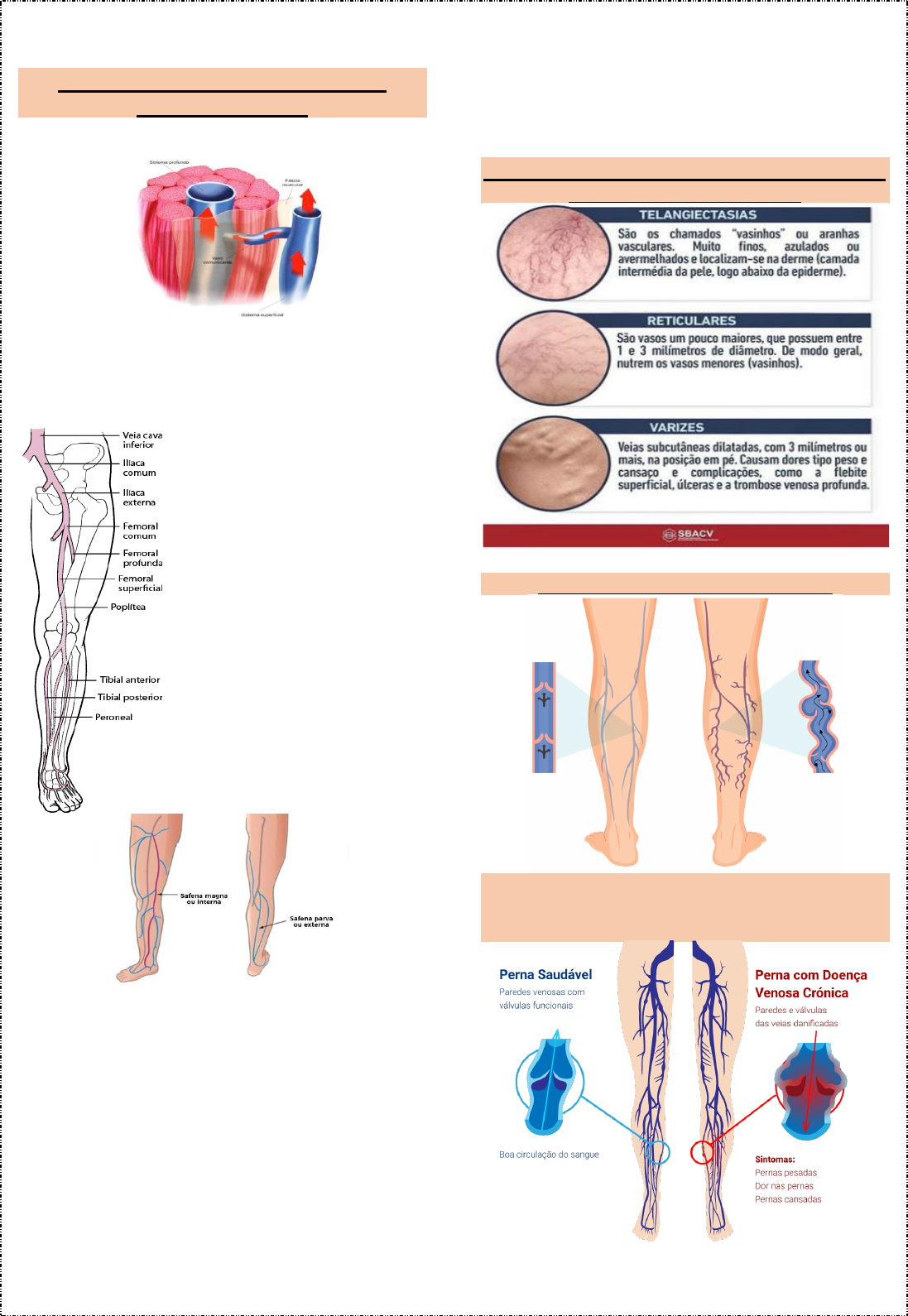 Insuficiência Venosa Crônica Revisando: Anatomia sistema venoso de membros inferiores: ->Subdividido: Profundo x Superficial Profundo: Femoral comum; Femoral profunda; Poplítea; Tibial Posterior e Tibial Anterior → encontram-se abaixo da fáscia muscular Superficial: Safena Magna; Safena Parva →encontram-se encima da fascia muscular, adentram o tecido adiposo e se comunicam com as veias do sistema venoso profundo dos MMII -Safena Parva: lateral e desenboca na veia poplítea -Safena Magna: medial e desenboca na veia femoral comum # Veias tributárias = ramos da safena, prestam tributo/sangue a elas # Veias Perfurantes/ comunicantes: Perfuram a fáscia muscular, são responsáveis por ligar SVP ao SVS # A drenagem é feita no sentido distal para proximal e de superficial a profundo (pelas veias perfuro-comunicantes) # 80% do sangue venoso dos MMII é drenado pelas veias do sistema venoso profundo, e 20% pelo sistema venoso superficial ## A principal veia de drenagem do SVP é a veia poplítea e a veia safena magna é a principal do SVS ## A contração dos músculos gastrocnêmios, da panturrilha, possibilitam melhor retorno venoso VEIAS VARICOSAS X TELANGIECTASIAS X VEIAS RETICULARES VARIZES = VEIAS VARICOSAS VEIAS VARICOSAS → ALTERAÇÕES VASCULARES (REFLUXO VENOSO, HIPERTENSÃO VENOSA...) = IVC Fisiopatologia → Clínica →SINAIS E SINTOMAS • Dor em tipo “queimação” ou “cansaço” vespertina (piora ao longo do dia) • Edema vespertino o Outros ▪ Formigamento; ▪ Sensação de peso ou de latejamento ▪ Prurido cutâneo ▪ Pernas inquietas ▪ Cansaço das pernas e fadiga ▪ Alterações de pele: ▪ Úlceras venosas ▪ Dermatoesclerose / dermatofibrose ▪ Hiperpigmentação Insuficiência venosa → refluxo gera compressão nervosa e dor → hipertensão venosa: acúmulo de sangue no leito venoso inferior: depósito de hemossiderina = hiperpigmentação → pele frágil→ lesões ulceradas *Não é que as úlceras são por falta de nutriente. As veias são do sistema de drenagem e não de nutrição SINAIS DE ALARME NA HISTÓRIA CLÍNICA: • Presença de tromboflebite ou TVP anterior; • Diagnóstico de trombofilia • Traumatismo prévio • Sintomas de síndrome da congestão pélvica • Histórico familiar de varizes • Cirurgias ou procedimentos para tratar varizes prévias Classificação para estratificação de insuficiência venosa crônica: CEAP C- Clínica E - Etiologia A - Anatomia P - Patologia #C4a: hiperpigmentação = dermatite ocre / C4b: lipodermatoesclerose = pele endurecida, fibrótica # A mais importante é a classificação clínica! DIAGNÓSTICO: Clínico! Exame complementar de escolha: Dupplex venoso • Indicação: Avaliação pré-operatória TRATAMENTO ➔ Tratamento clínico: 1. Orientações gerais; -Controle do peso, atividade física, elevação dos membros inferiores, trabalho da musculatura da panturrilha, é o que mais melhora o sintomas dos pacientes. 2. Terapia compressiva -Meias de compressão: • Suave Compressão – Até 23mmHg Prevenção em pacientes em IVC de caráter inicial (C0 à C2) e com fatores de risco. • Média Compressão – 20-30mmHg Previne evolução” e melhora dos sintomas em pacientes com edema (C3) • Alta Compressão – 30-40mmHg Pacientes em níveis IVC elevada (C4 à C5) e para prevenção de TVP #Terapias compressivas têm melhores utilidades em pacientes que permanecem horas sentados ##Contra-indicação: LESÃO ARTERIAL 3. Medicamentos vasoativos (flebotrópicos ou flebotônicos). São medicações que vão atuar nas alterações que temos na parede venosa e o extravasamento de líquido e de proteínas para interstício e estimulam a drenagem linfática. Melhoram o tônus e o processo inflamatório das veias. Diosmina/Hesperidina 1000mg ou 2x 500mg - Tomar após o café da manhã ou almoço (Pois é o tempo que o paciente está acordado e em pé) ➔ Tratamentos invasivos: • Escleroterapia; - Consiste na aplicação de material (medicação ou espuma) que leva a esclerose (“destruição”) daquele vaso. O material provoca irritação no endotélio, inflamação, com posterior formação de tecido cicatricial que leva a fibrose e oclusão do vaso, depois a medicação é absorvida. • Cirurgia convencional; -Consiste em retirar essas veias que estão doentes. Por exemplo, se for tirar a safena, passa uma guia e depois puxo, extirpa a safena e a outras tributárias, depois faz um furinho na pele e pesca/ tira essas veias varicosas que permaneceram. • Termoablação endovenosa com laser ou radiofrequência. -Tratamento mais moderno, mais seguros (trata de dentro para fora) -Você vai por dentro da veia, com a cânula e vai queimando o endotélio da veia, e depois vai gerar um processo cicatricial e vai fechar a luz desse vaso. TROMBOSE VENOSA PROFUNDA (TVP): O que é TVP? Formação de trombos dentro de veias profundas (abaixo da fáscia muscular, dentro do músculo) com obstrução parcial ou oclusão, sendo mais comum nos membros inferiores – em 80 a 95% dos casos. Fisiopatologia: Tríade de Virchow: #A lesão endotelial é mais comum na trombose arterial. Na trombose venosa é mais comum principalmente estase e coagulopatia, mas se teve lesão endotelial venosa também pode formar trombo. #70% das TVPs ocorrem por complicação de outra doença e 10% são idiopáticas. A maioria ocorre em MMII #50% ou mais dos casos com TVP confirmada não apresentam sinais clínicos (Pex pessoas com duplicidade de veias poplíteas) #30 a 50% dos casos que apresentam sinais ou sintomas sugestivos de TVP, esta não é confirmada, sendo decorrentes de outras afecções. Fatores de Risco: • Idade avançada; • TVP prévia; • Câncer; - o câncer deixa paciente com maior capacidade trombogenica, altera a cascata de coagulação. • Procedimentos cirúrgicos; • Imobilização; • Uso de estrogênio e progesterona; • Gravidez; (3 coisas: aumento da volemia, alteração hormonal, comp