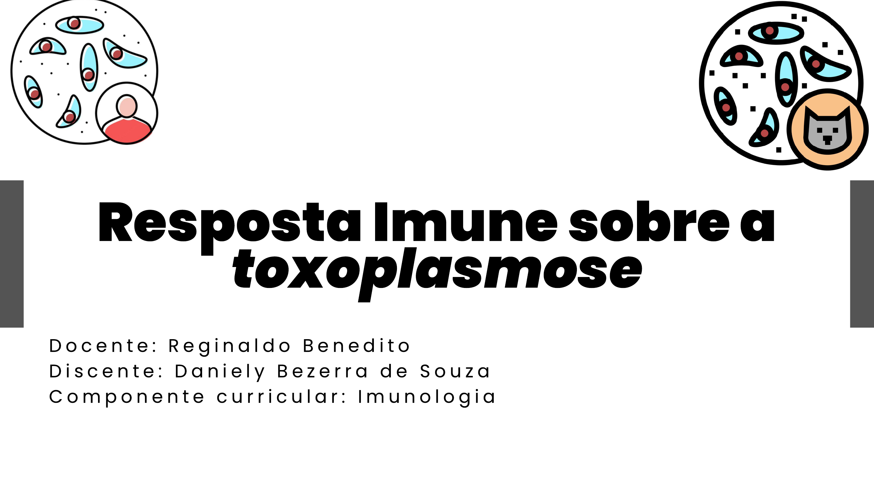 Resposta Imune sobre a toxoplasmose D o c e n t e : R e g i n a l d o B e n e d i t o D i s c e n t e : D a n i e l y B e z e r r a d e S o u z a C ompo n e n t e c u r r i c u l a r : I m u n o l o g i a Toxoplasma gondii é um protozoário intracelular obrigatório que causa toxoplasmose. Possui forma alongada, com organelas especializadas como os micronemas, roptrias e grânulos densos, essenciais para a invasão ativa de células hospedeiras. Ao contrário da fagocitose tradicional, o parasita entra na célula por sua própria ação, formando um vacuólo parasitóforo que evita a fusão com lisossomos, permitindo sua replicação segura no interior celular Introdução Estrutura do Toxoplasmose Reconhecimento do Toxoplasma gondii pelo sistema imune inato T. gondii é um parasita intracelular que invade diversos tipos celulares. Invasão de macrófagos se assemelha à fagocitose, mas o parasita evita ser destruído. Sistema imune reconhece o parasita via receptores Toll- like (TLRs): TLR11 e TLR12: reconhecem a profilina do parasita. TLR3, TLR7 e TLR9: ativados via proteína UNC93B1 do retículo endoplasmático. Essa ativação inicial estimula a resposta imune adaptativa. Papel dos macrófagos e células dendríticas Atuam como células sentinelas e exterminadoras. Participam de ADCC (citotoxicidade celular dependente de anticorpos): Ação potencializada por IgG e IgE específicas. Secretam citocinas inflamatórias: IL-12, TNF-α e IL-1. Ativam células T e NK, promovendo a resposta adaptativa. Células NK e produção de IFN-γ Células NK e sua ativação Morte de alvo opsonizado por células NK. Formação de Cistos e Memória Bradizoítos ficam em cistos (músculo, cérebro) Imunidade celular mantém controle Linfócitos de memória previnem reinfecção Indivíduos imunocompetentes geralmente são assintomáticos Disponível: https://www.msdmanuals.com/pt-br Disponível: https://www.scielo.org Disponível: https://books.scielo.org/id/p2r7v/pdf/souza-9788575415719-08.pdf Referências https://www.scielo.org/