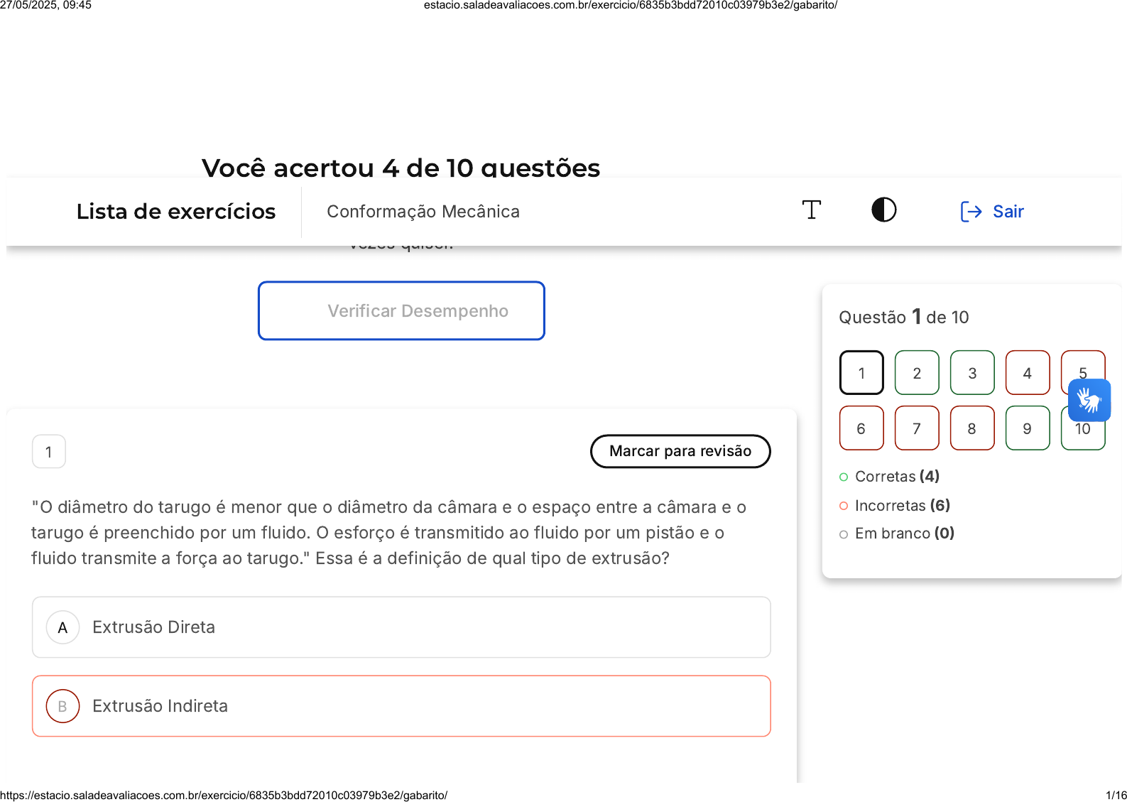 Você acertou 4 de 10 questões Verifique o seu desempenho e continue treinando! Você pode refazer o exercício quantas vezes quiser. Verificar Desempenho A B 1 Marcar para revisão "O diâmetro do tarugo é menor que o diâmetro da câmara e o espaço entre a câmara e o tarugo é preenchido por um fluido. O esforço é transmitido ao fluido por um pistão e o fluido transmite a força ao tarugo." Essa é a definição de qual tipo de extrusão? Extrusão Direta Extrusão Indireta Questão 1 de 10 Corretas (4) Incorretas (6) Em branco (0) 1 2 3 4 5 6 7 8 9 10 Lista de exercícios Conformação Mecânica Sair 27/05/2025, 09:45 estacio.saladeavaliacoes.com.br/exercicio/6835b3bdd72010c03979b3e2/gabarito/ https://estacio.saladeavaliacoes.com.br/exercicio/6835b3bdd72010c03979b3e2/gabarito/ 1/16 C D E Extrusão Lateral Extrusão por Impacto Extrusão Hidrostática Resposta incorreta Opa! A alternativa correta é a letra E. Confira o gabarito comentado! Gabarito Comentado A definição apresentada no enunciado corresponde ao processo de Extrusão Hidrostática. Nesse tipo de extrusão, o tarugo, que é a peça a ser moldada, é colocado em uma câmara cheia de fluido. O pistão, ao ser acionado, exerce pressão sobre o fluido, que por sua vez transmite essa força ao tarugo, moldando-o. A característica principal desse processo é a transmissão de força através do fluido, o que é claramente descrito no enunciado. 2 Marcar para revisão Os processos de fabricação por Conformação Mecânica para a produção de peças metálicas abrangem um grande número de processos que são classificados em função dos 27/05/2025, 09:45 estacio.saladeavaliacoes.com.br/exercicio/6835b3bdd72010c03979b3e2/gabarito/ https://estacio.saladeavaliacoes.com.br/exercicio/6835b3bdd72010c03979b3e2/gabarito/ 2/16 A B C D E tipos de esforços aplicados. Um dos objetivos da Conformação Mecânica é: Fabricar peças complexas utilizando polímeros Promover a união de partes metálicas para produzir uma peça Obter uma tolerância dimensional reduzida por deformação plástica Obter uma melhoria nas propriedades mecânicas do produto em função do encruamento causado pela deformação plástica do material Produzir peças metálicas pela mudança de fase da matéria-prima Resposta correta Parabéns, você selecionou a alternativa correta. Confira o gabarito comentado! Gabarito Comentado A alternativa correta é a D, que afirma que um dos objetivos da Conformação Mecânica é obter uma melhoria nas propriedades mecânicas do produto em função do encruamento causado pela deformação plástica do material. O encruamento é um fenômeno que ocorre quando um material é deformado plasticamente, o que resulta em um aumento de sua resistência e dureza. Portanto, a Conformação Mecânica 27/05/2025, 09:45 estacio.saladeavaliacoes.com.br/exercicio/6835b3bdd72010c03979b3e2/gabarito/ https://estacio.saladeavaliacoes.com.br/exercicio/6835b3bdd72010c03979b3e2/gabarito/ 3/16 A B C busca aproveitar esse fenômeno para melhorar as propriedades mecânicas do produto final. 3 Marcar para revisão Uma empresa de metalurgia está trabalhando com laminação de aço para produzir chapas finas. Para alcançar a espessura desejada, os técnicos percebem que é necessário submeter o aço a múltiplos passes entre os cilindros de laminação. Inicialmente, a chapa tem uma espessura de 10 mm e, após cada passe, a espessura é reduzida em 20%. Se a espessura desejada para a chapa é menor que 5 mm, quantos passes são necessários para alcançar essa espessura? 1 passe. 2 passes. 3 passes. 27/05/2025, 09:45 estacio.saladeavaliacoes.com.br/exercicio/6835b3bdd72010c03979b3e2/gabarito/ https://estacio.saladeavaliacoes.com.br/exercicio/6835b3bdd72010c03979b3e2/gabarito/ 4/16 D E 4 passes. 5 passes. Resposta correta Parabéns, você selecionou a alternativa correta. Confira o gabarito comentado! Gabarito Comentado Para calcular a espessura da chapa após cada passe, podemos usar a seguinte fórmula: Espessura após passe = Espessura atual × (1 − Percentual de redução) 1º passe: 10 mm × (1 − 0,20) = 10 mm × 0,80 = 8 mm 2º passe: 8 mm × (1 − 0,20) = 8 mm × 0,80 = 6,4 mm 3º passe: 6,4 mm × (1 − 0,20) = 6,4 mm × 0,80 = 5,12 mm 4º passe: 5,12 mm × (1 − 0,20) = 5,12 mm × 0,80 = 4,096 mm 4 Marcar para revisão 27/05/2025, 09:45 estacio.saladeavaliacoes.com.br/exercicio/6835b3bdd72010c03979b3e2/gabarito/ https://estacio.saladeavaliacoes.com.br/exercicio/6835b3bdd72010c03979b3e2/gabarito/ 5/16 A B C D E Uma empresa de manufatura foi contratada para produzir componentes metálicos para uma nova linha de produtos eletrônicos. Os projetistas especificaram a necessidade de peças com uma certa profundidade, de modo a acomodar vários componentes internos. Ao analisar as especificações, o engenheiro de produção precisa determinar o processo de manufatura mais adequado. Considerando as informações fornecidas, qual técnica de conformação mecânica seria a mais recomendada para produzir peças com uma dimensão destacada em profundidade? Torneamento. Estampagem. Fresagem. Embutimento. Laminação. Resposta incorreta Opa! A alternativa correta é a letra D. Confira o gabarito comentado! Gabarito Comentado 27/05/2025, 09:45 estacio.saladeavaliacoes.com.br/exercicio/6835b3bdd72010c03979b3e2/gabarito/ https://estacio.saladeavaliacoes.com.br/exercicio/6835b3bdd72010c03979b3e2/gabarito/ 6/16 A B C A estampagem rasa, muitas vezes chamada apenas de estampagem, é usada principalmente para criar formas superficiais em peças, enquanto o embutimento (estampagem profunda) é usado para produzir peças com uma dimensão destacada em profundidade. Considerando a necessidade de peças com uma certa profundidade para acomodar componentes internos, a técnica mais adequada seria o embutimento (ou estampagem profunda). 5 Marcar para revisão Uma empresa de manufatura foi contratada para produzir componentes metálicos para uma nova 